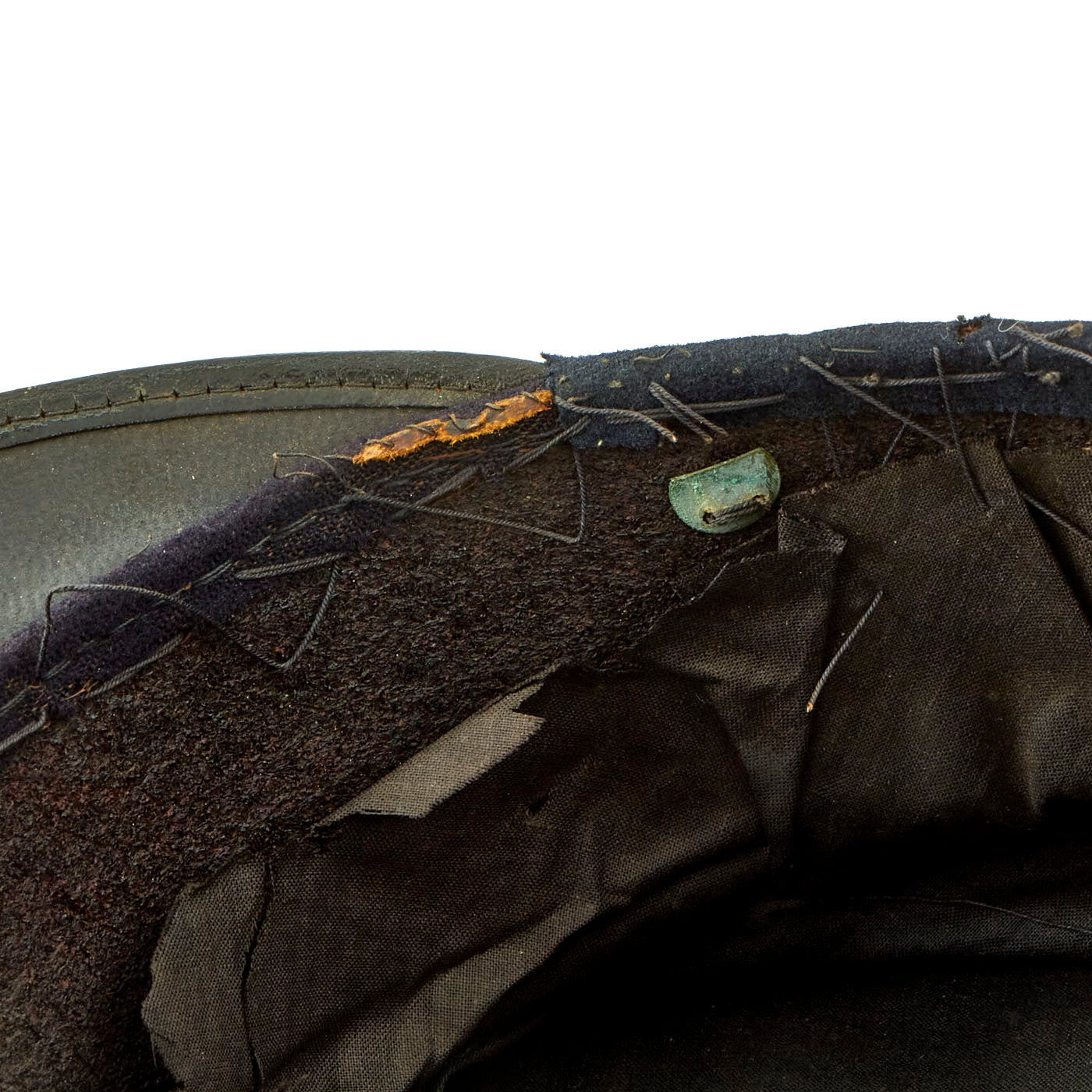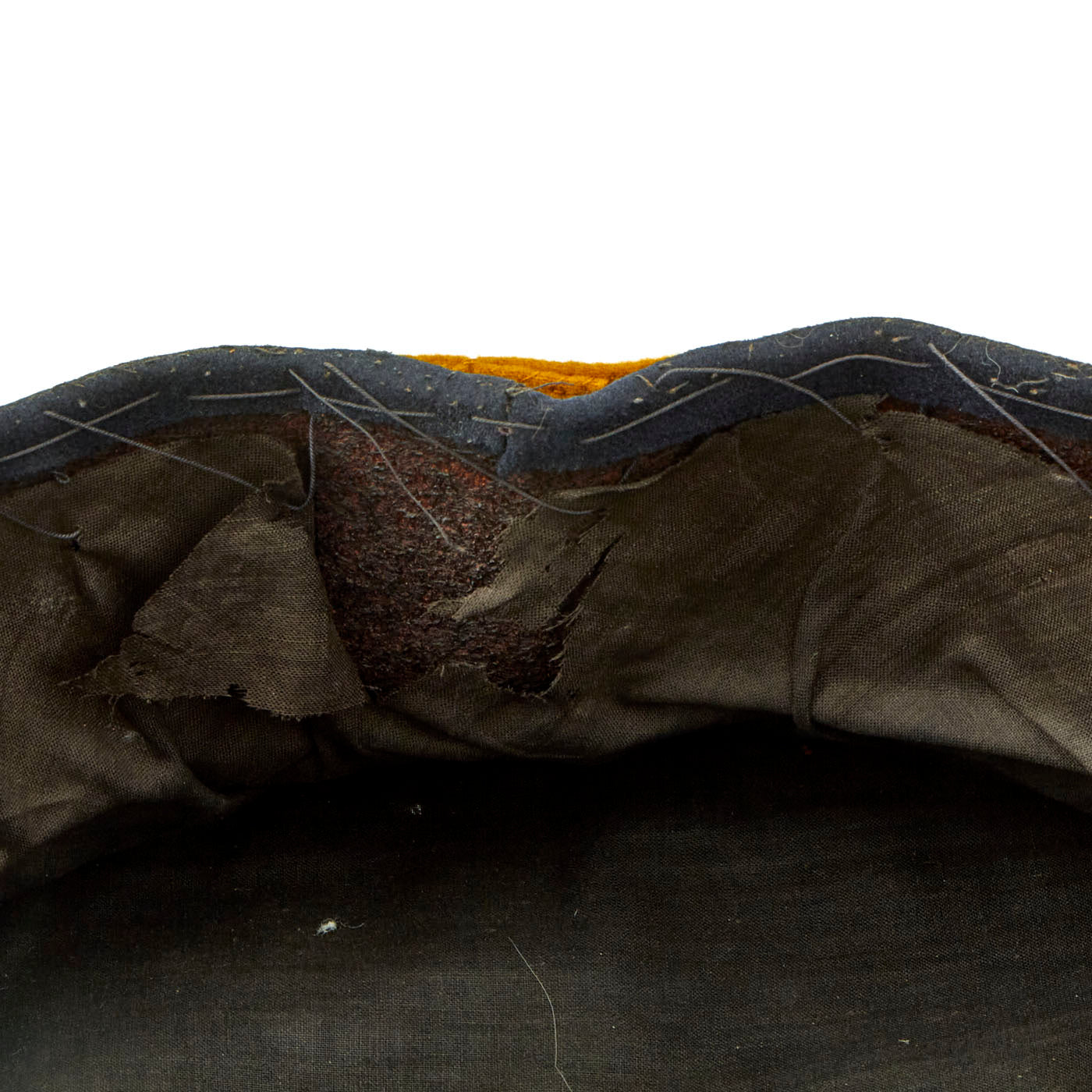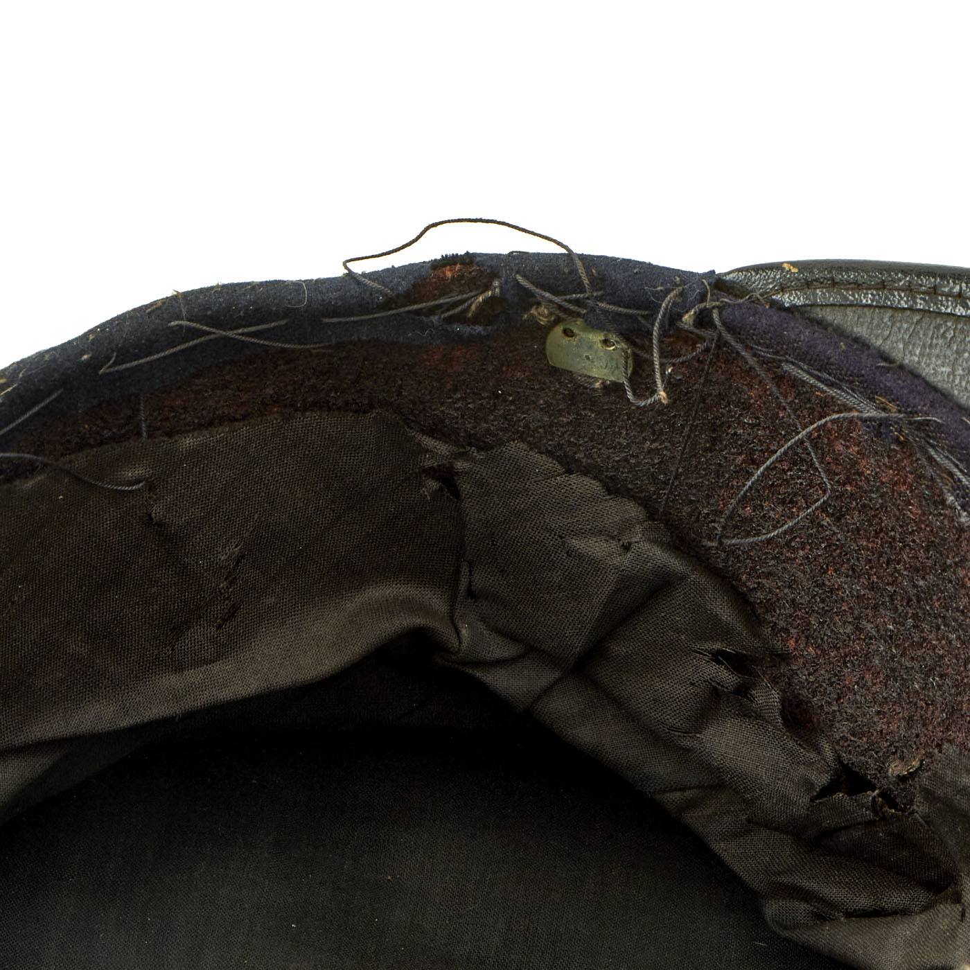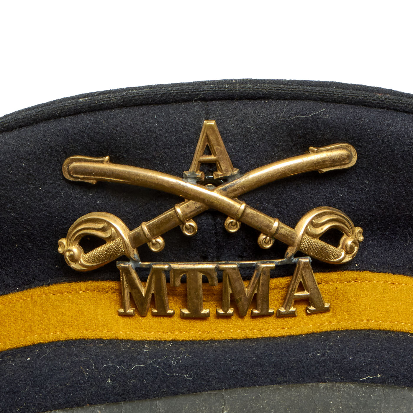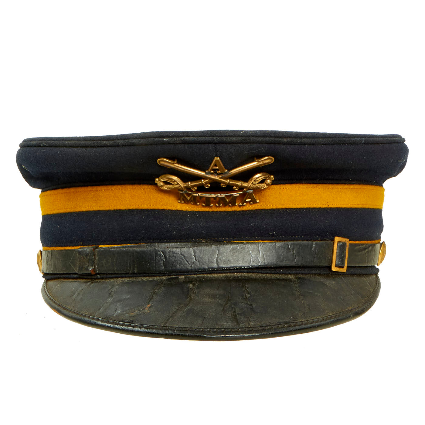 The interior of the cap does not have a sweatband, so we believe it probably deteriorated long ago, and was removed. The front of the cap has a "A" Company, “MTMA” Cavalry insignia, which is still in great shape. The cap shows evident mothing, except under the chin strap, where holes have been made in one of the blue bands. The color is much less faded under the chin strap, so this cap was on display for many years.