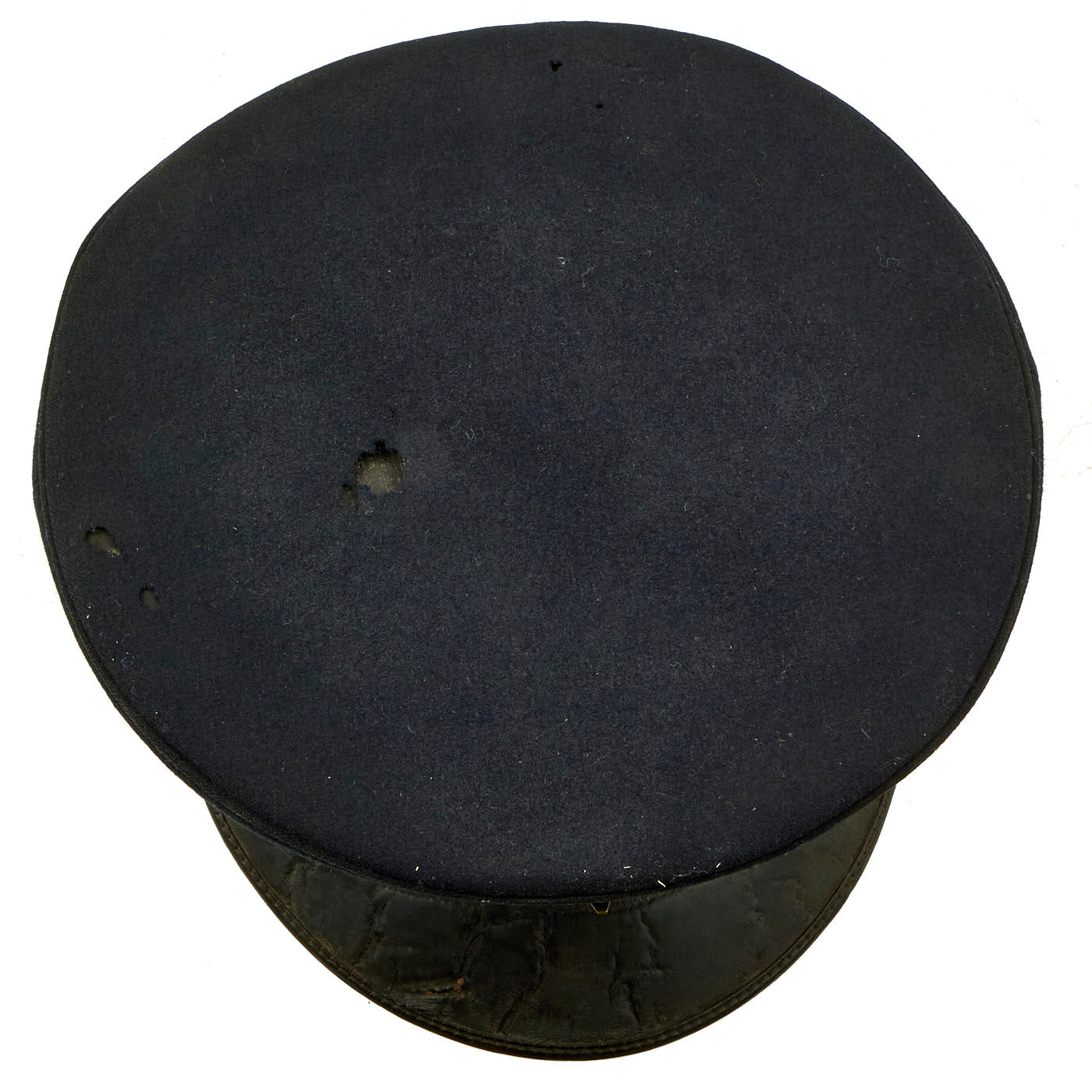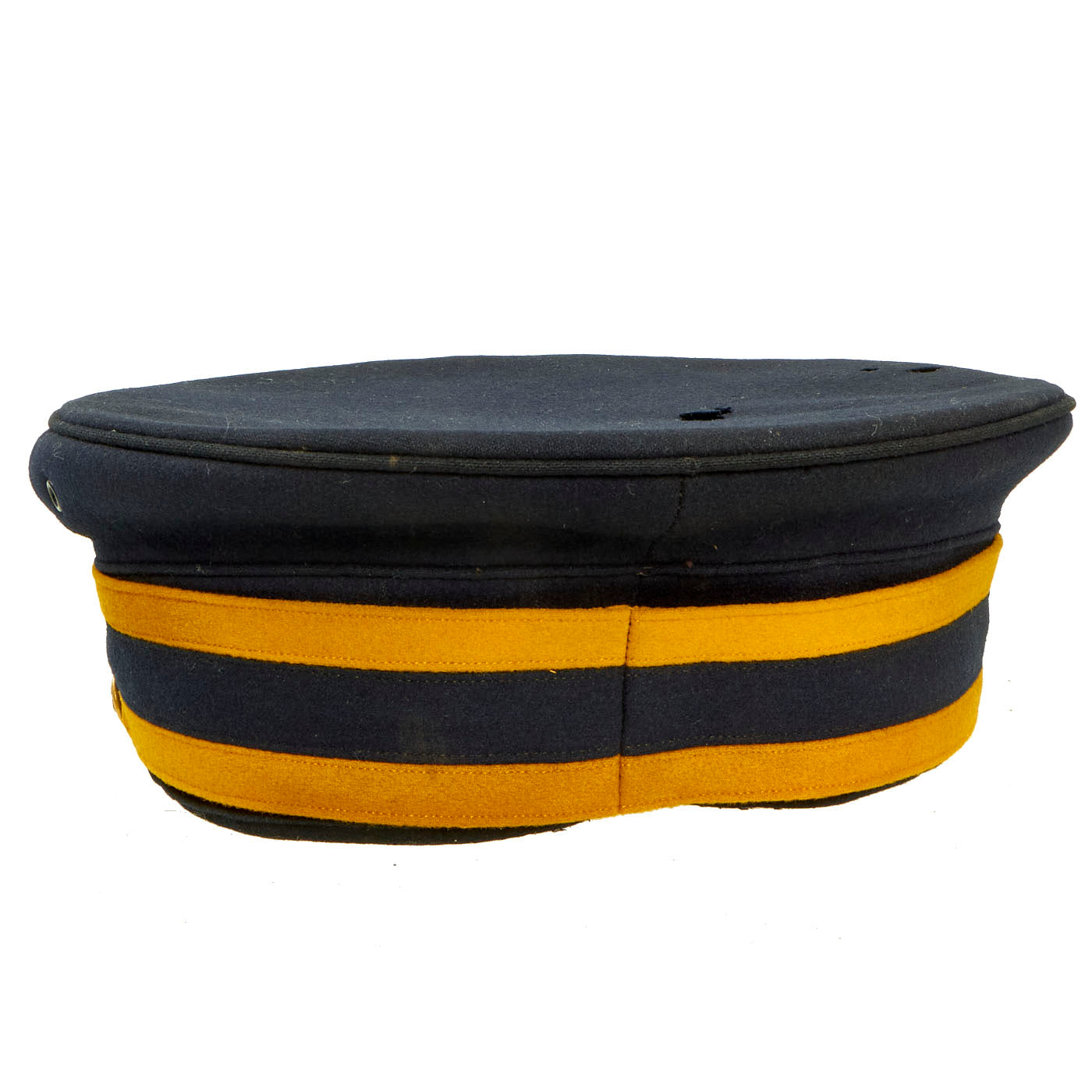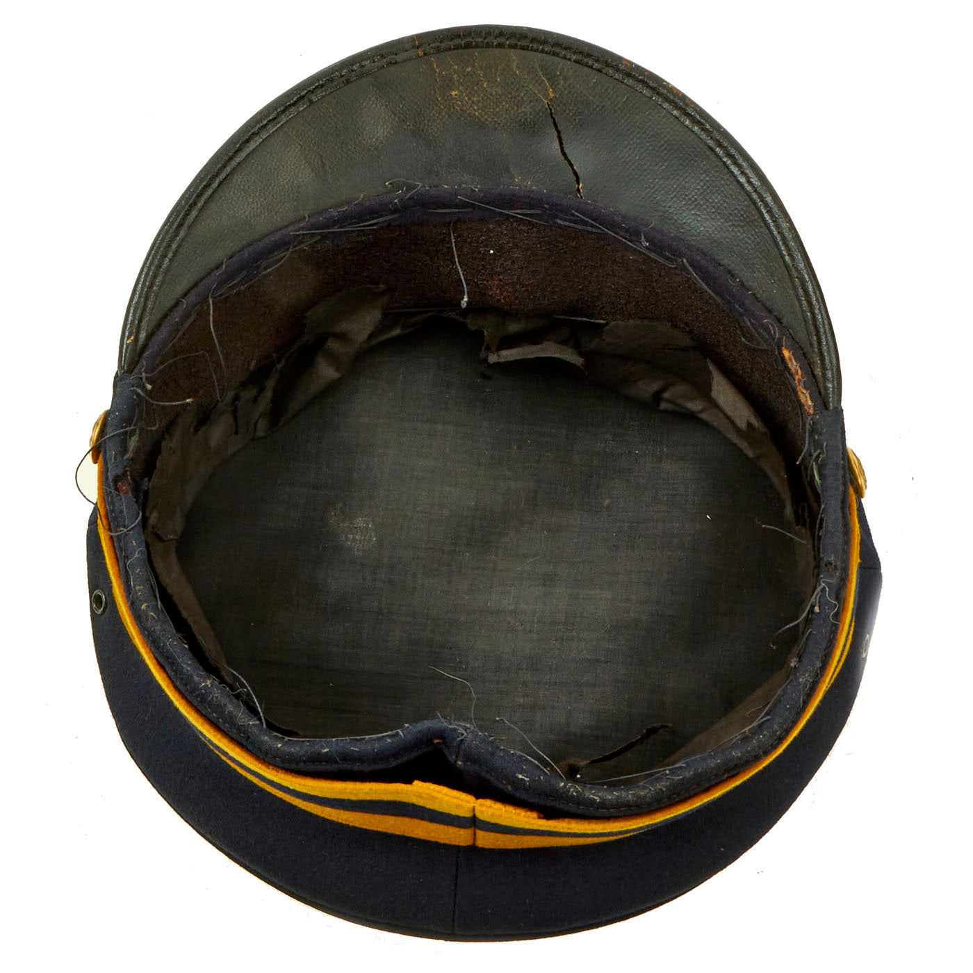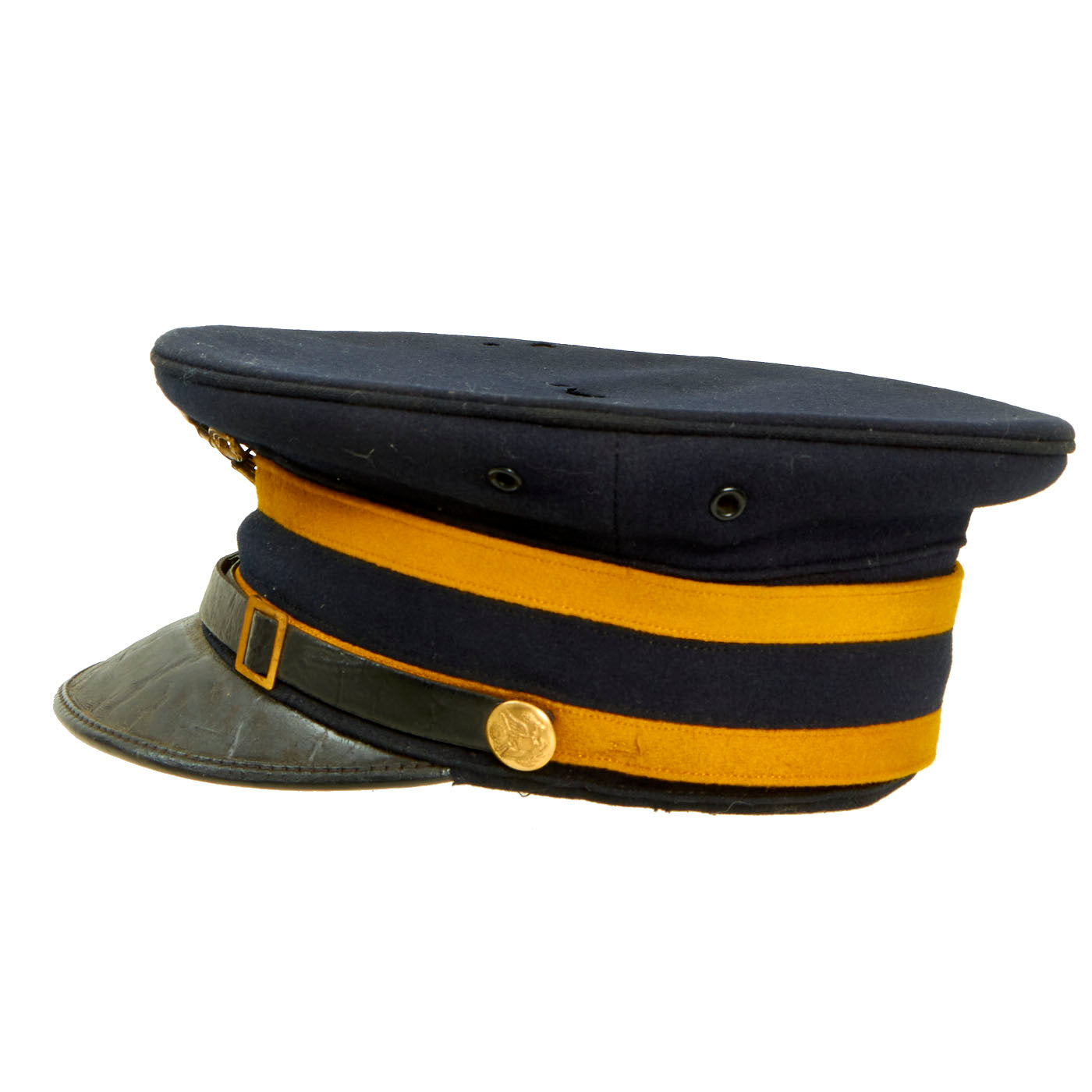 Original Item: Only One Available. This is a very nice regulation M1902 enlisted peaked cap, which replaced the earlier M1895 pattern. This was the U.S. Army's second example of a visor cap after leaving the traditional kepi design. Like the M1895, it is made of dark blue wool, and has an enameled leather visor bound with patent leather, lined on the underside with lacquered paper. It has two yellow bands going around the cap, and a patent leather shin strap retained by gilded brass federal regulation U.S. Army eagle buttons.