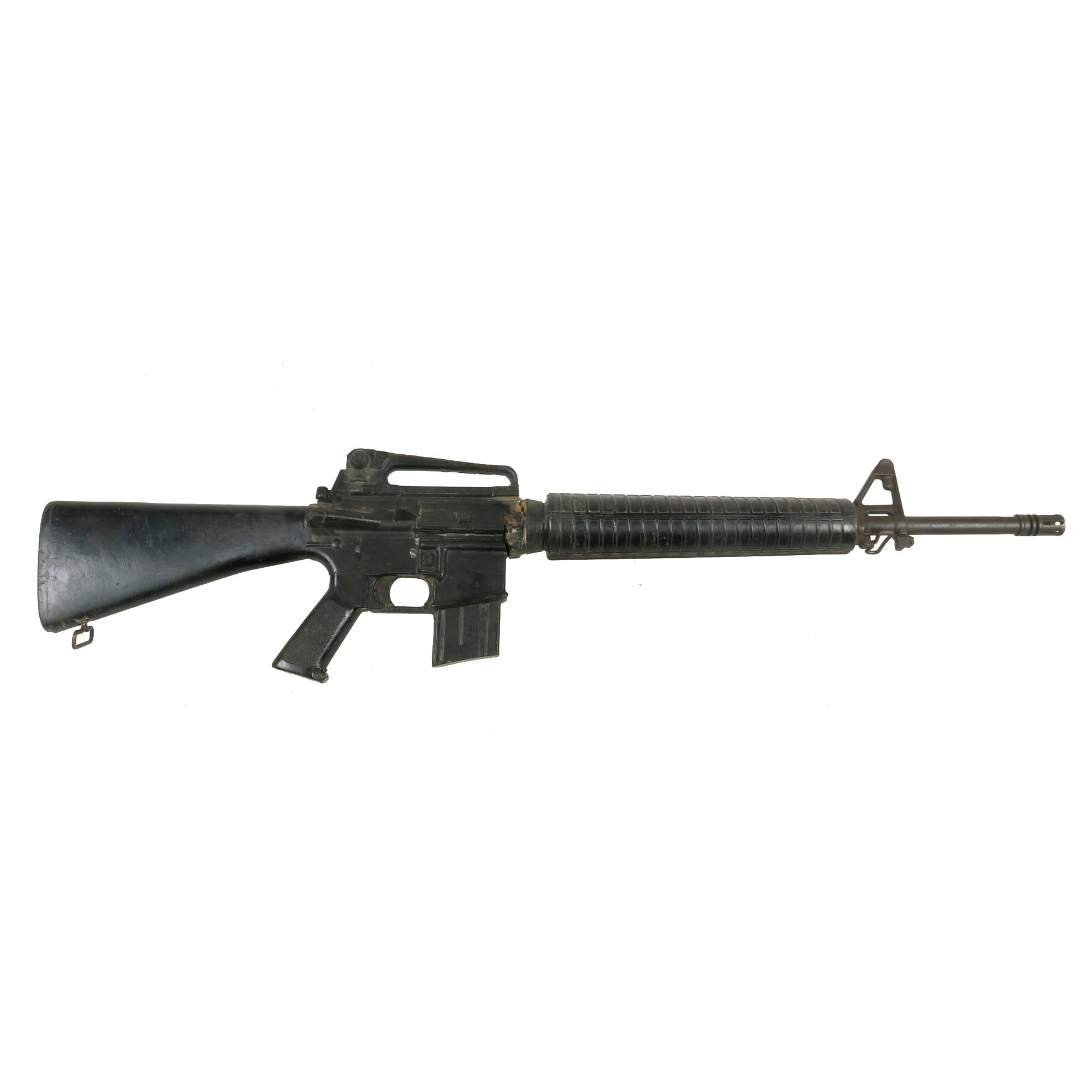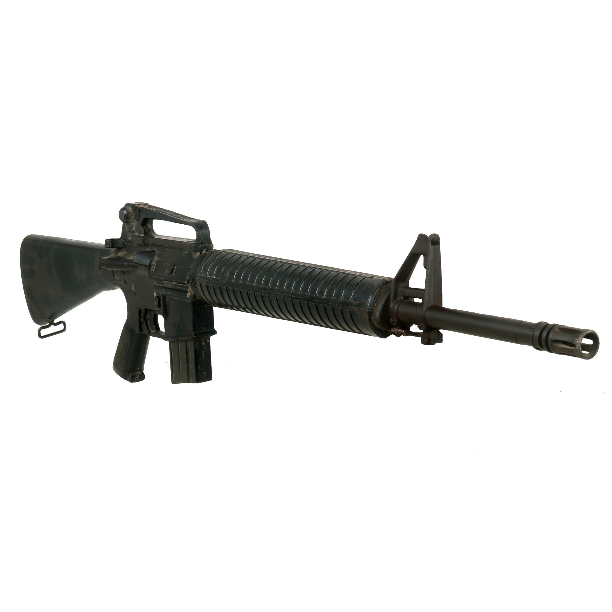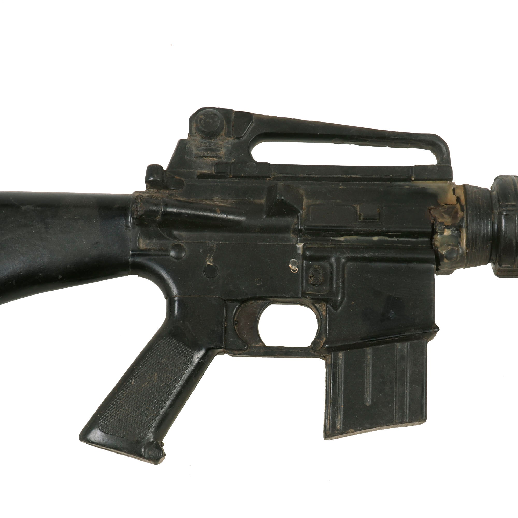 Original Item: Only One Available. Colt M16A1 Military issue non-functional RUBBER DUCK training and parade rifle. Features genuine M16 components, held together with resin construction. This early example has more original components than most, and looks to have an original metal barrel, muzzle brake, front sight, front sling swivel, and even an aluminum upper receiver with rear sight. The fore grip / heat shield also looks to be an original component. These would later all be replaced with rubber / resin. This example has some extensive damage, as the barrel appears to have broken off from the receiver and was hastily glued back together.
