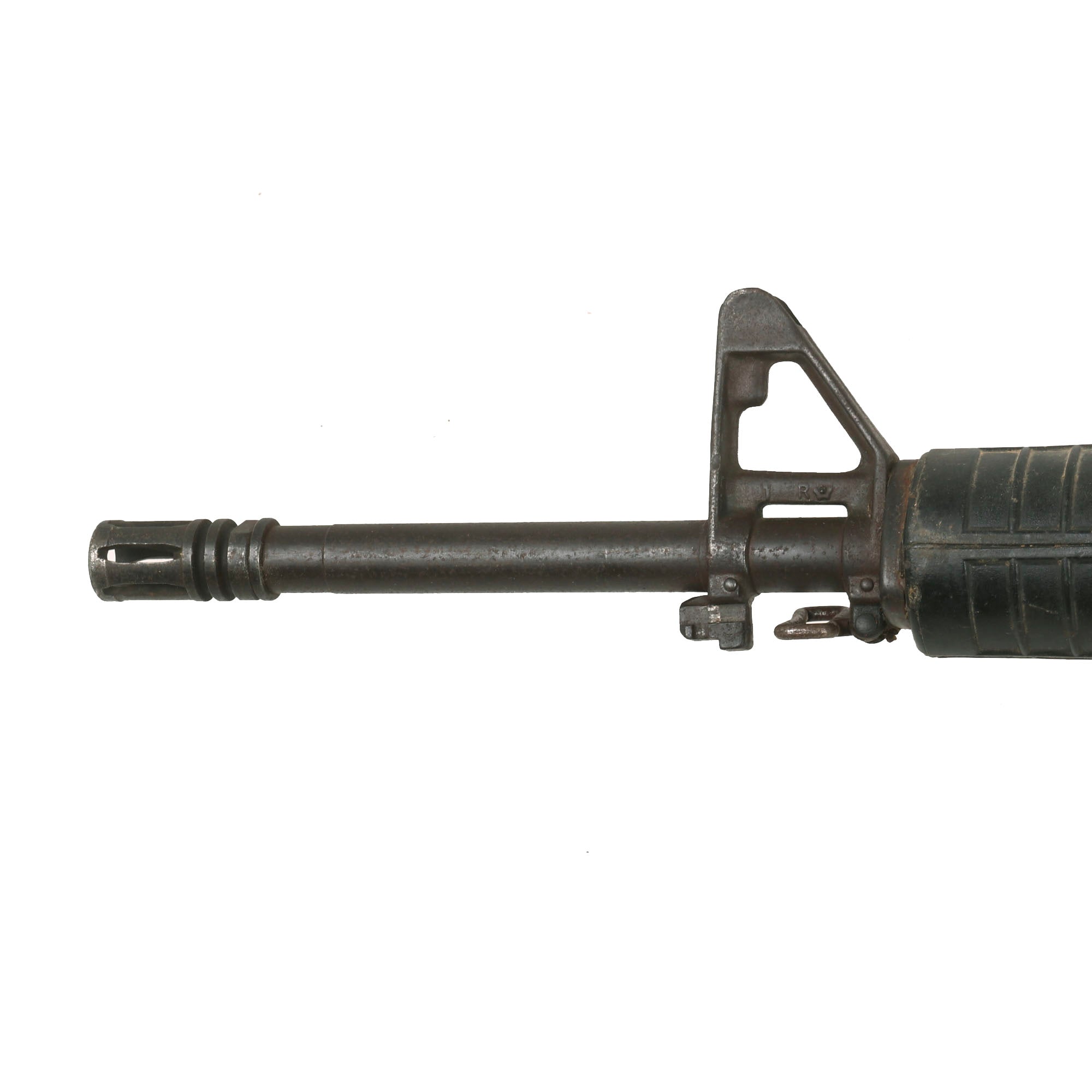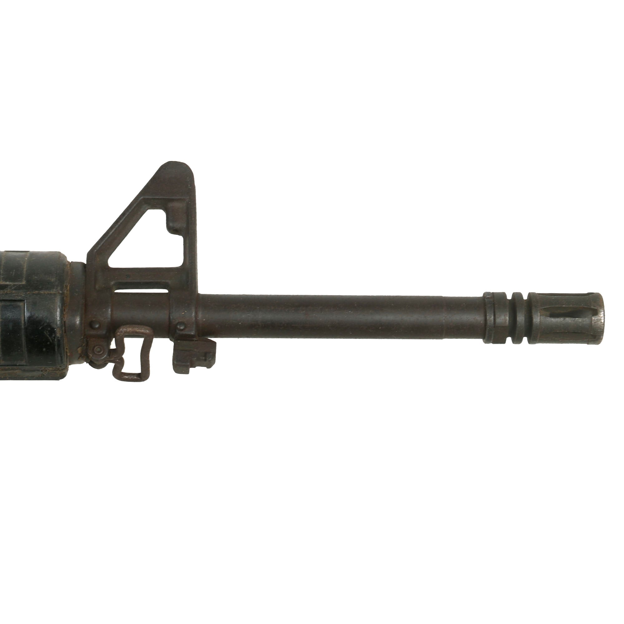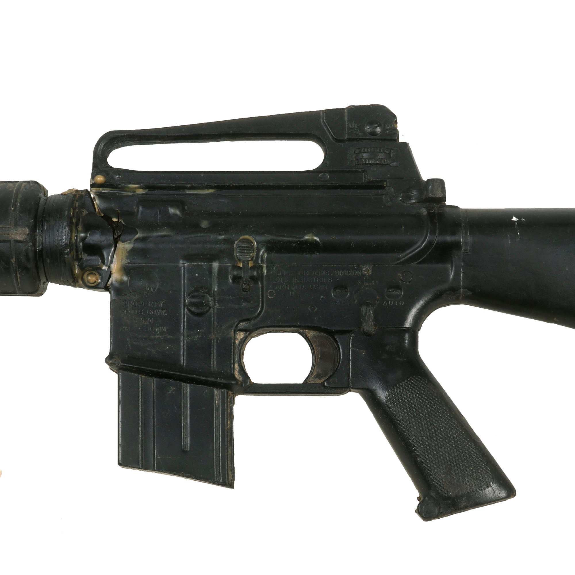 Original Item: Only One Available. Colt M16A1 Military issue non-functional RUBBER DUCK training and parade rifle. Features genuine M16 components, held together with resin construction. This early example has more original components than most, and looks to have an original metal barrel, muzzle brake, front sight, front sling swivel, and even an aluminum upper receiver with rear sight. The fore grip / heat shield also looks to be an original component. These would later all be replaced with rubber / resin. This example has some extensive damage, as the barrel appears to have broken off from the receiver and was hastily glued back together.