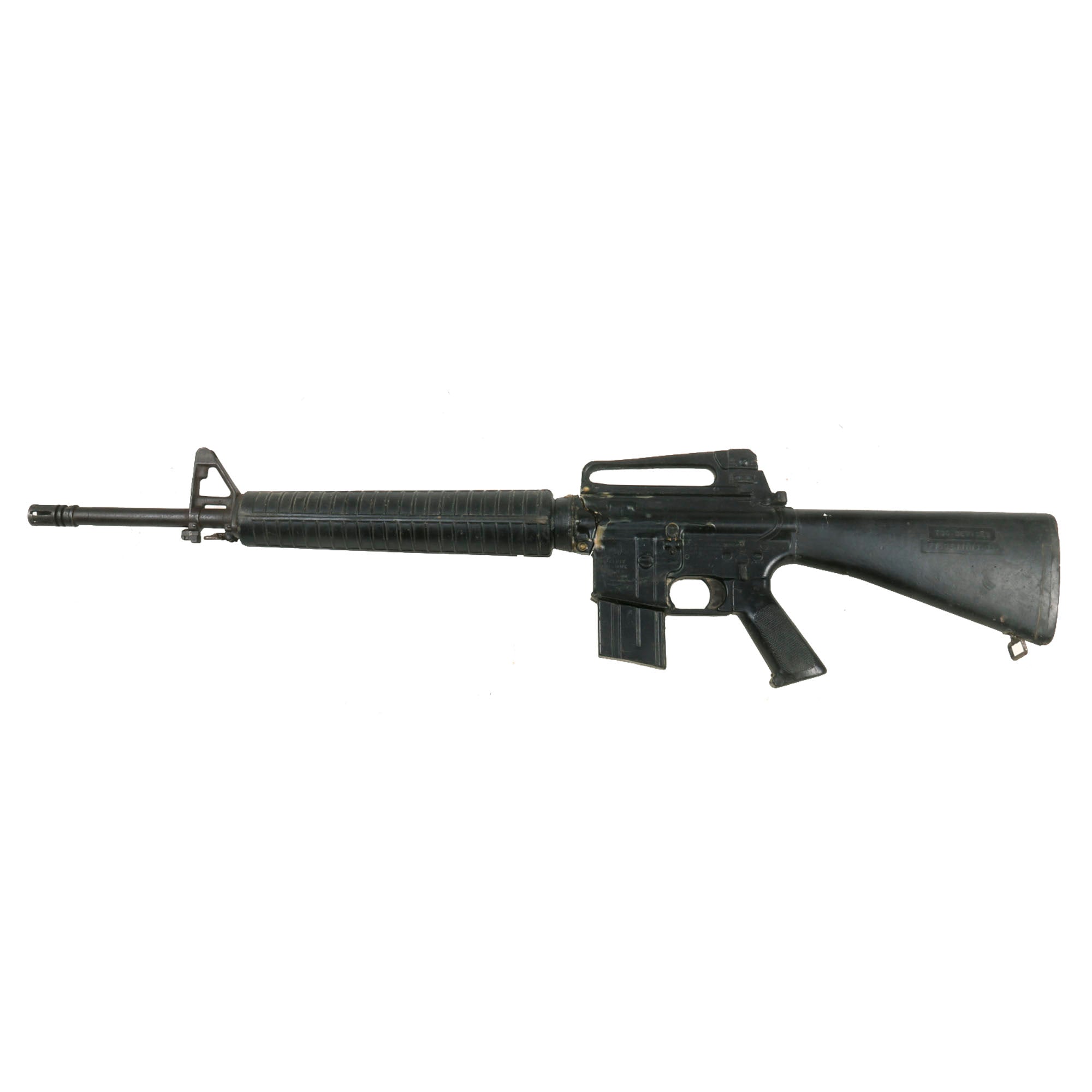 The military calls these rifles Rubber Ducks. This is an actual military issue trainer designed to be the correct weight and size of an M16A1. They are made from decommissioned M16/A1/A2 parts, which were then used during the molding process. Markings on these varied, and many had markings removed or changed while in service. This example is marked on the magazine well: