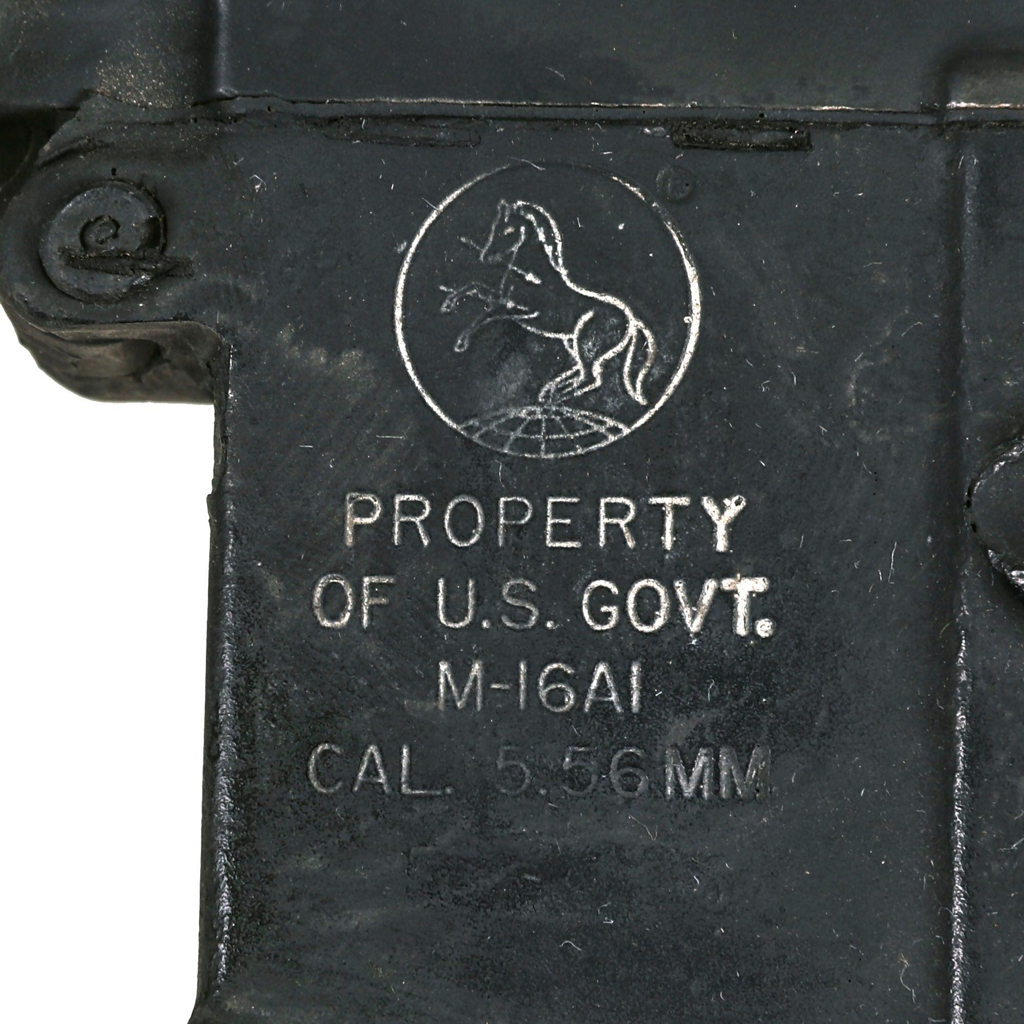 The military calls these rifles Rubber Ducks. This is an actual military issue trainer designed to be the correct weight and size of an M16A1. They are made from decommissioned M16/A1/A2 parts, which were then used during the molding process. Markings on these varied, and many had markings removed or changed while in service. This example is marked on the magazine well: