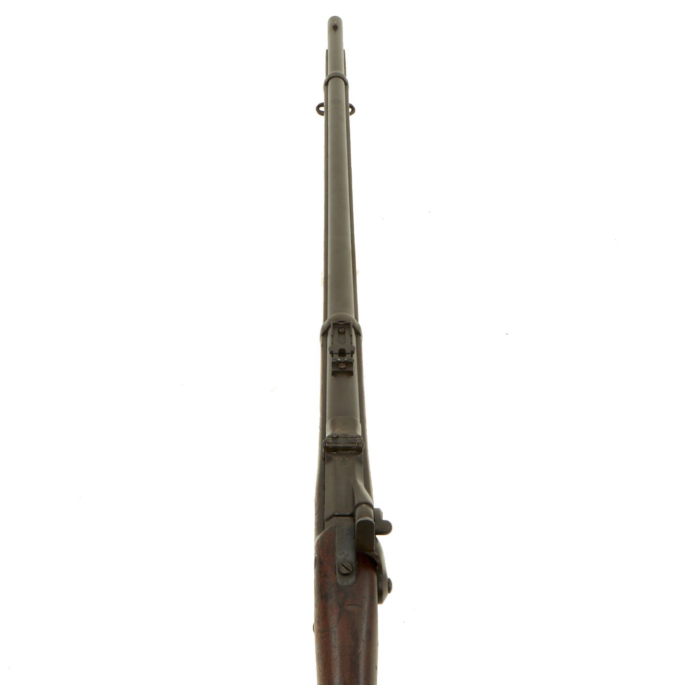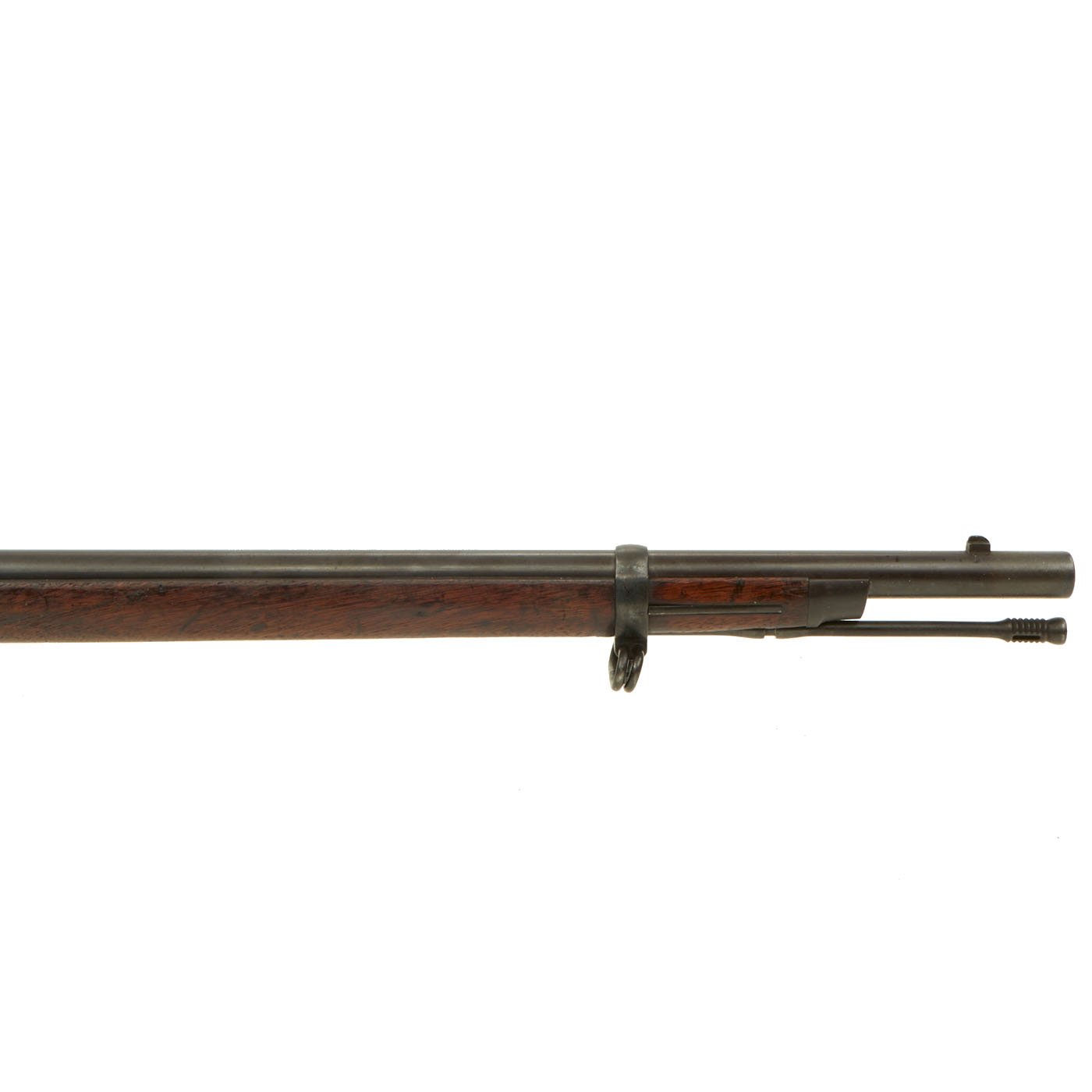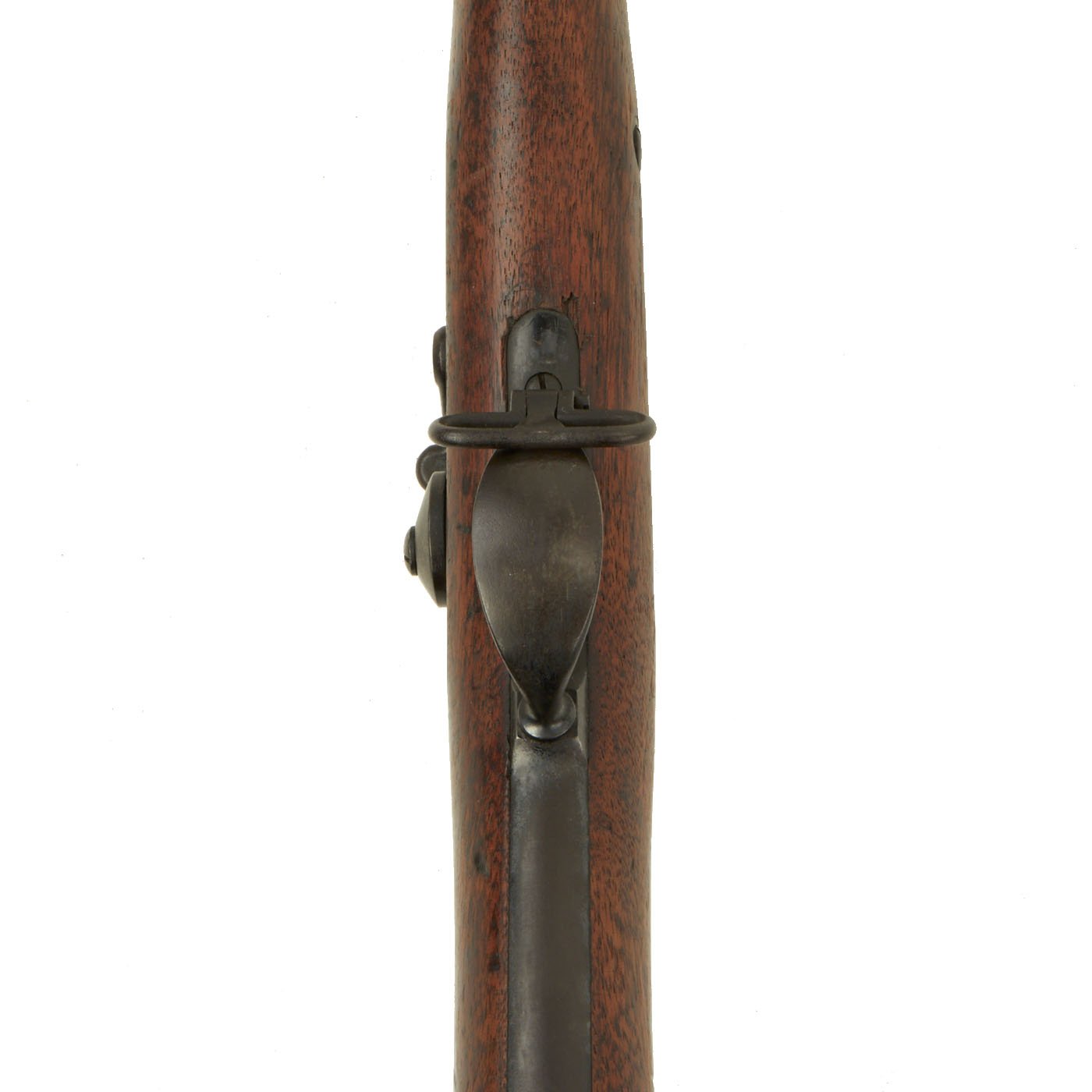 The bore is in excellent lightly used condition, with clear lands and grooves, and a mostly bright finish. There is just a bit of light haze in areas. The butt plate is marked U.S. and both barrel bands are U marked. Metal finish is a nice lightly worn gray color, with very minor peppering in places. Center fire breechloader, .45 cal., two bands, two sling swivels with stacking swivel, standard sliding sight, and standard early pattern ramrod.