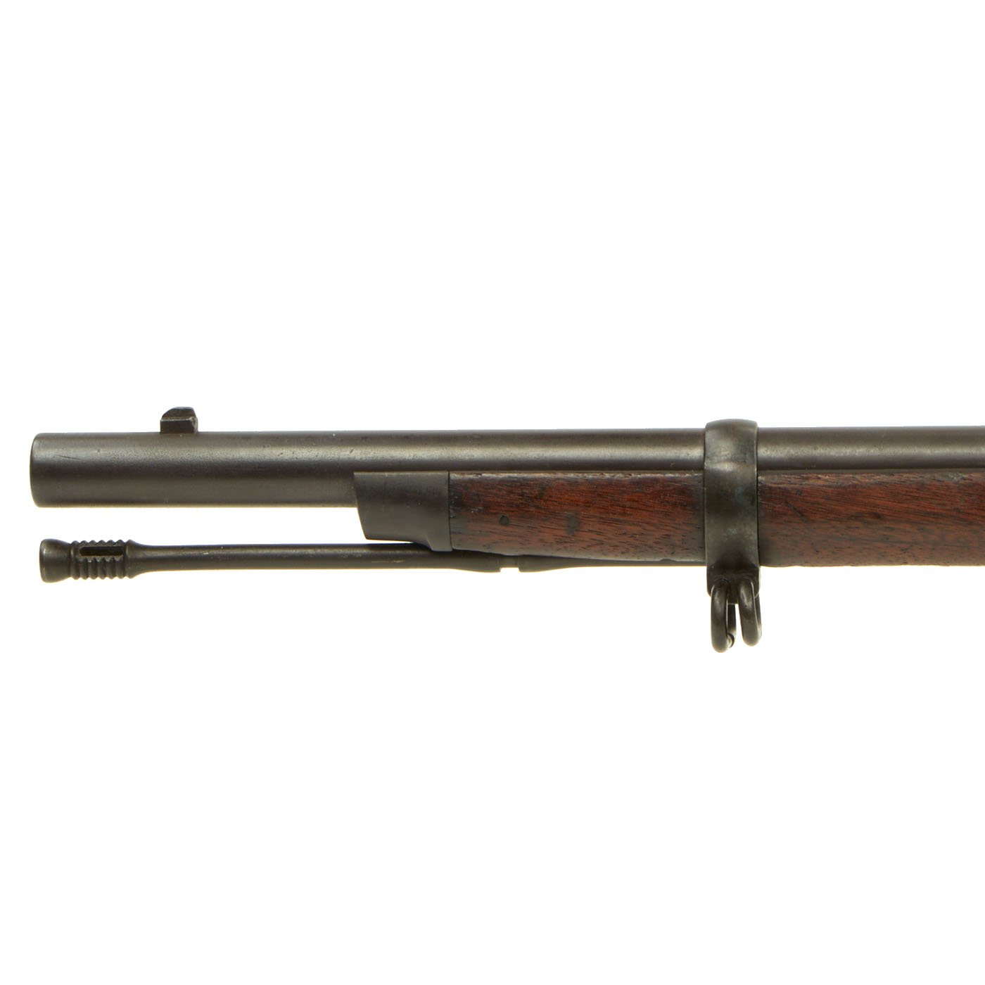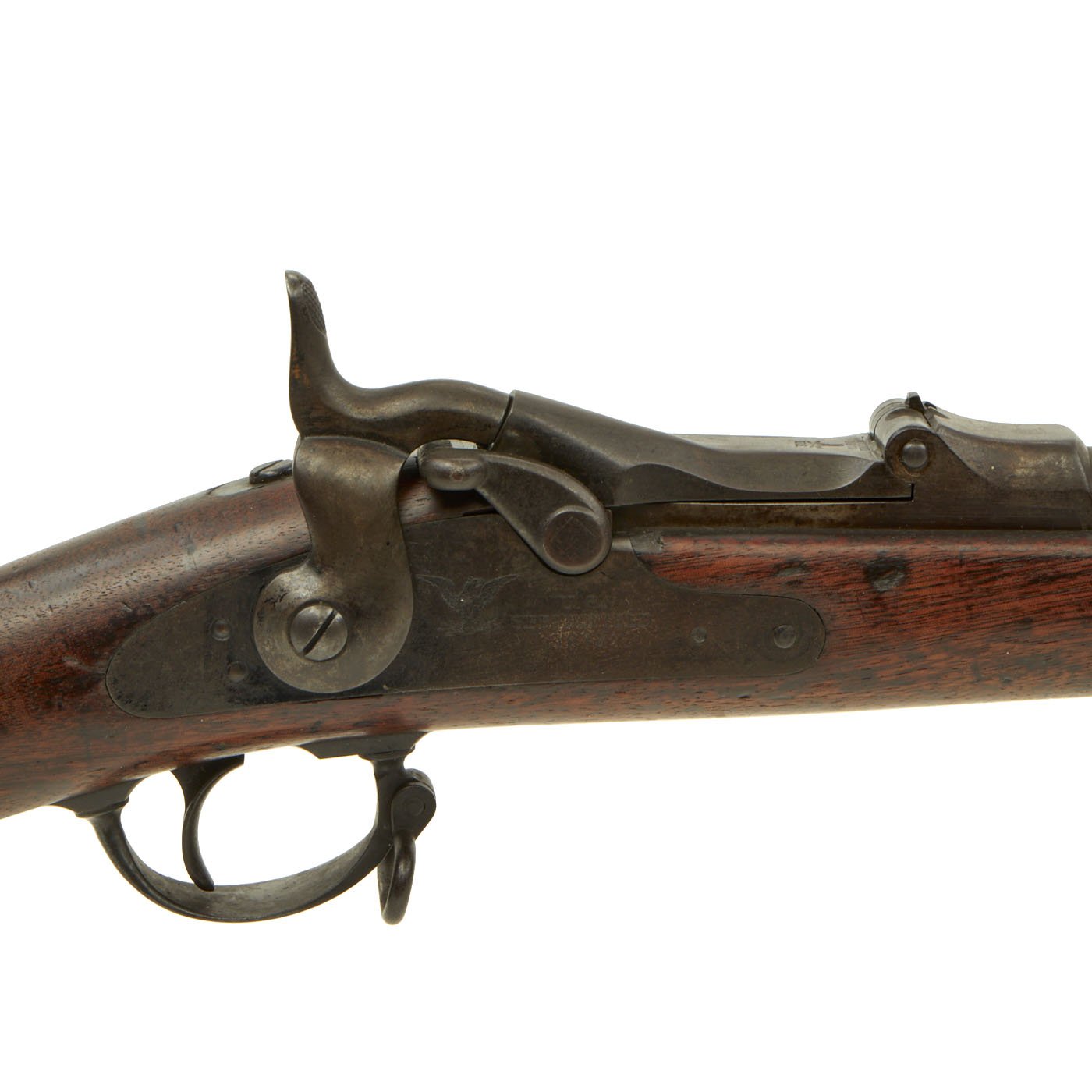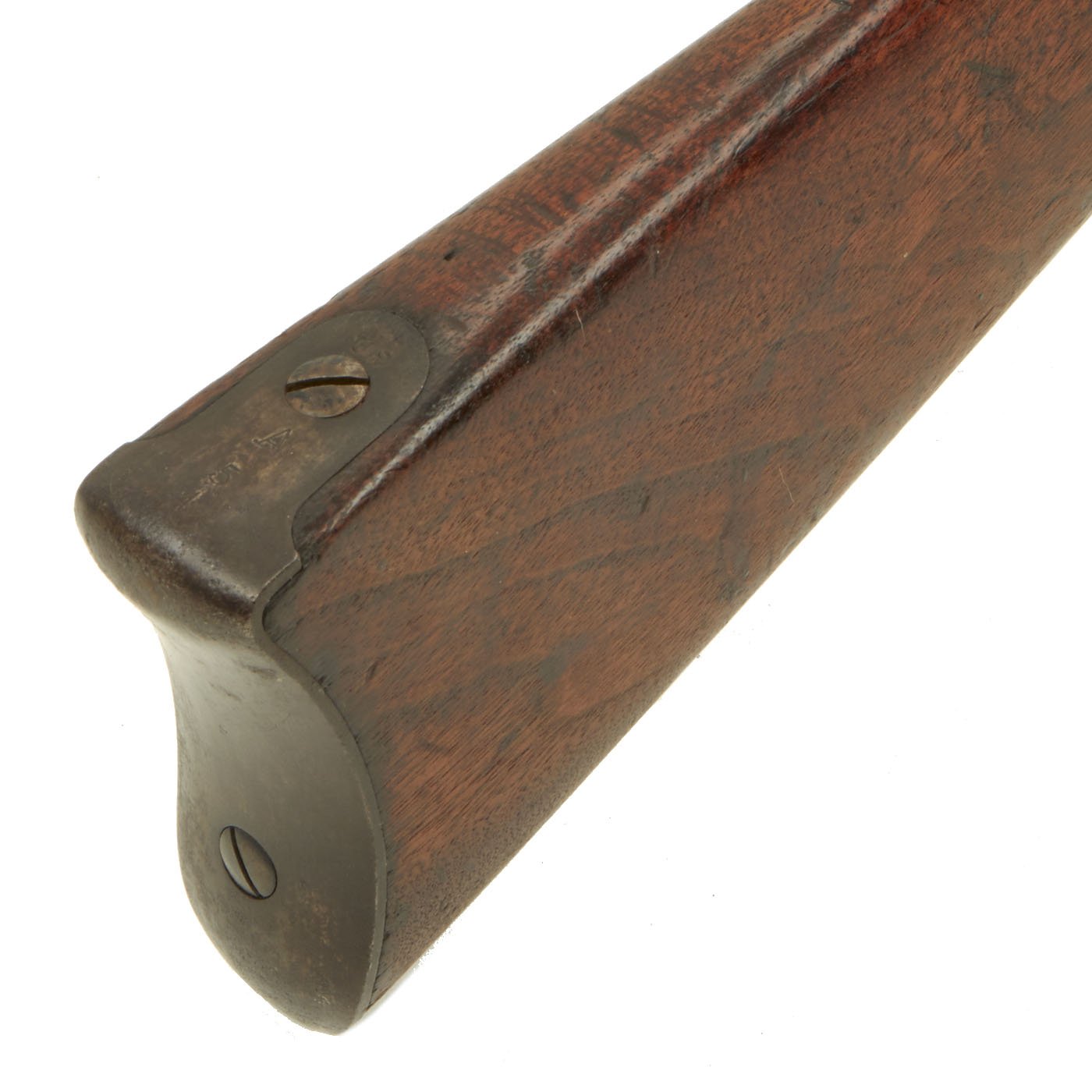 The bore is in excellent lightly used condition, with clear lands and grooves, and a mostly bright finish. There is just a bit of light haze in areas. The butt plate is marked U.S. and both barrel bands are U marked. Metal finish is a nice lightly worn gray color, with very minor peppering in places. Center fire breechloader, .45 cal., two bands, two sling swivels with stacking swivel, standard sliding sight, and standard early pattern ramrod.