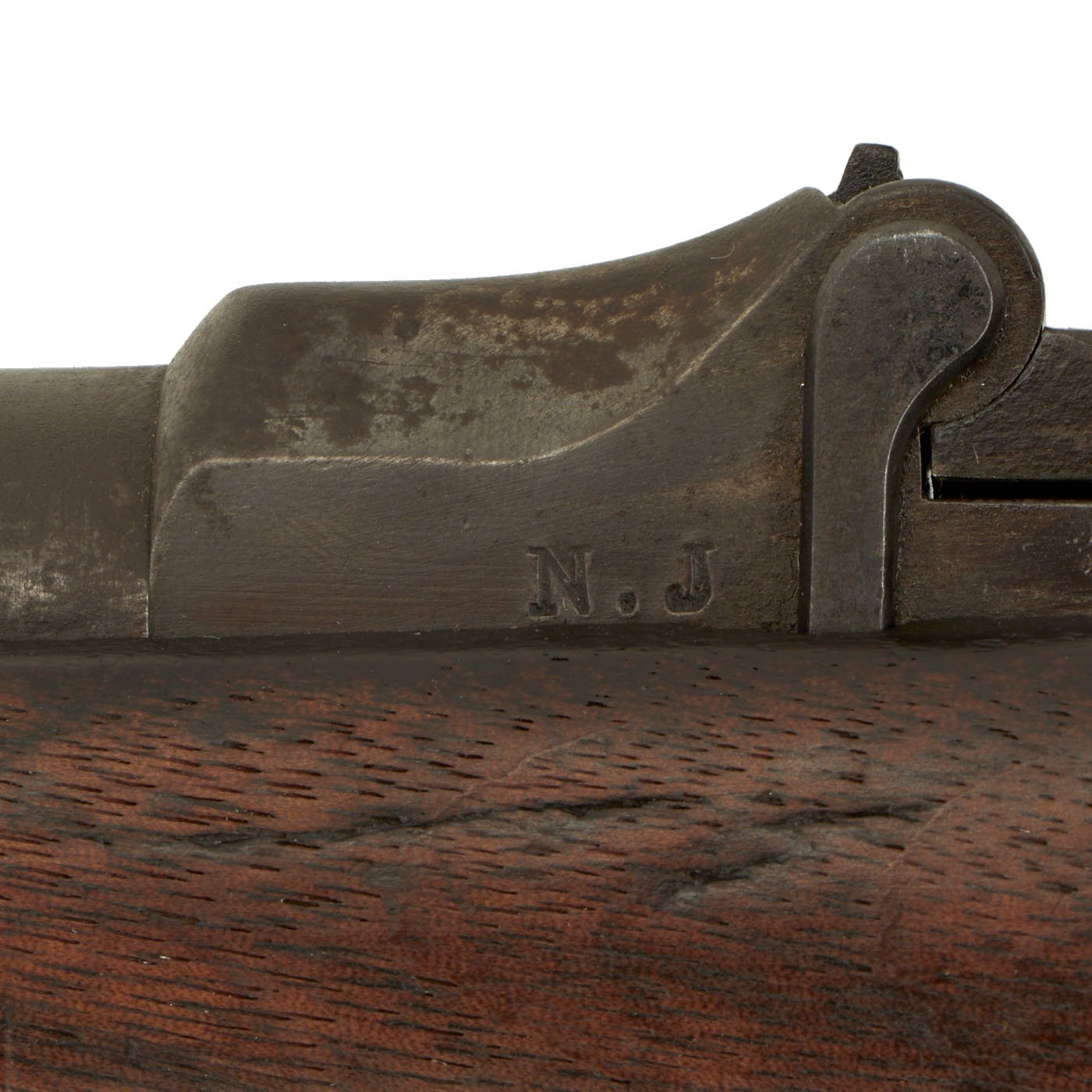 A very faint stylized P in a circle under the wrist of the stock indicates that the rifle passed all of its overpressure proof testing. There is also N J stamped on the left side of the receiver trunion, most likely indicating issue in New Jersey. The rear sight on this example is the correct very early 1st pattern, and does not have ramped profile of the later ladder sight, or the "R" Marking.