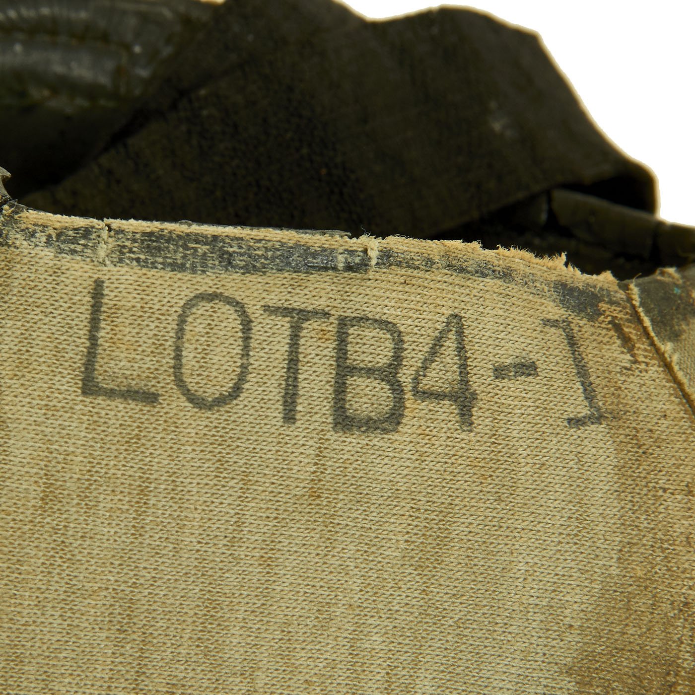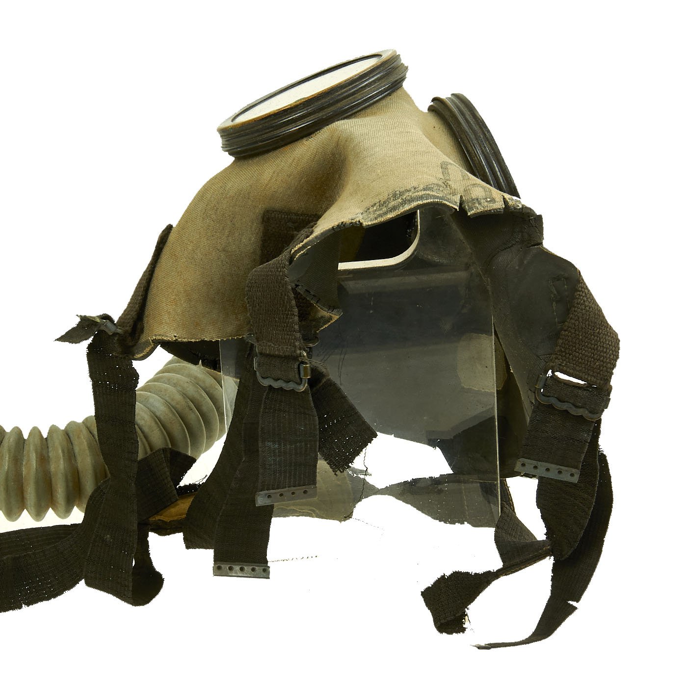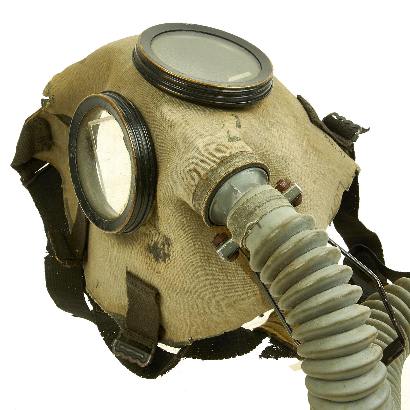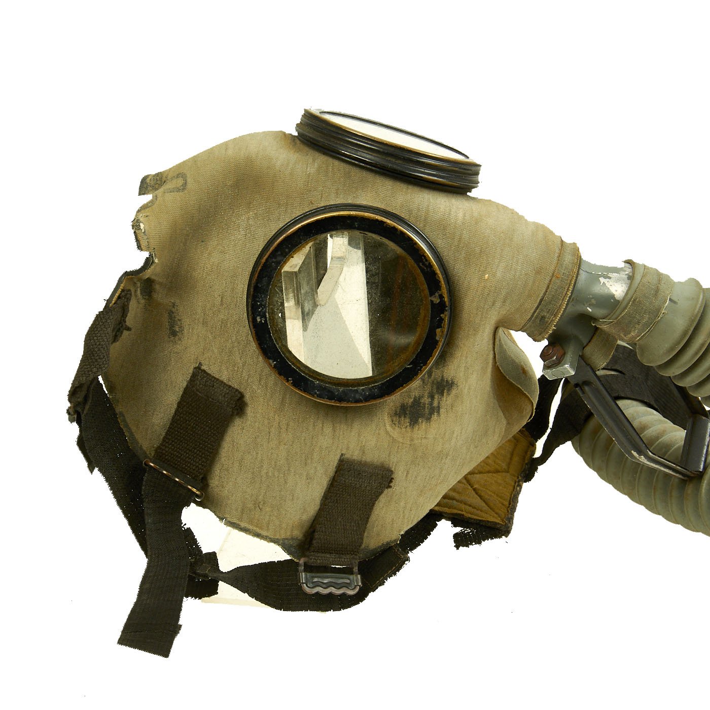 The mask is in good condition, though as with any WWII Rubber product, it has degraded in areas, as the rubber has dried out and deteriorated. The securing harness elastic is broken, and some of the internal components are also cracked. The rubber "bladder" below the valve is also missing, most likely having crumbled to pieces long ago. The hose is however still supple, and still connected to the M1XA1 filter, which has the correct markings, and is in good condition.