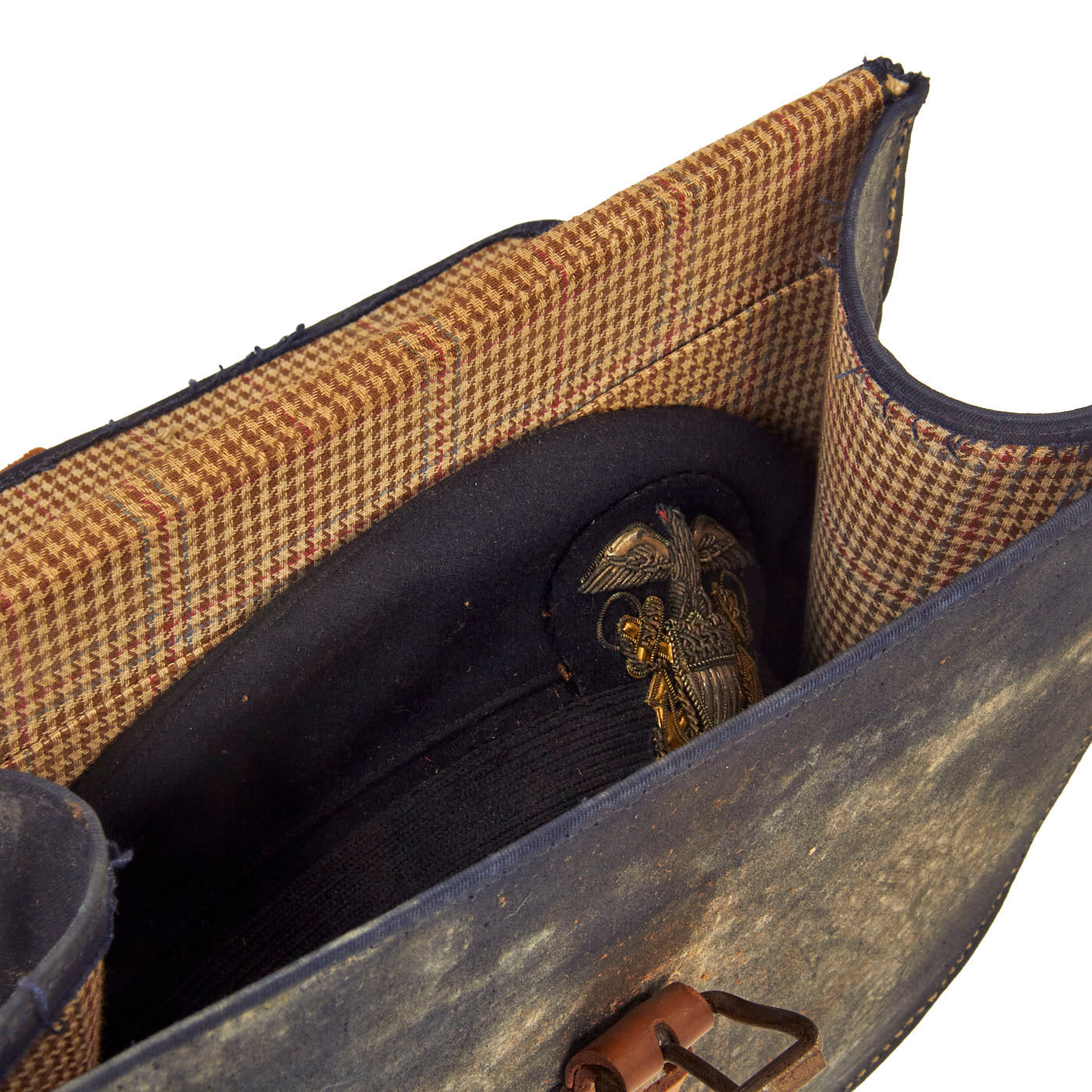 Overall the cap is in good condition, with only standard age related degradation and light mothing. The storage case that came with the visor is in lovely condition and has performed its duty the past 80 or so years. The exterior of the canvas bag has wear to it and discoloration but the inside is still lovely and without damage. The securing leather strap and buckle are in lovely, fully functional condition.