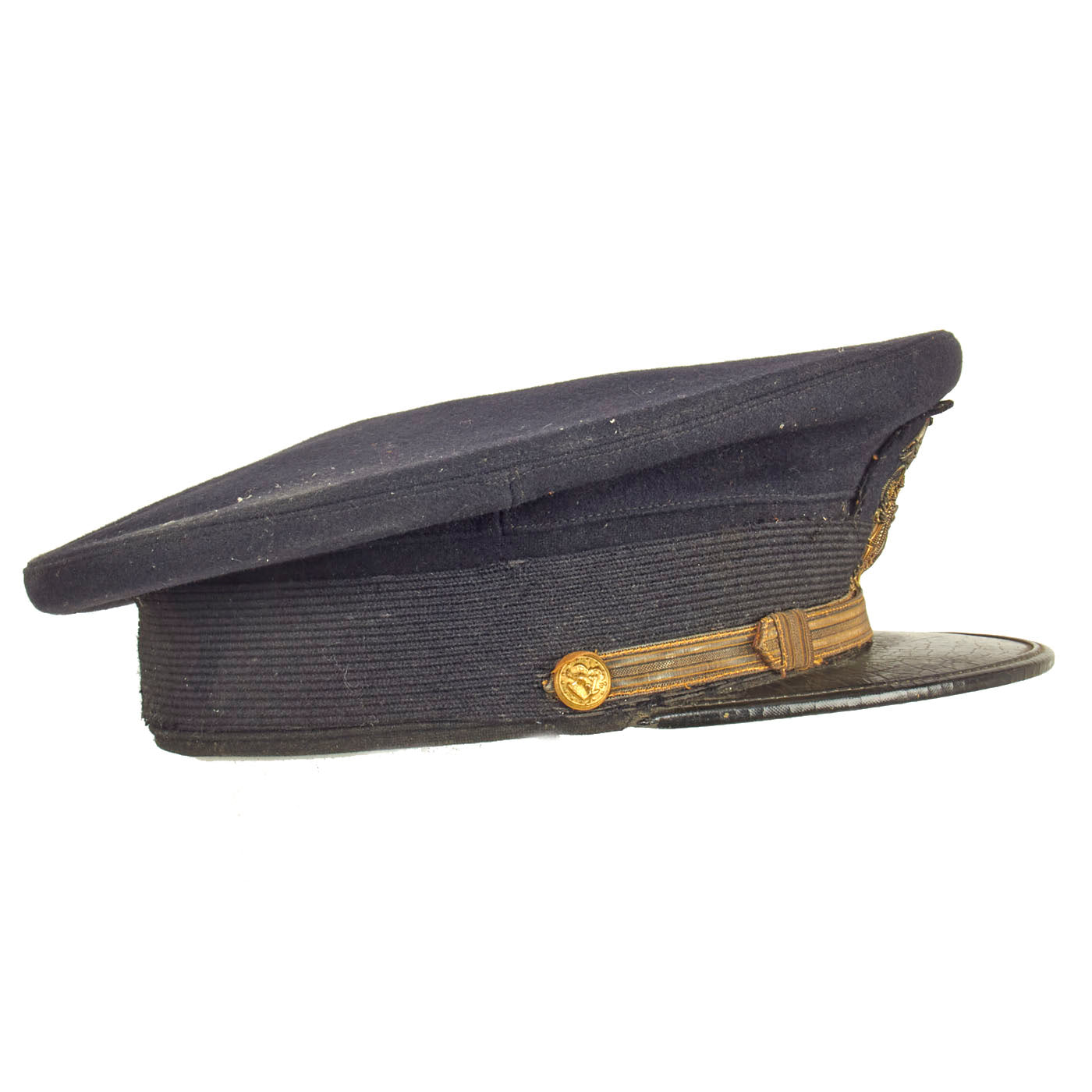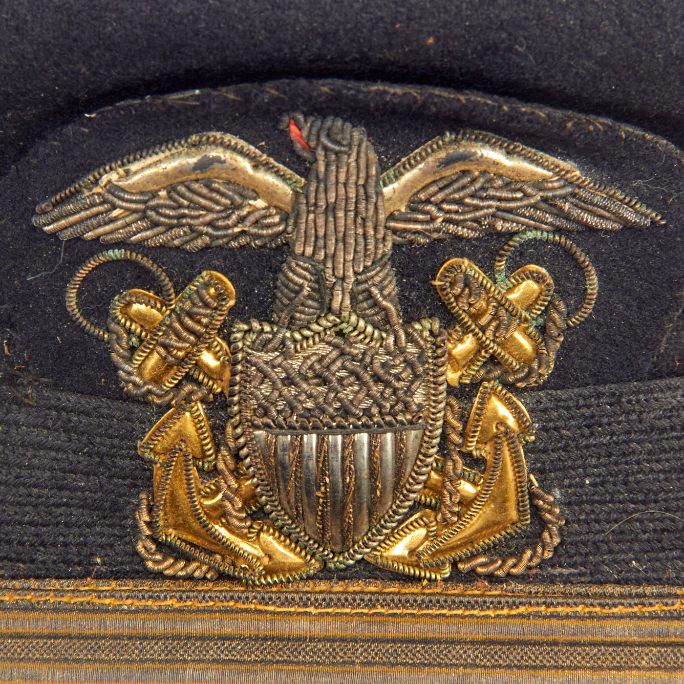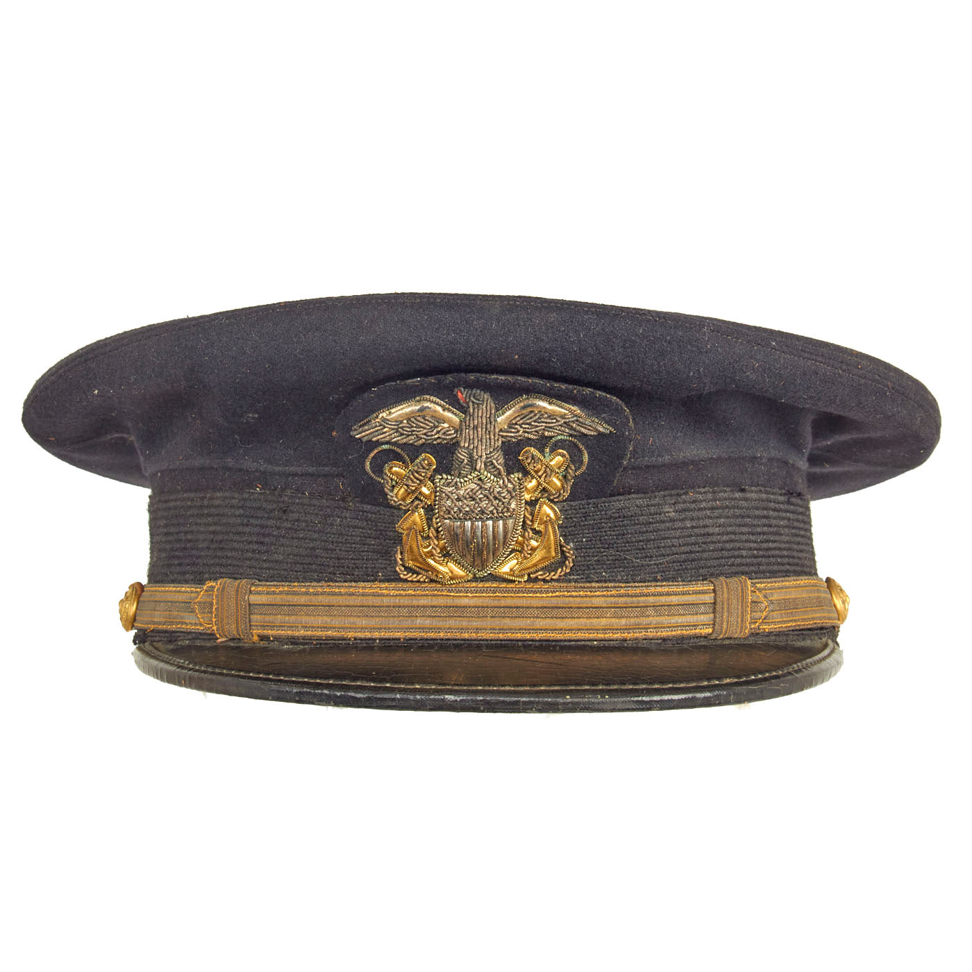 This is a totally correct high quality genuine World War II U.S. Navy officers complete visor cap. It features a wonderful heavy high quality embroidered eagle cap badge, without the felt top visor bearing gold bullion Oak Leaf "Scrambled Egg" appointments due to this being for a “junior” officer and one not in total command. It has the correct gold bullion chin strap, secured by the correct naval buttons. The cap currently has a dark navy blue felt cover installed.