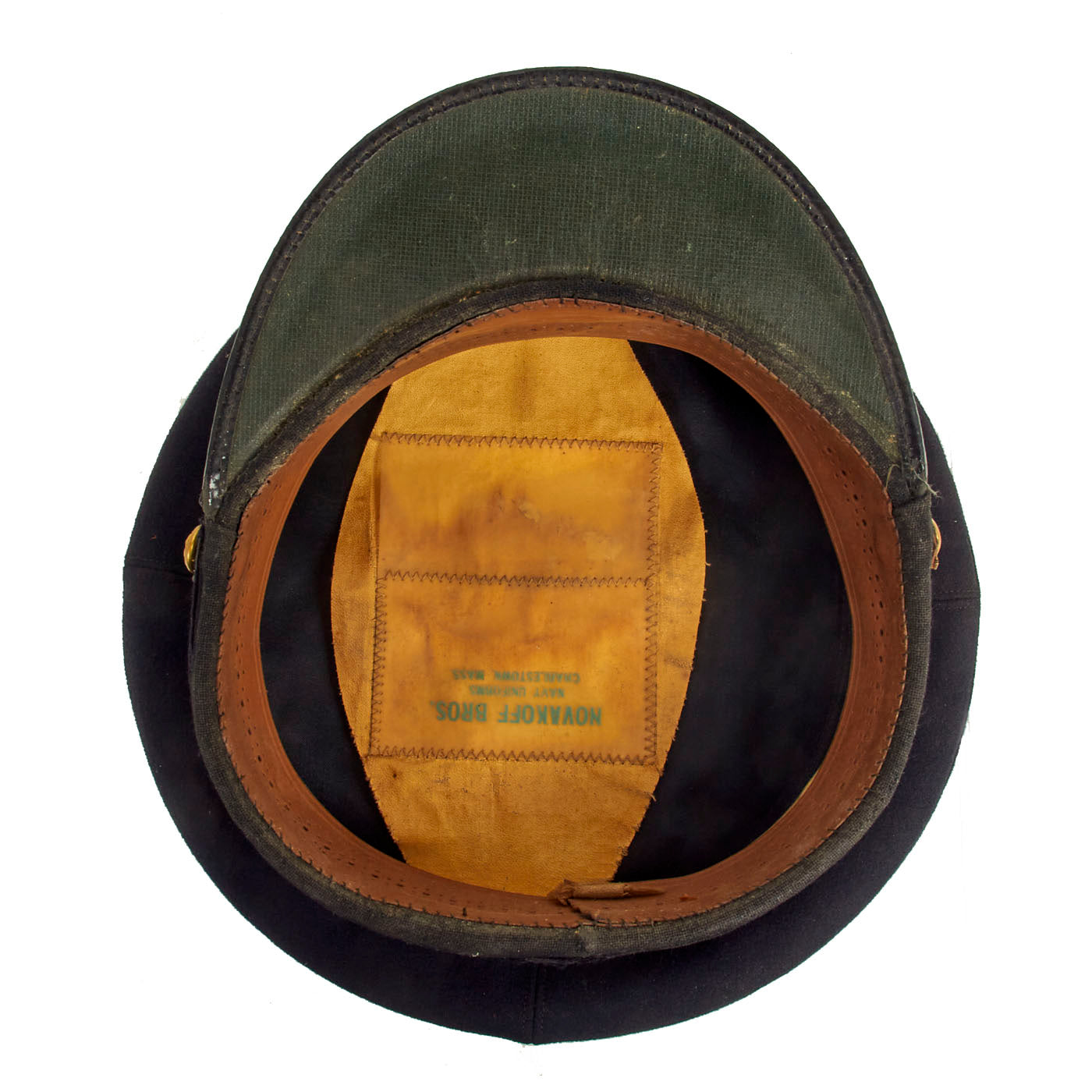 Original Item: Only One Available. This is a very nice example of a WWII U.S. Navy Officer "Complete" Cap, also called the "Combination" cap. Naval officers wore a variety of different colored uniforms in service, for different locations and occasions, so a cap was designed that could utilize various removable covers to match the uniform. The standard colors were White, Khaki, Navy Blue, and Gray (not included). The U.S. Coast Guard also wore the same caps, however they used a different cap badge with a larger eagle and a single anchor instead of two.