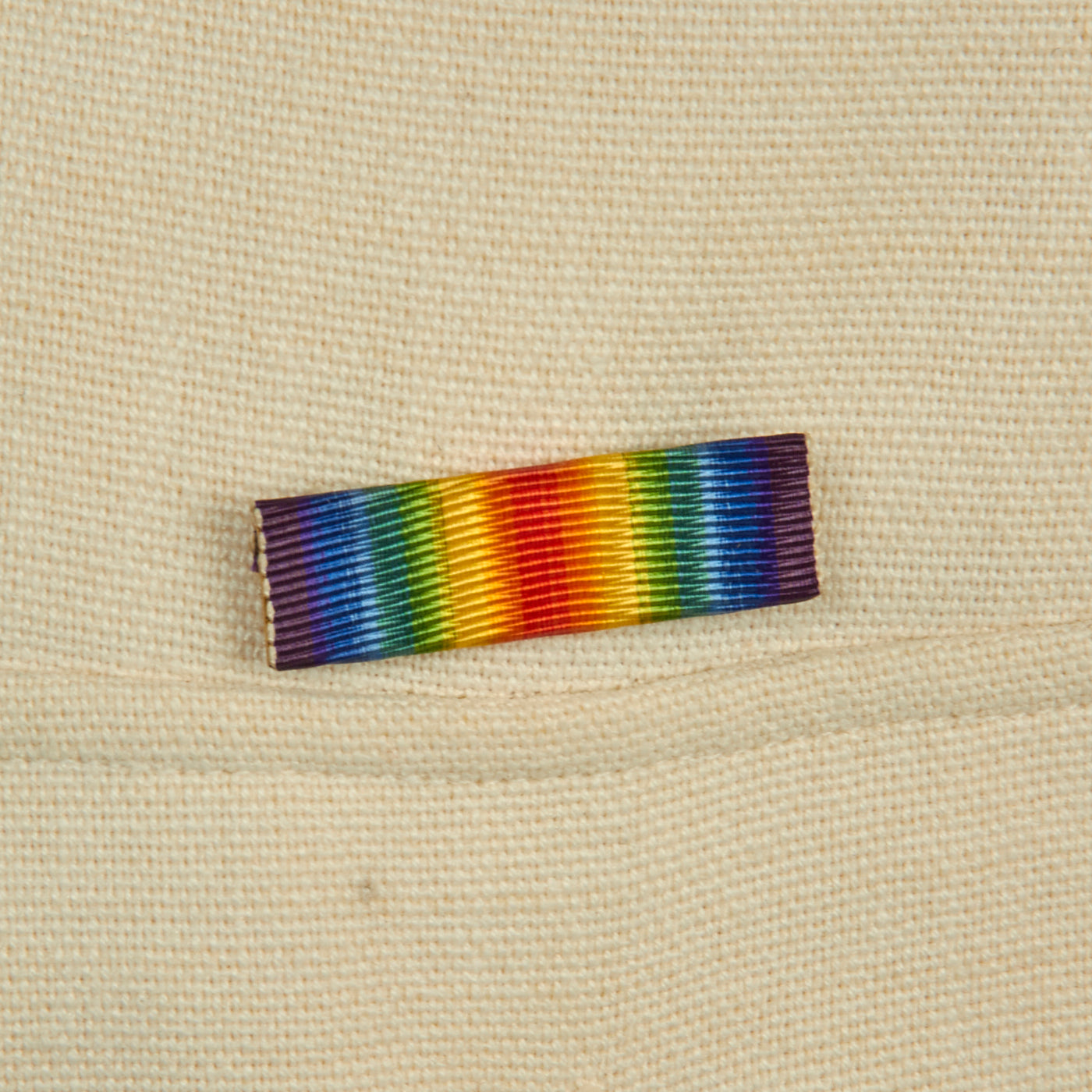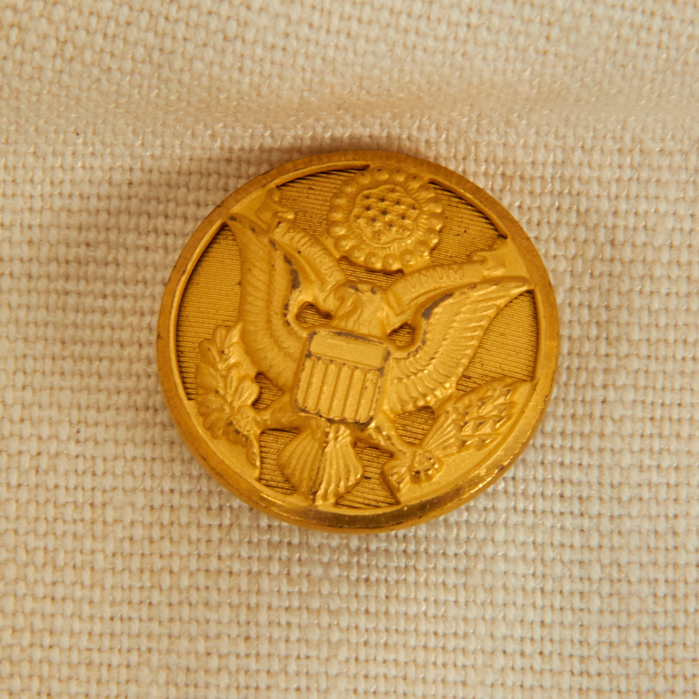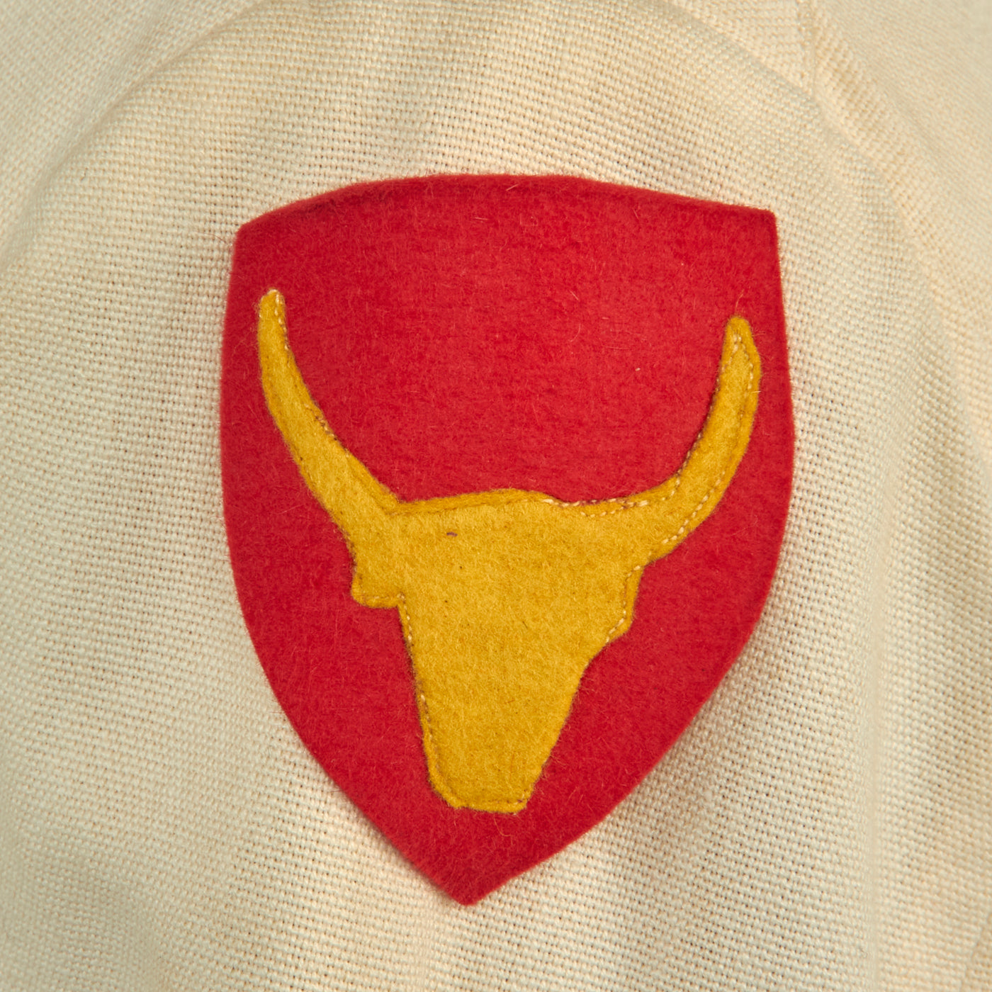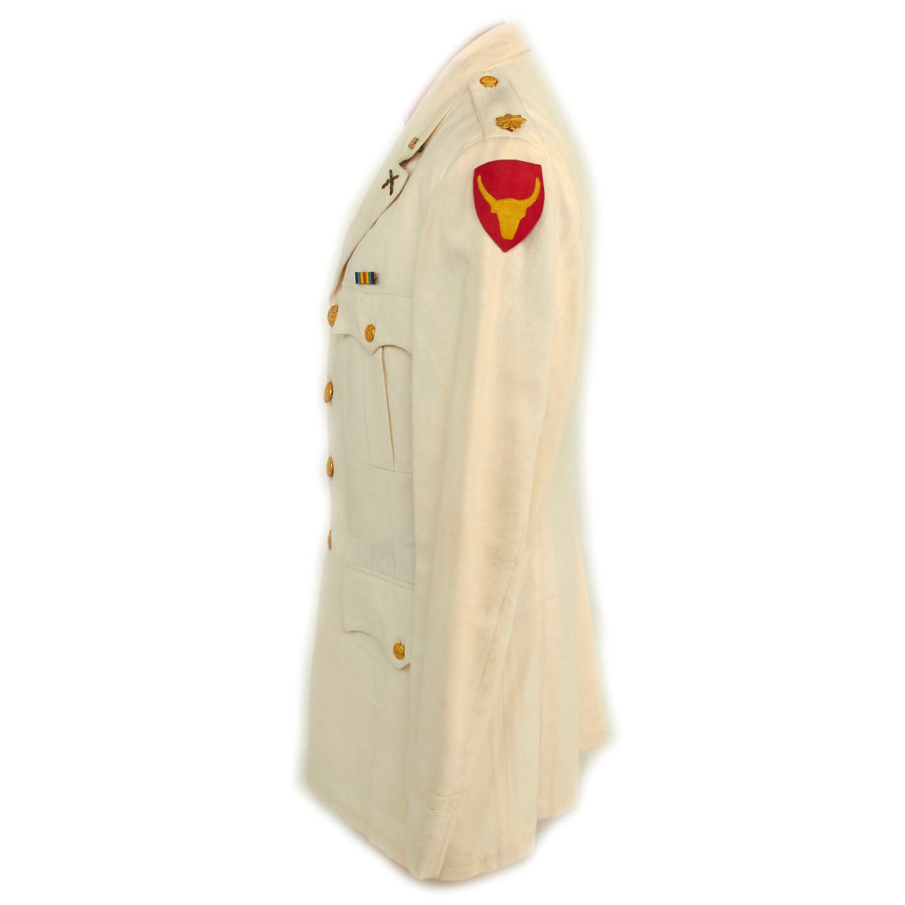 The left shoulder features a lovely button on shoulder sleeve insignia. The insignia consists of a gold caboshed carabao’s head on a scarlet spade-shaped shield. The carabao is suggestive of the Philippines, and the colors red and gold represent the Spanish heritage of the islands.
