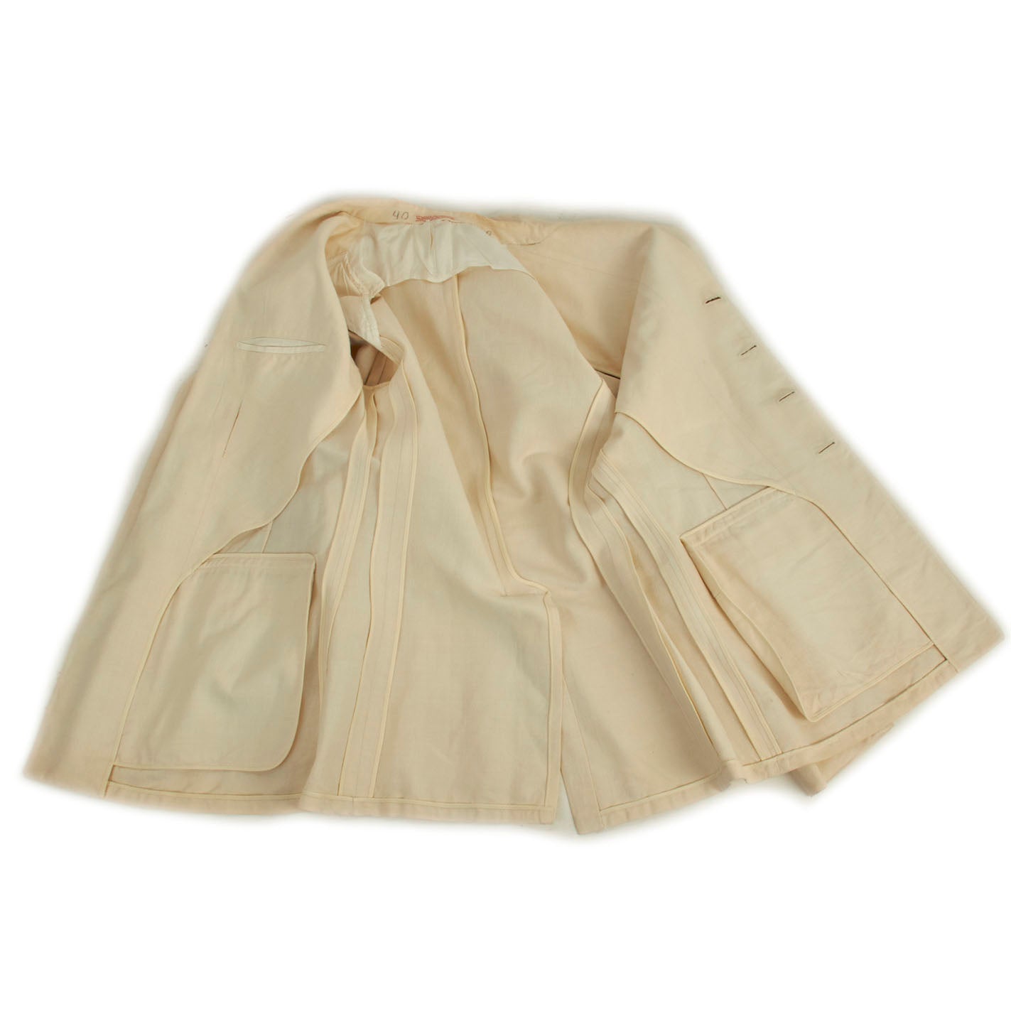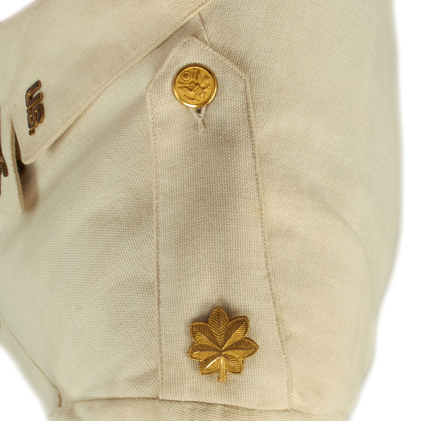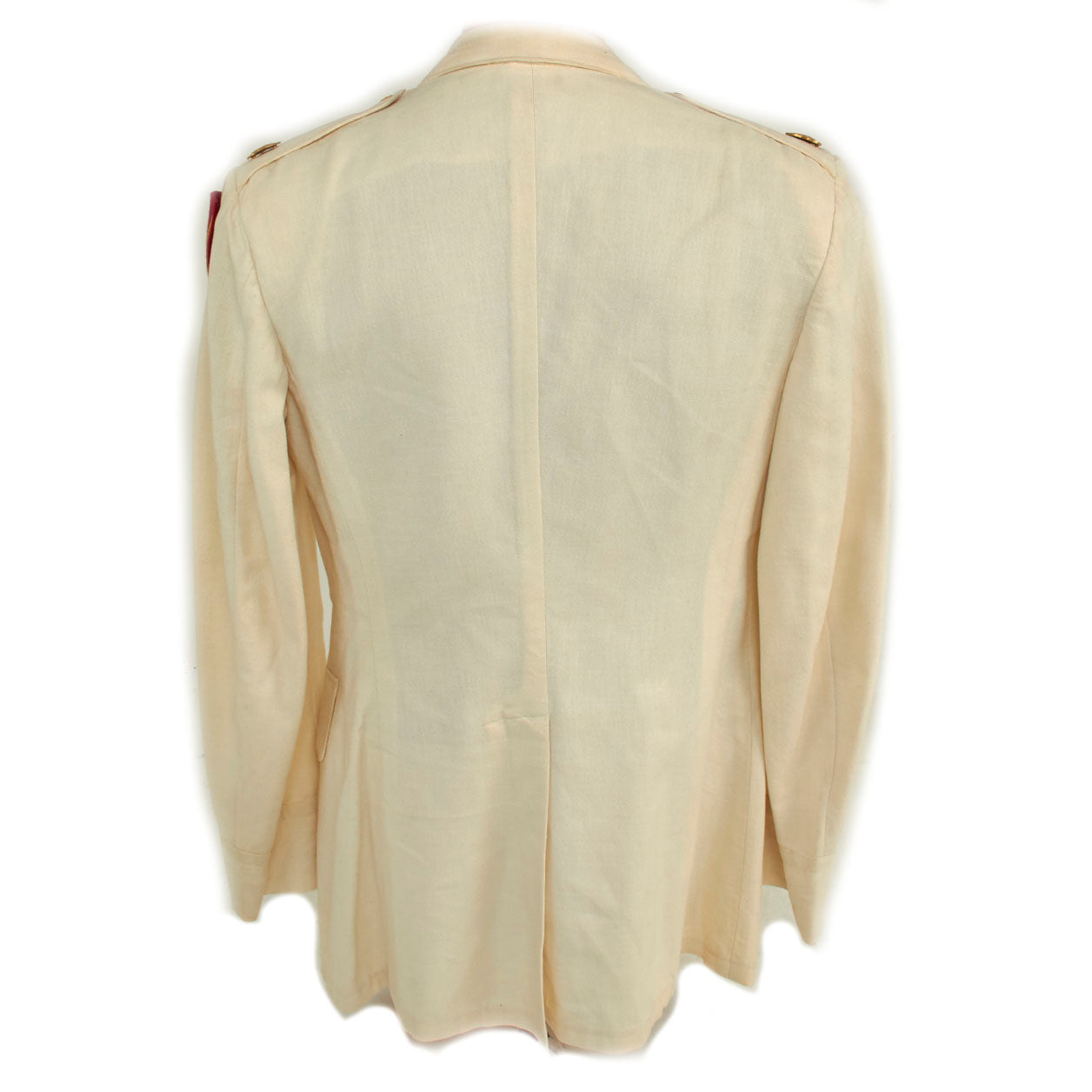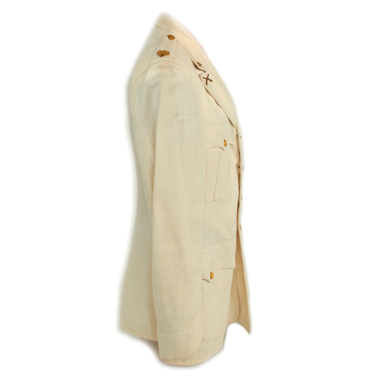 The overall condition of the uniform dress jacket is close to excellent. The white color is still very much the original color and has minimal age toning and virtually no stains present that we can find on the exterior. All buttons are present, each shoulder has a lovely bronze Oak Leaf for the rank of Major, there is a single WWI Victory Medal Ribbon located on the left front, meaning he could have been a veteran of the Great War or this was just an addition to the uniform.