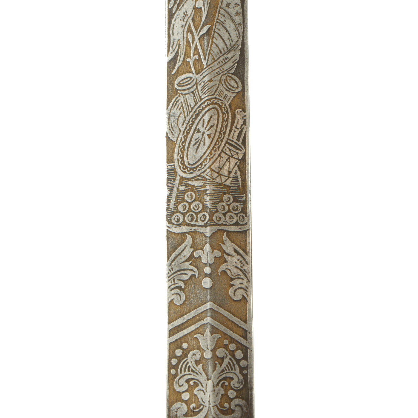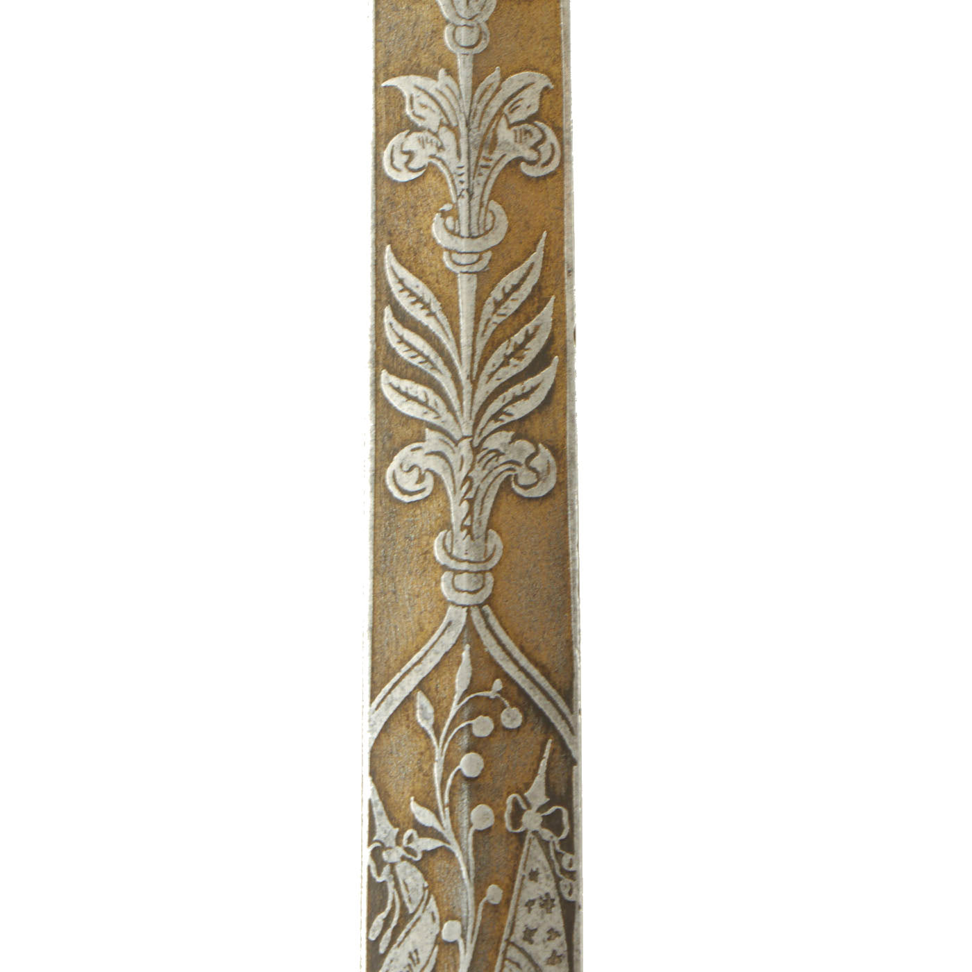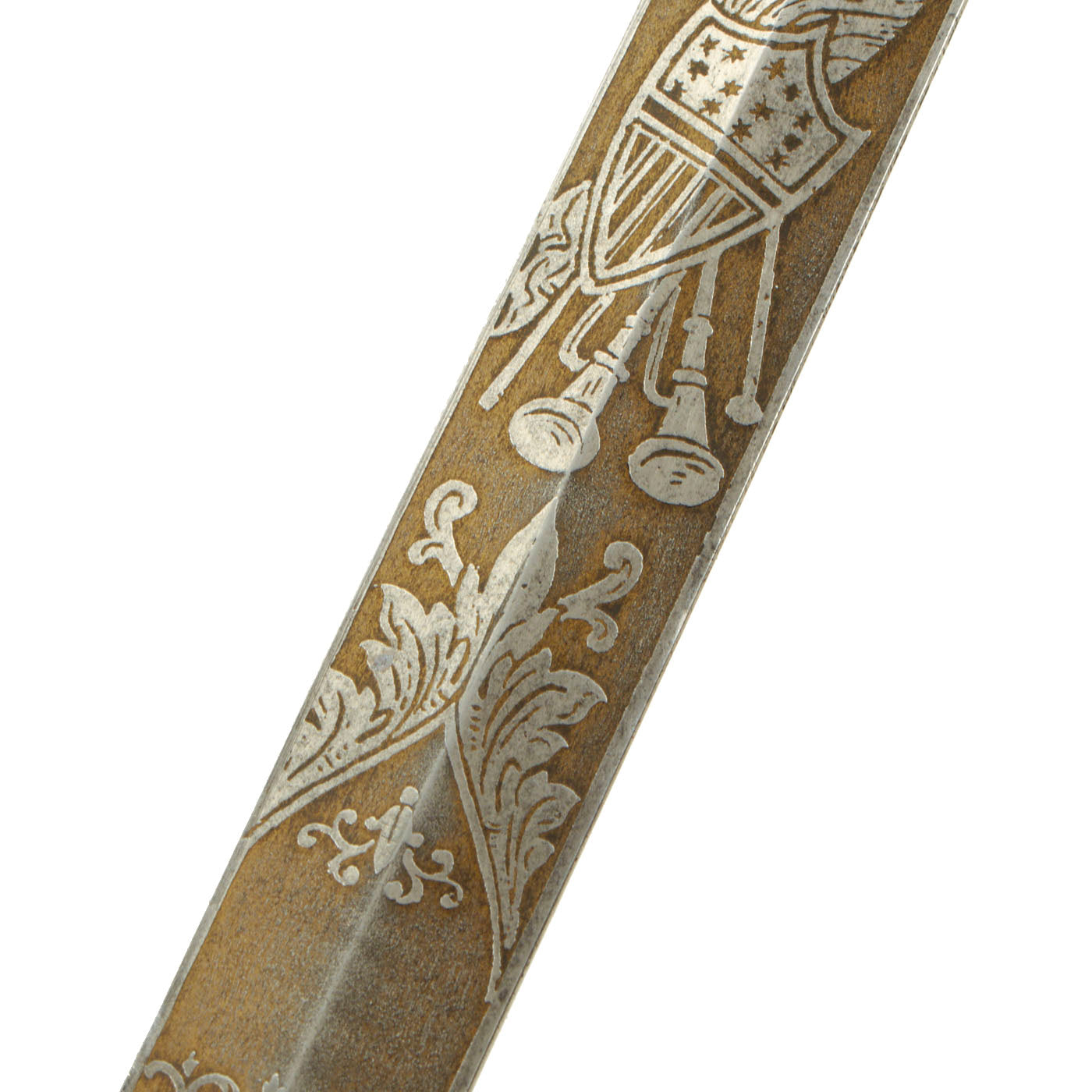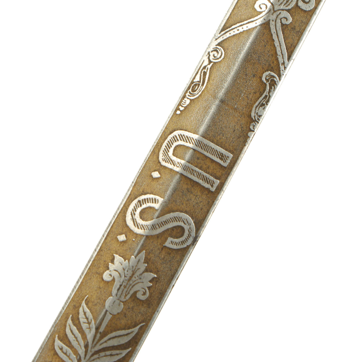 The blade is handsomely hand engraved, with a federal eagle on the left side of the blade. Military and floral engraved motifs are present on both sides of the blade. On the right side of the blade is etched with the standard “US”.
