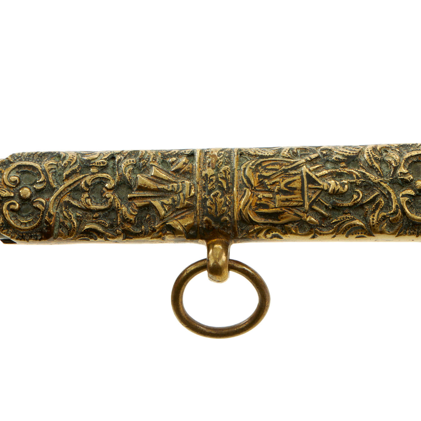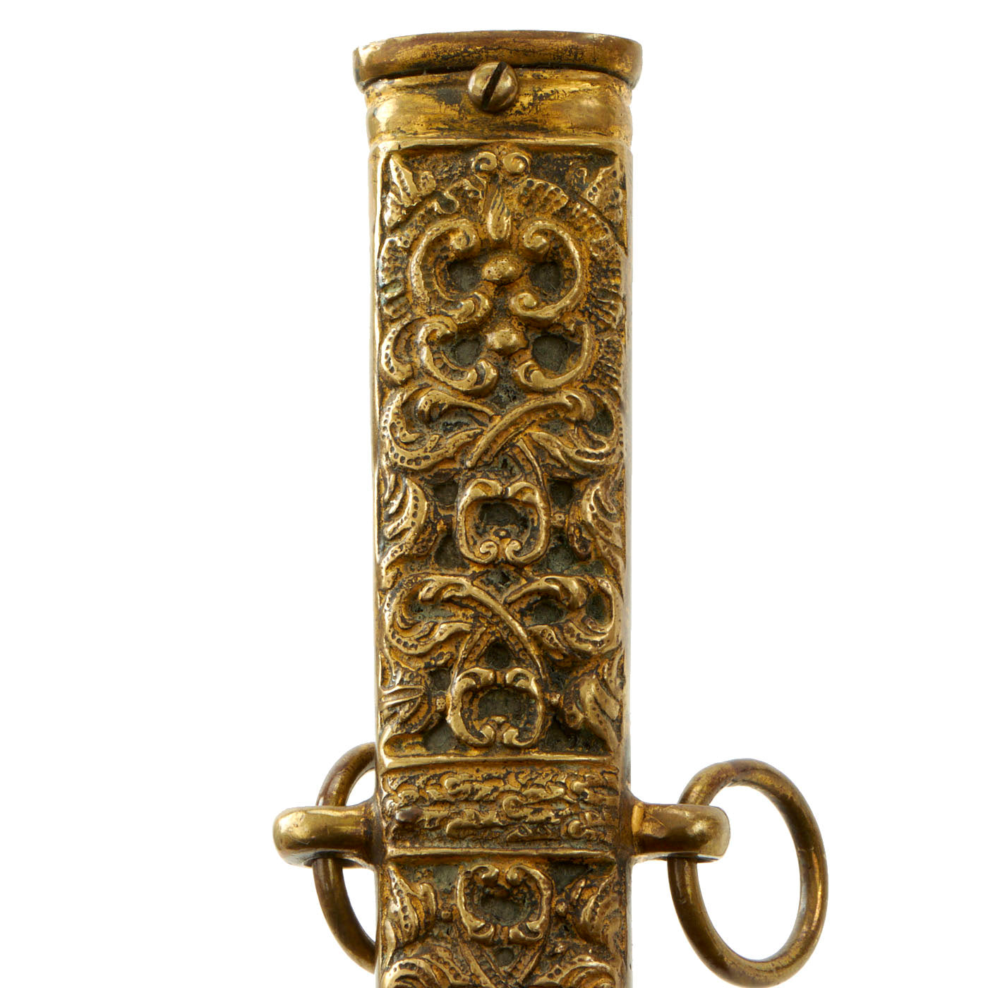 The Sword hilt and handle is brass, with the handle having a separate brass wrap to mimic the wire used on the leather handled versions. Scabbard is brass finished steel with filigree brass furniture. The scabbard is beautifully hand engraved with the following: