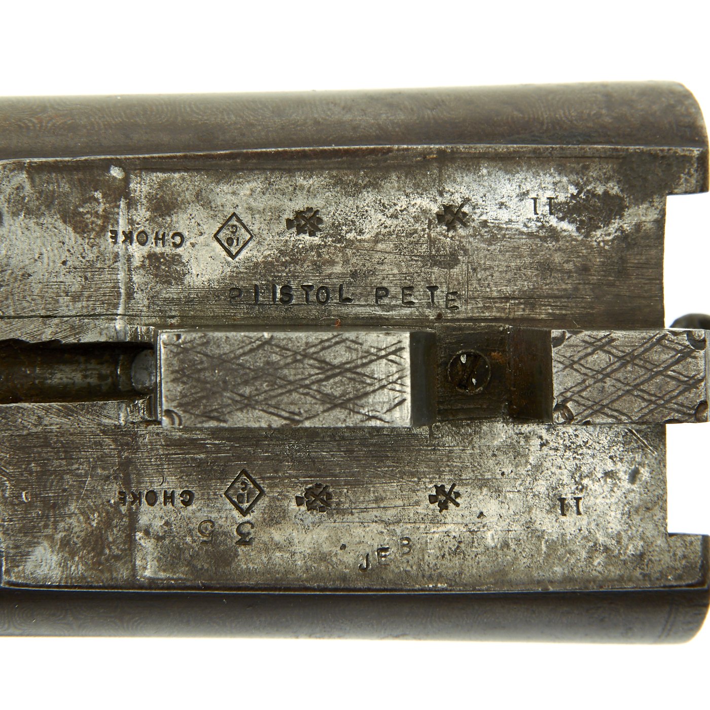 That would definitely be the stampings of W. F. & Co on the hinge of the gun, as well as the PISTOL PETE marking on the underside of the barrel. The former marking would indicate that at one point, this shotgun was owned by the Wells Fargo Company, most likely for protecting money shipments, or something similar. After that, it was apparently sold off to be replaced by more modern guns.