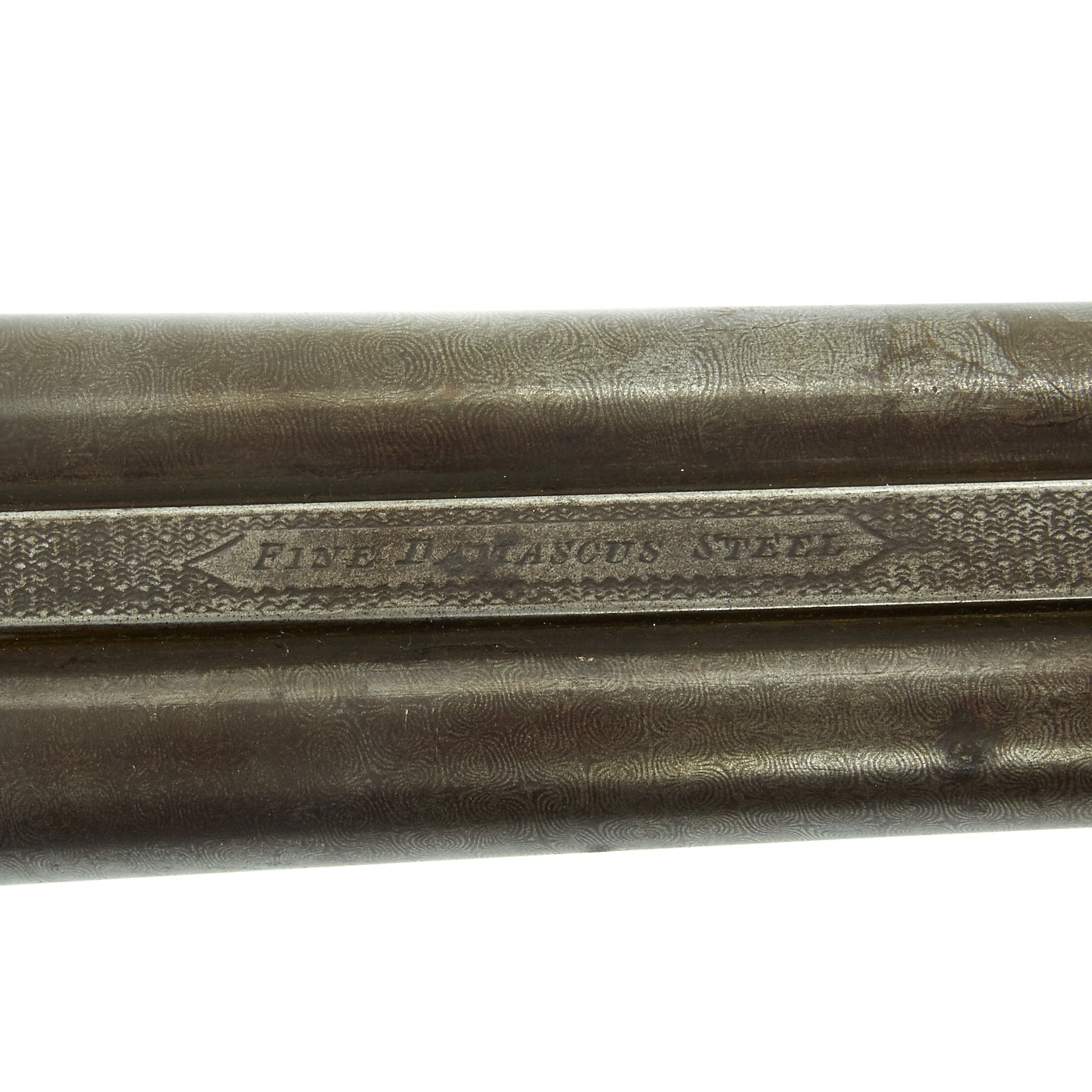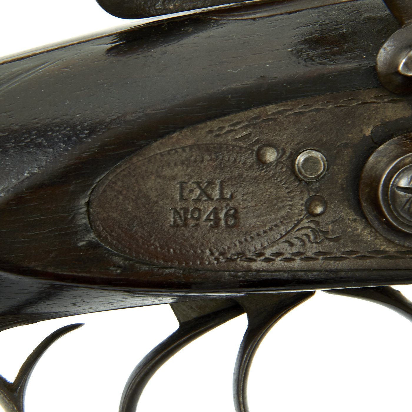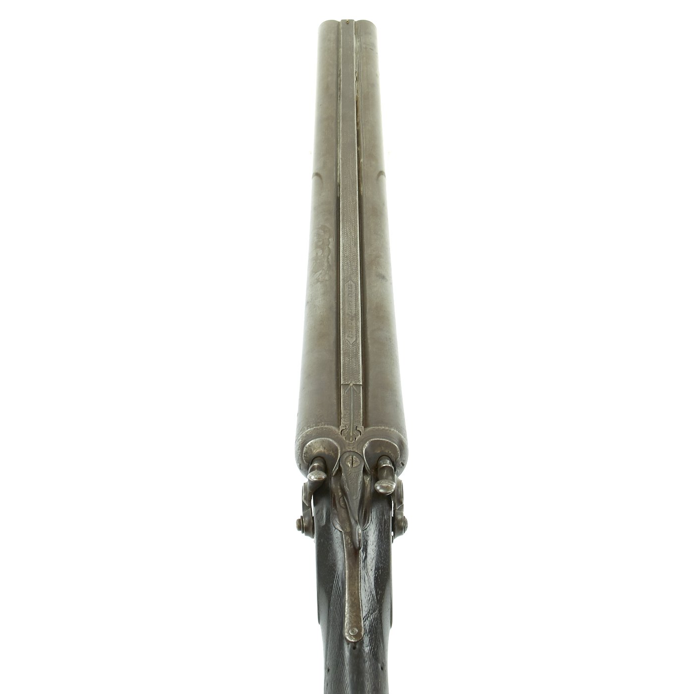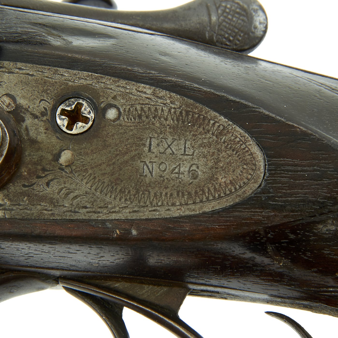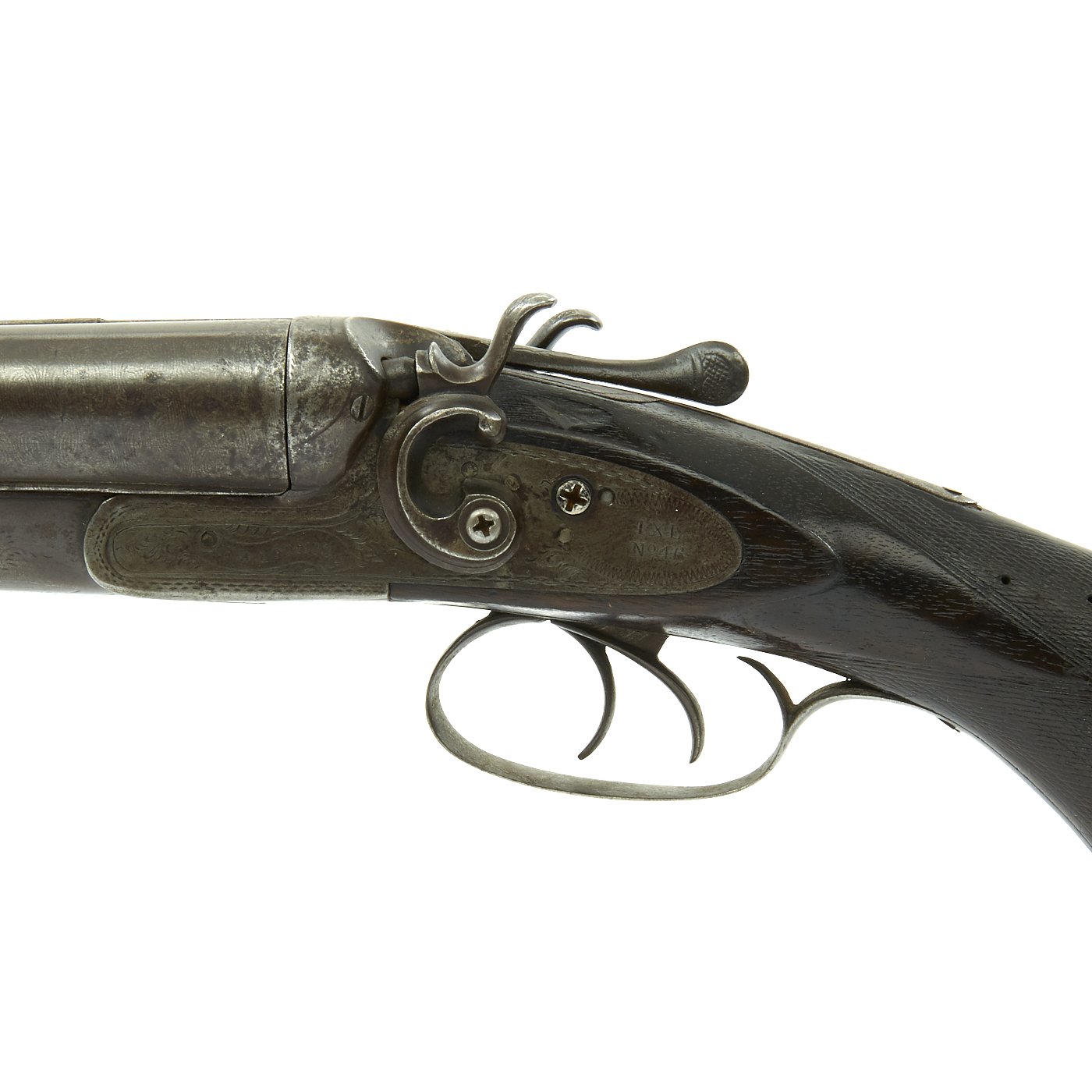 Original Item: One of a Kind. This came out of our big gun buy over over 200 units that had been in storage for nearly 100 years. It dates from the 1880's and is marked on each lock with F. A. LOOMIS, in a banner, and on each tail is IXL / No.46. The barrel strap is also marked with IXL / No.46 around an inlaid arrow, and also states FINE DAMASCUS STEEL. One look at the barrels will tell you that this is definitely the case. The gun is in excellent shape, both hammers and lock plate decoratively engraved. It has great wood stocks, with horn appointments.