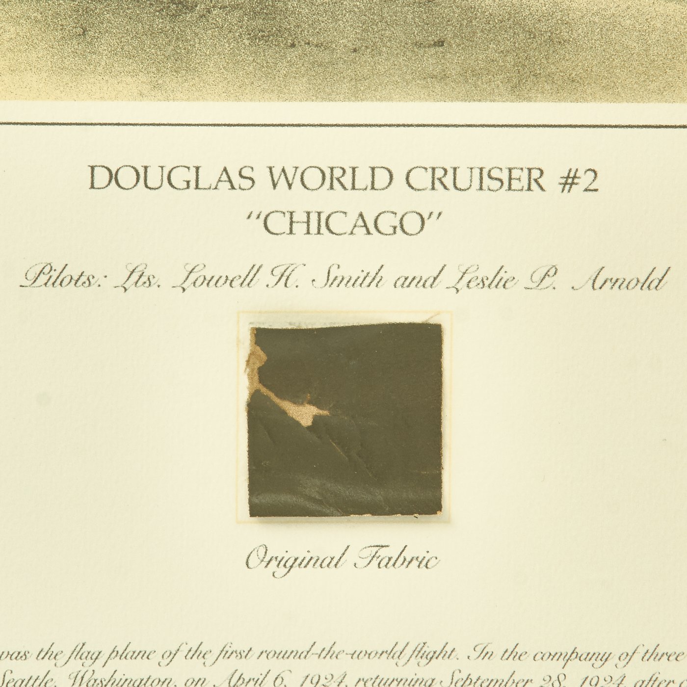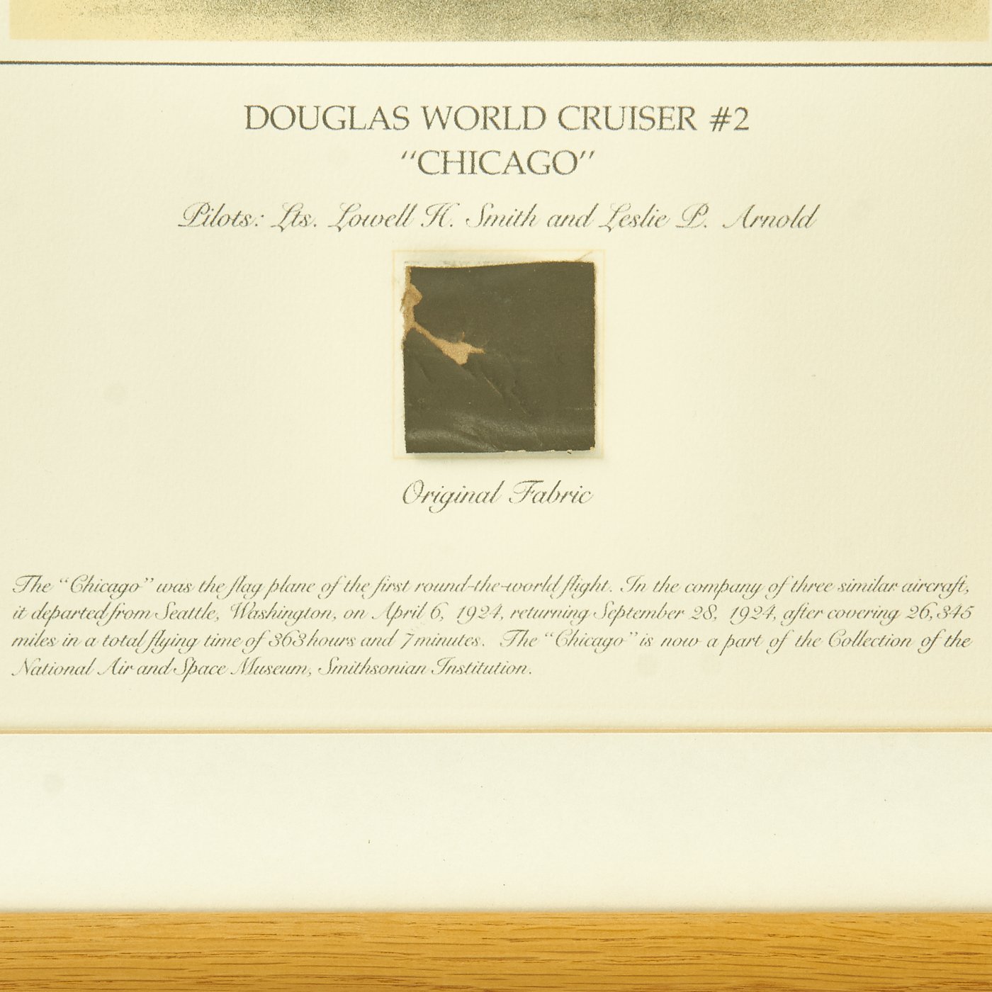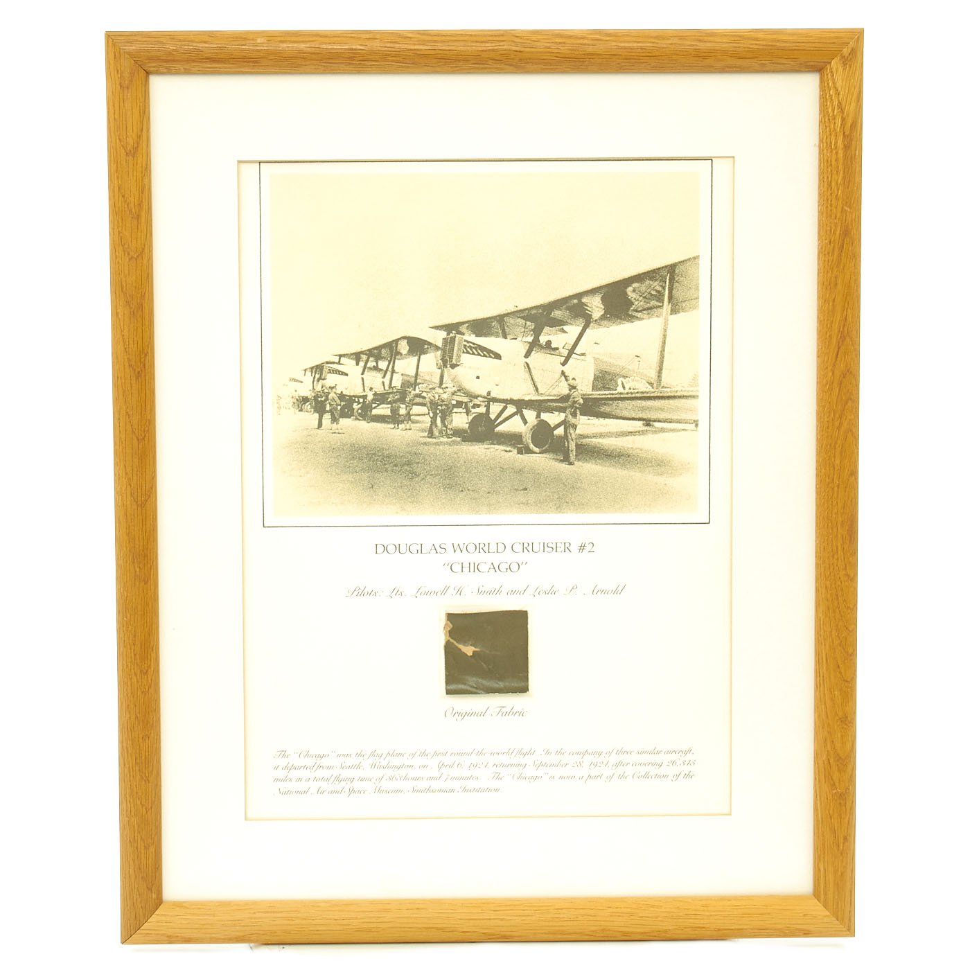 What we have here is a 2" x 2" framed piece of original fabric from the Douglas World Cruiser #2 "Chicago". These were apparently being sold to help further the restoration efforts on the historic plane, as the fabric will only last so long, and eventually needs replacement. It is mounted inside a frame, under a picture of the aircraft, and is captioned as follows: