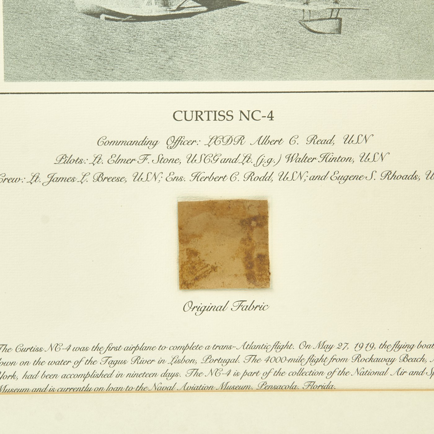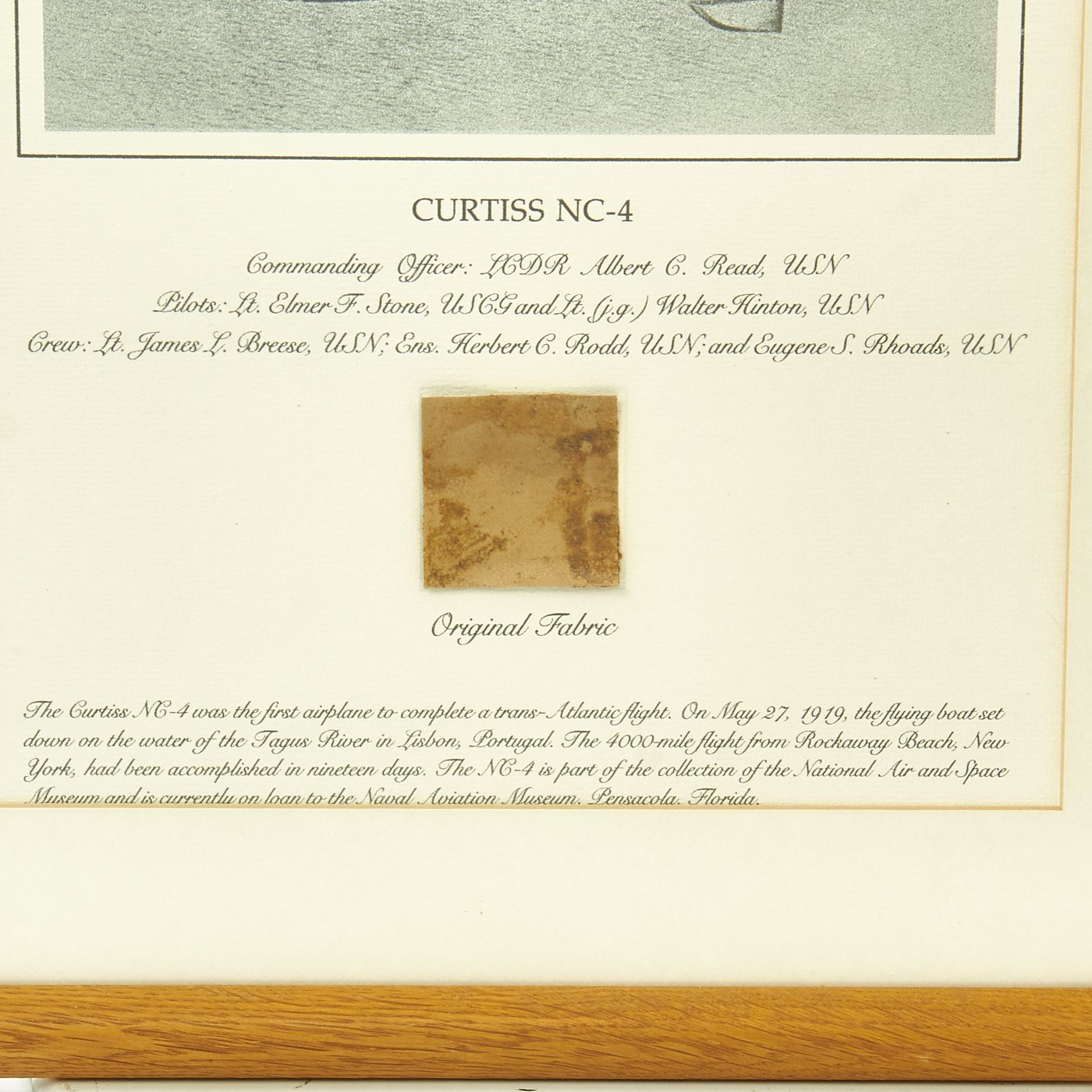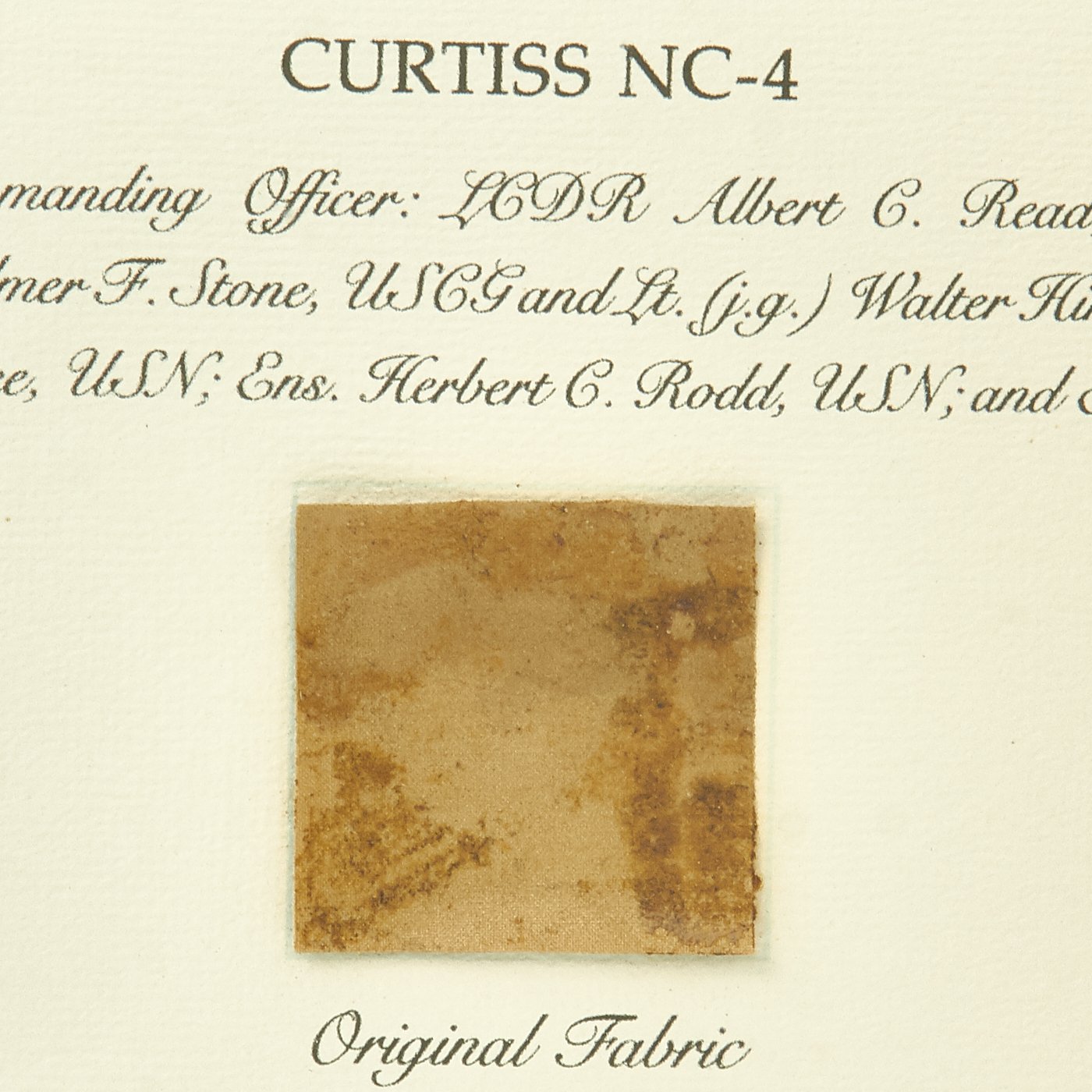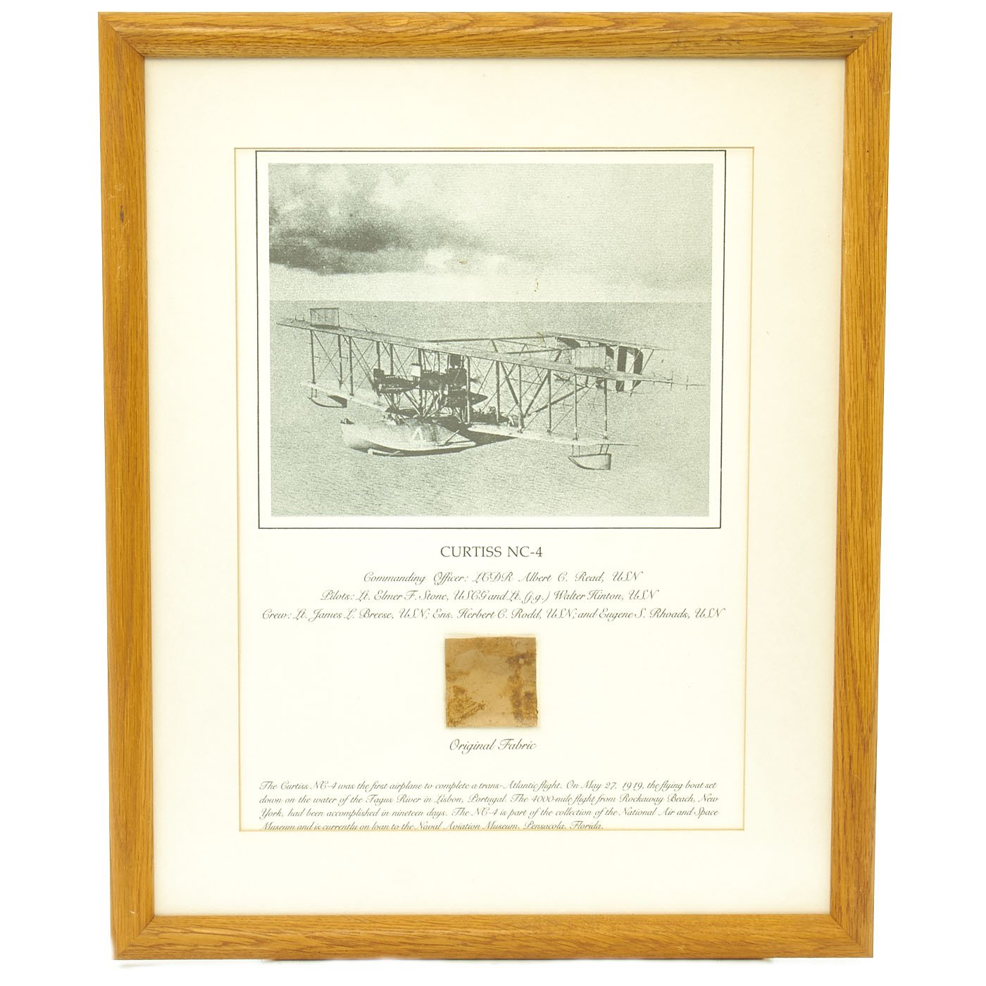 What we have here is a 2" x 2" framed piece of original fabric from the Curtis NC-4. These were apparently being sold to help further the restoration efforts on the historic plane, as the fabric will only last so long, and eventually needs replacement. It is mounted inside a frame, under a picture of the aircraft, and is captioned as follows: