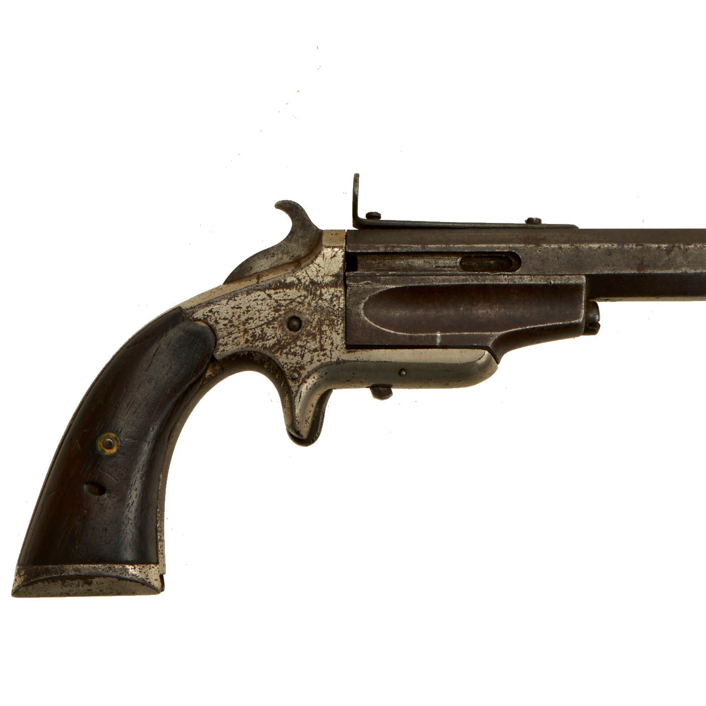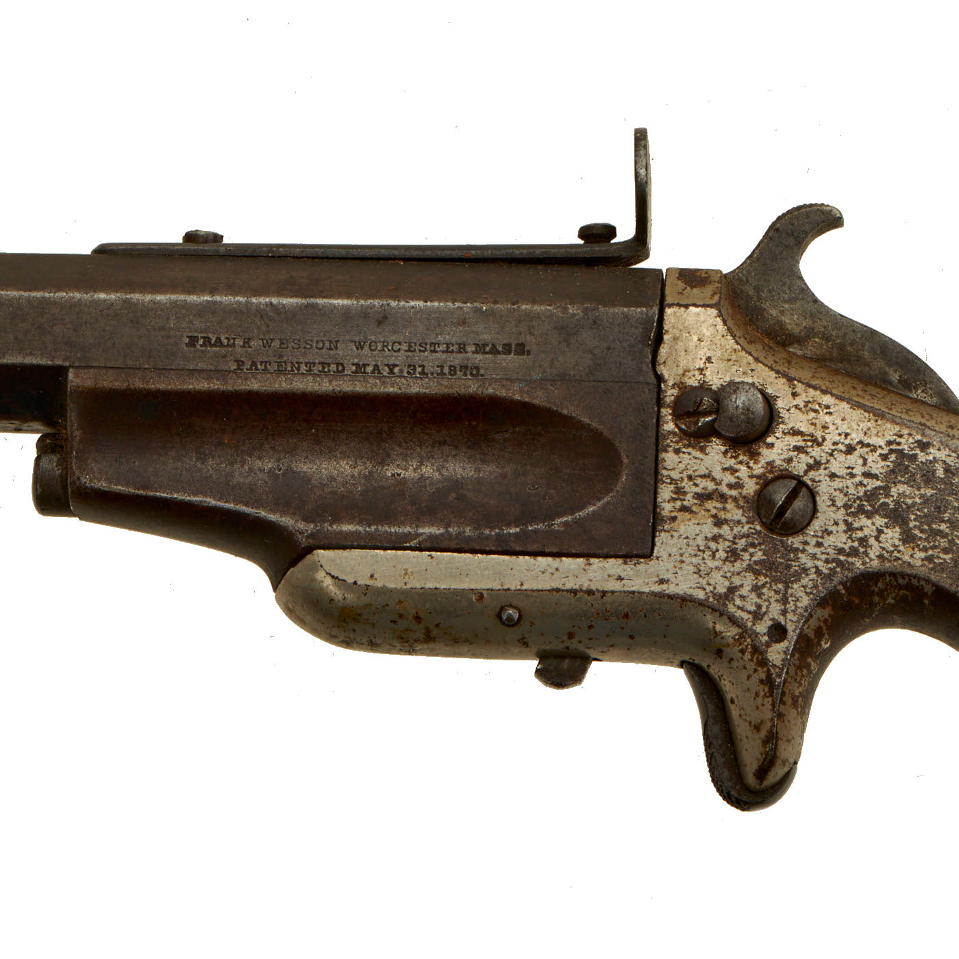 Original Item: Only One Available. This is a very nice Frank Wesson .22 caliber single-shot target pistol, referred to as a small frame "pocket pistol", which would require someone to have HUGE pockets. The advertising however usually referred to these as the "Sportsman's Jewel", intended for the discerning target shooter. It is a rotating barrel design that features a 15" octagonal barrel mounted to a typical pistol sized frame. The bottom of the grip has a dovetail, intended to be used with a skeletal shoulder stock, which are extremely difficult to find.