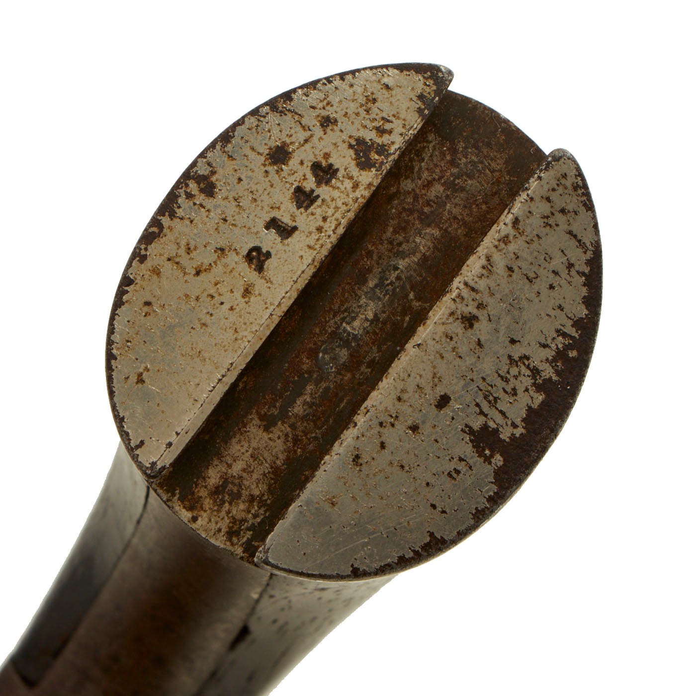 Condition wise, the pistol is in very good used condition, with wear and oxidation commensurate with age. The nickel plating on the frame is retained about 50%, with oxidation where the plating has eroded. The barrel has faded to a plum patina, with the original dark blue finish visible on the bottom of the barrel when the breech is open. We checked the bore, and this pistol definitely saw significant use, and the rifling is faint. There also is fouling present on a lot of the surface.