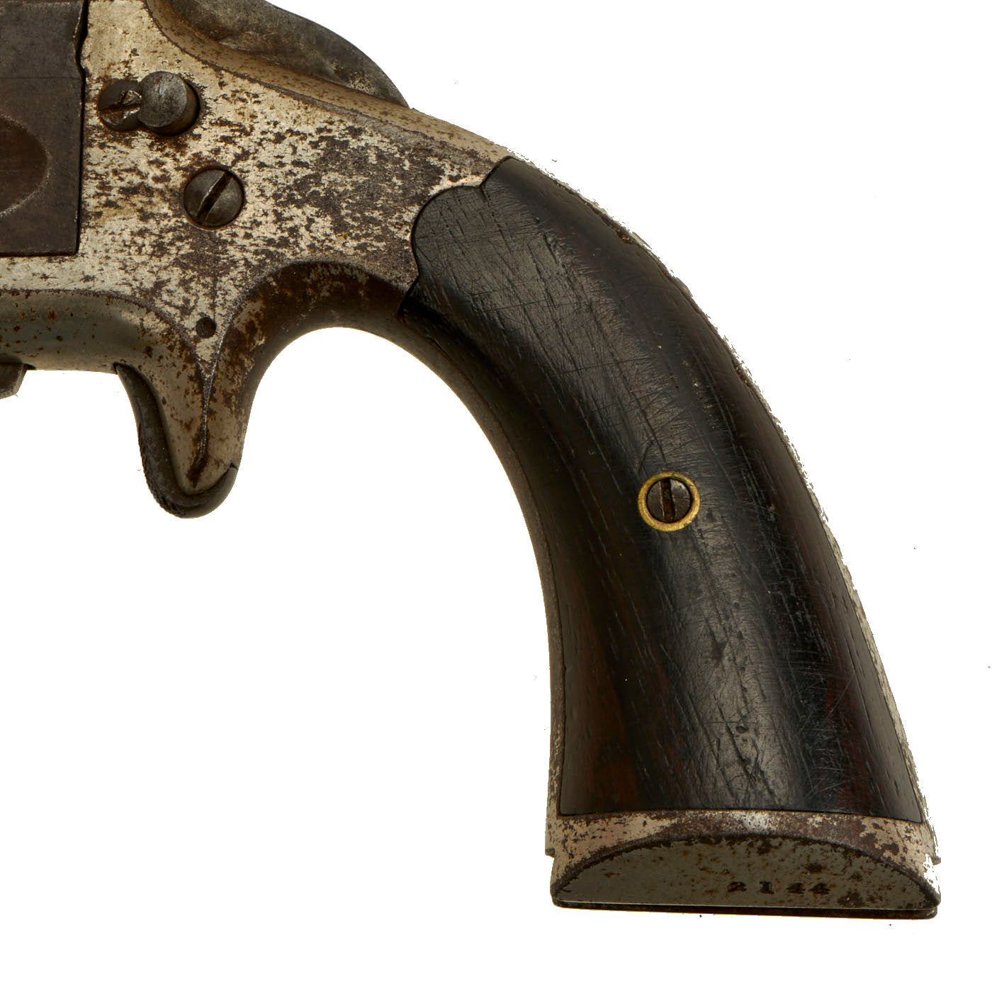 This example bears serial number 2144 on the bottom of the grip and on the barrel, visible with the breech is opened. It was originally made with a heavily blued barrel and nickel plated frame, with wooden grips. The side of the barrel has the correct patent marking, which is fully intact: