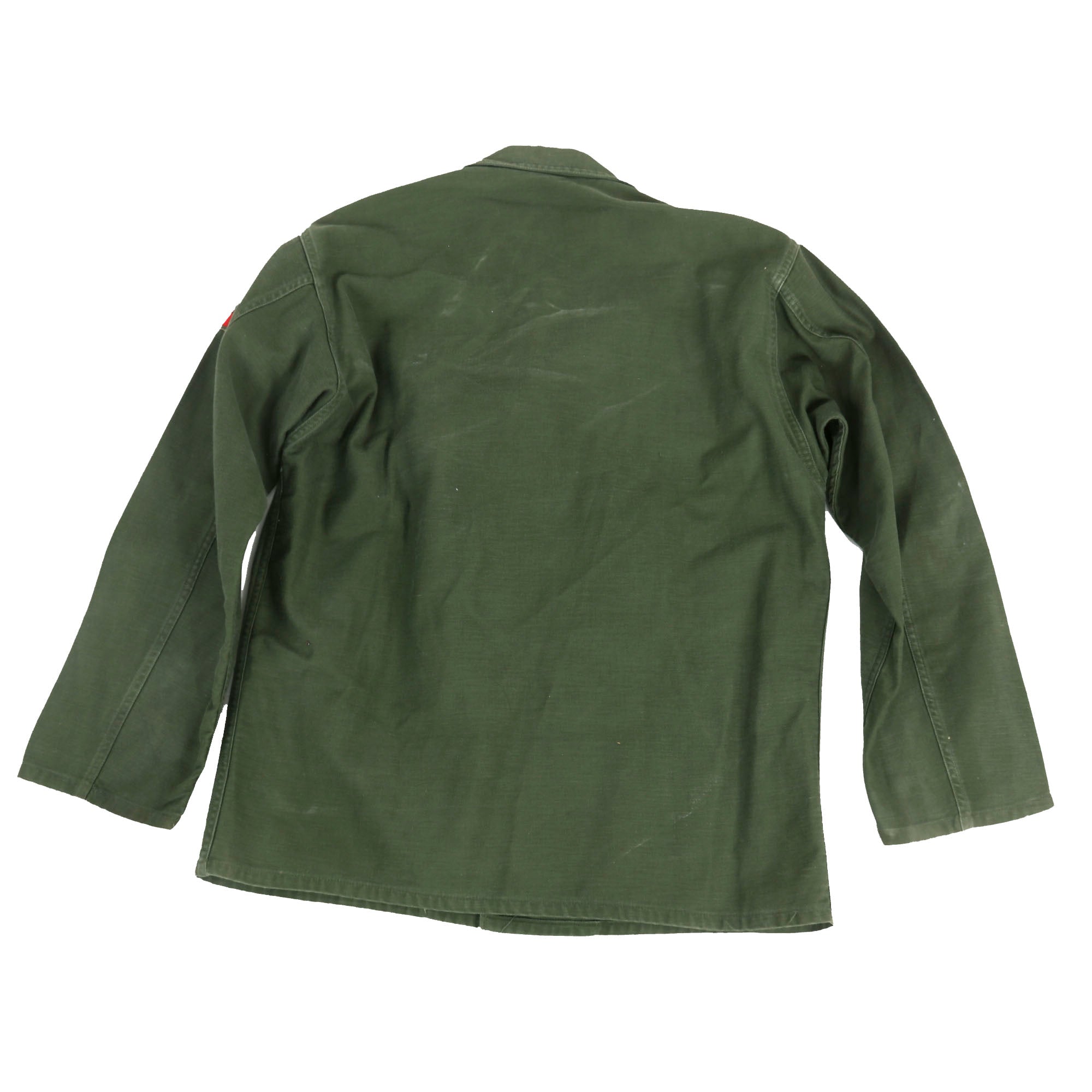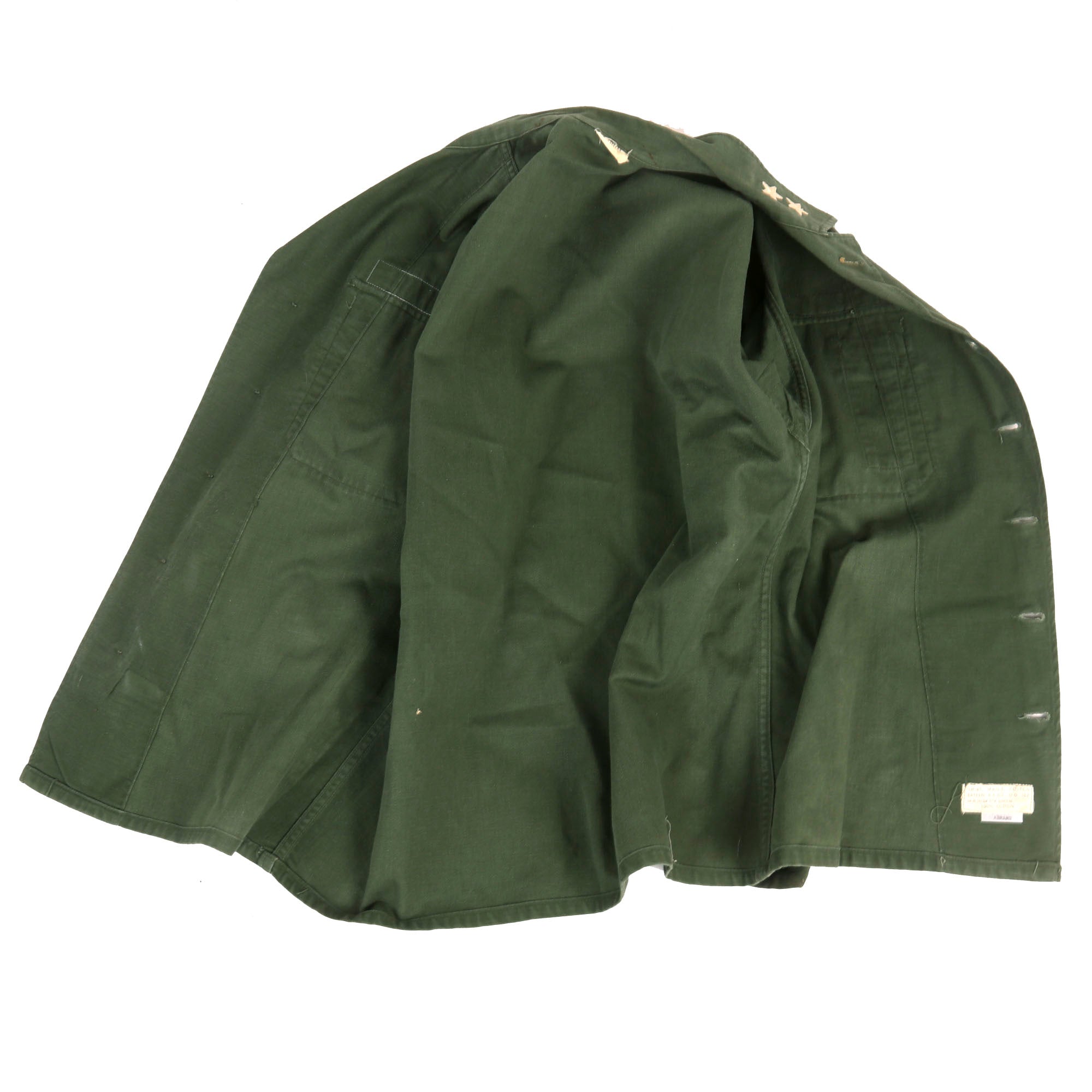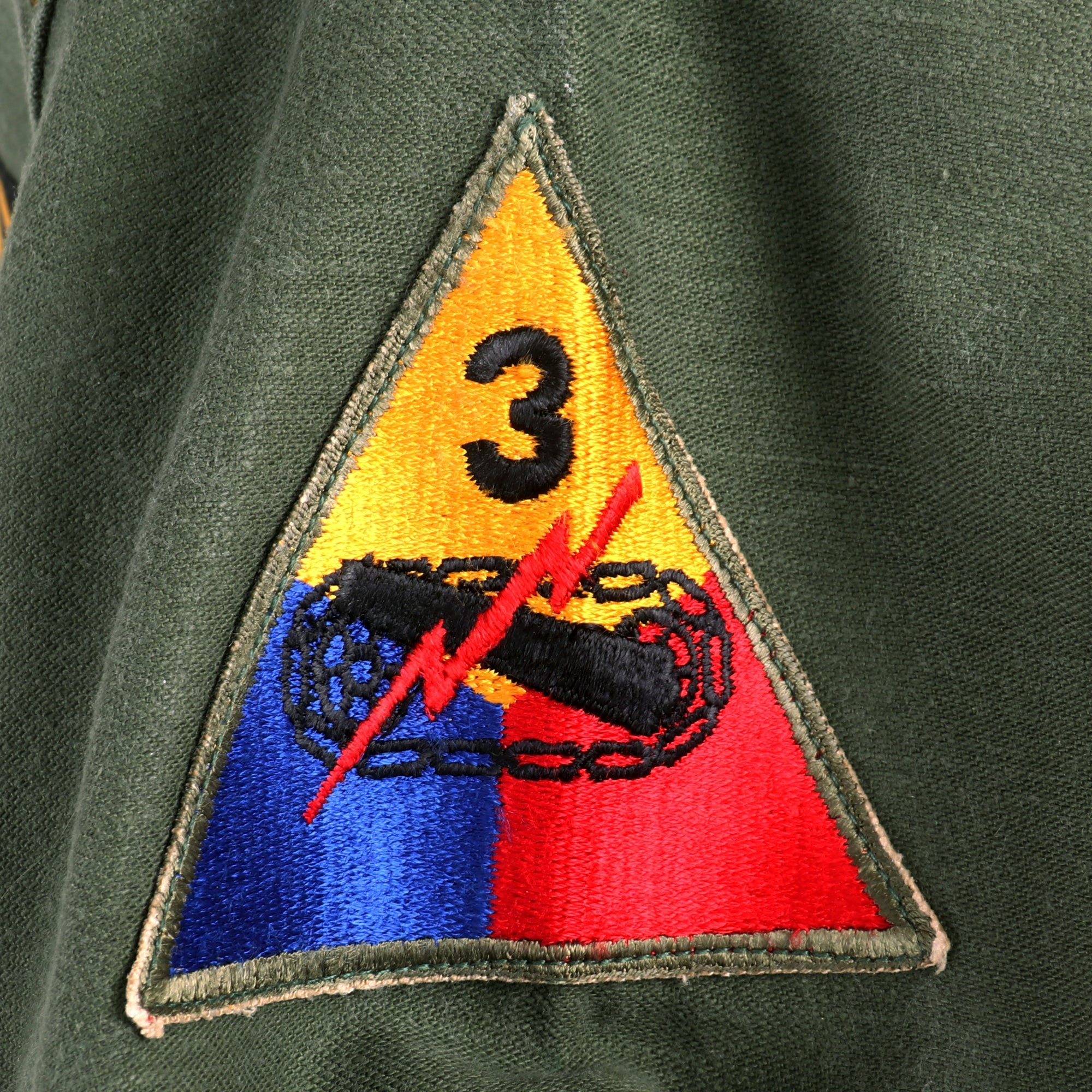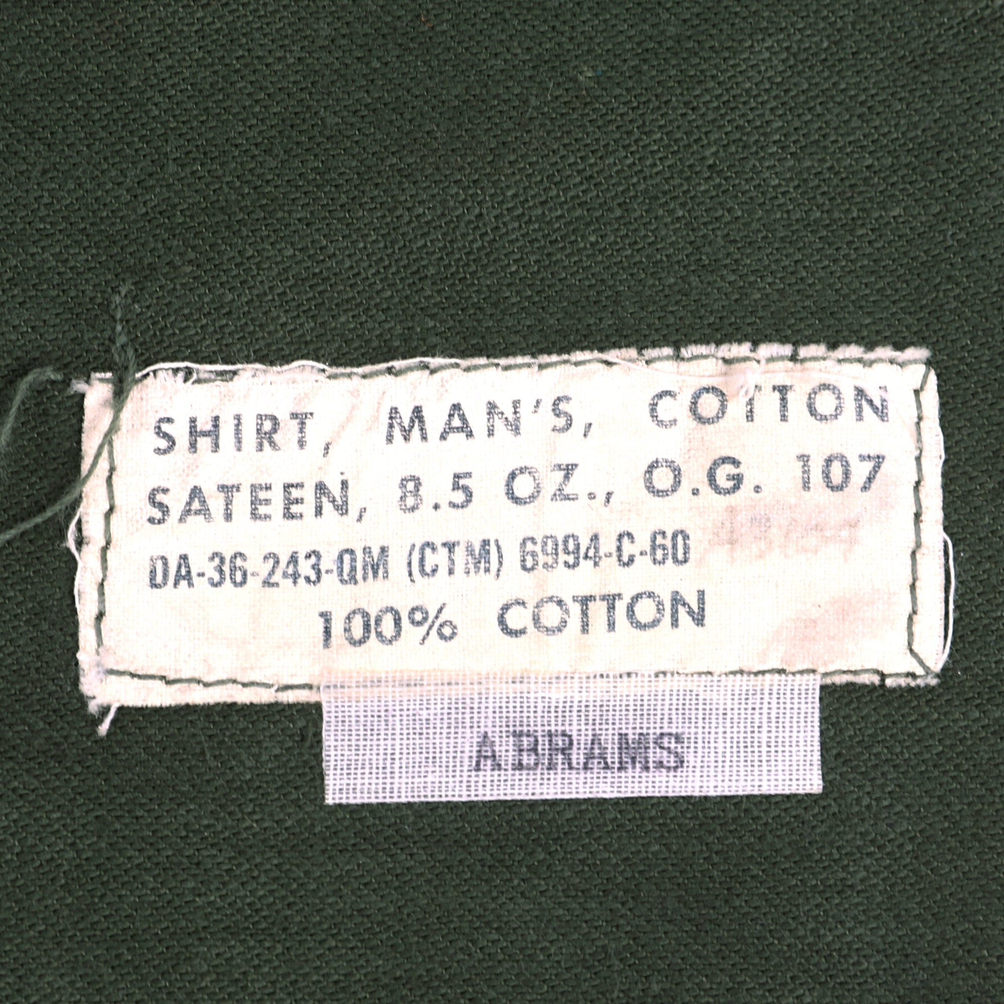 The uniform is the standard uniform of the period, the OG-107 Utility. The Shirt features Major General’s embroidered stars sewn on the collar, Black on White “ABRAMS” Name Tape, and Black/Yellow “US ARMY” tapes on the chest, while the left shoulder features a 3rd Armored Division Shoulder Sleeve Insignia. All insignia appears original to the shirt, with no signs of it having been added later. The shirt is marked on the collar: