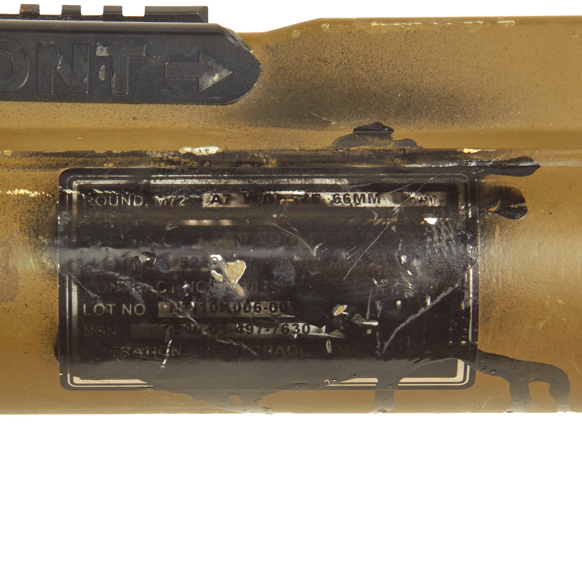 When a LAW has been fired and rendered inert by EOD, these are often used by military units as training aides. In order for this to happen, all original manufacture and nomenclature tags have to either be removed or painted over. This example was painted over with black paint but we were able to see M72 A7 on the original label. There are no dates or DODICs visible.
