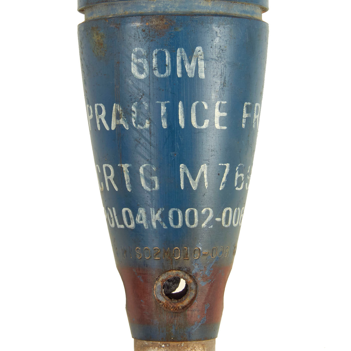 Consists of: M775 Fuze, Body, Obturating Ring (not present, only groove), Tube, Vent Holes, M27 Fins (undamaged), M702 Ignition Cartridge (inert).