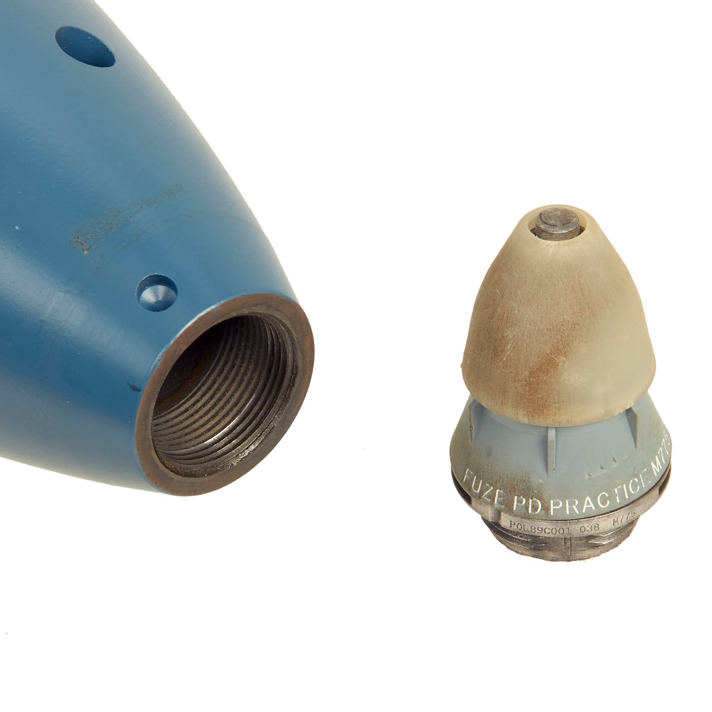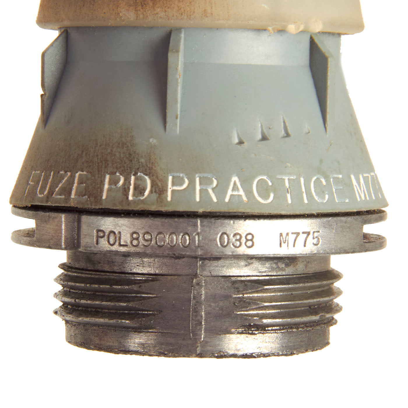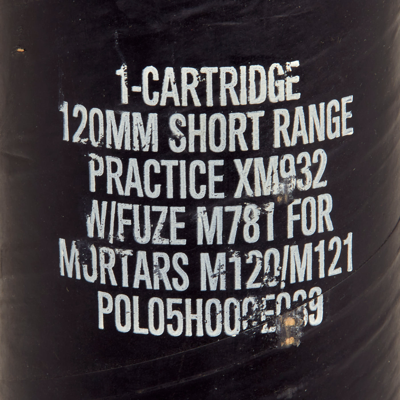 This mortar round was never intended to be used as an explosive device, and as mentioned, was used as a low cost, yet effective training tool. The round still retains all of its original arsenal marking and identifies this round as a 120M / PRACTICE SR / CRTRG XM932 / P0L05H00E039. The “05” in the beginning of the lot number indicates the year of manufacture. To complete the ensemble is the M775 Practice PD Fuze in undamaged condition.