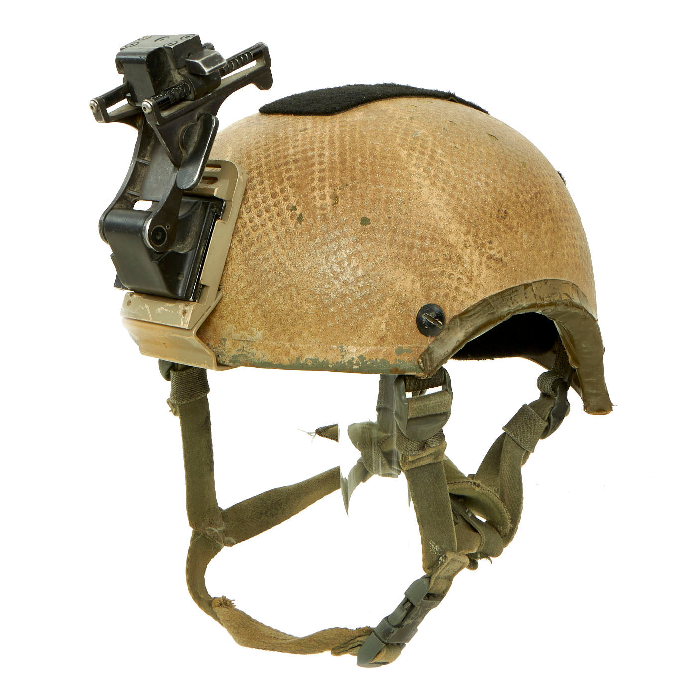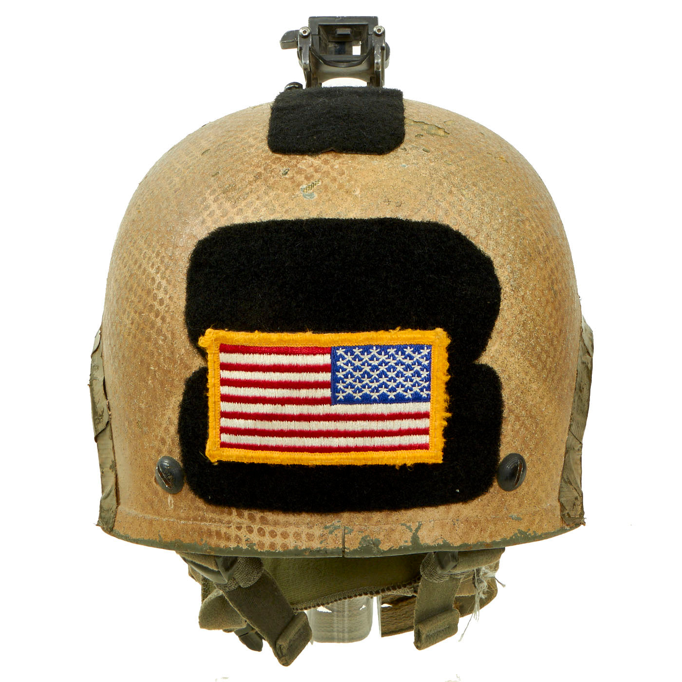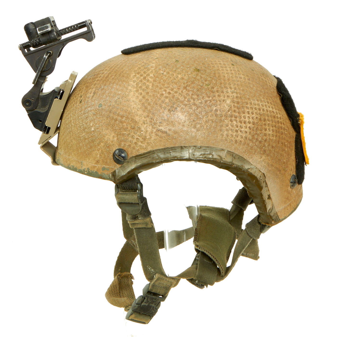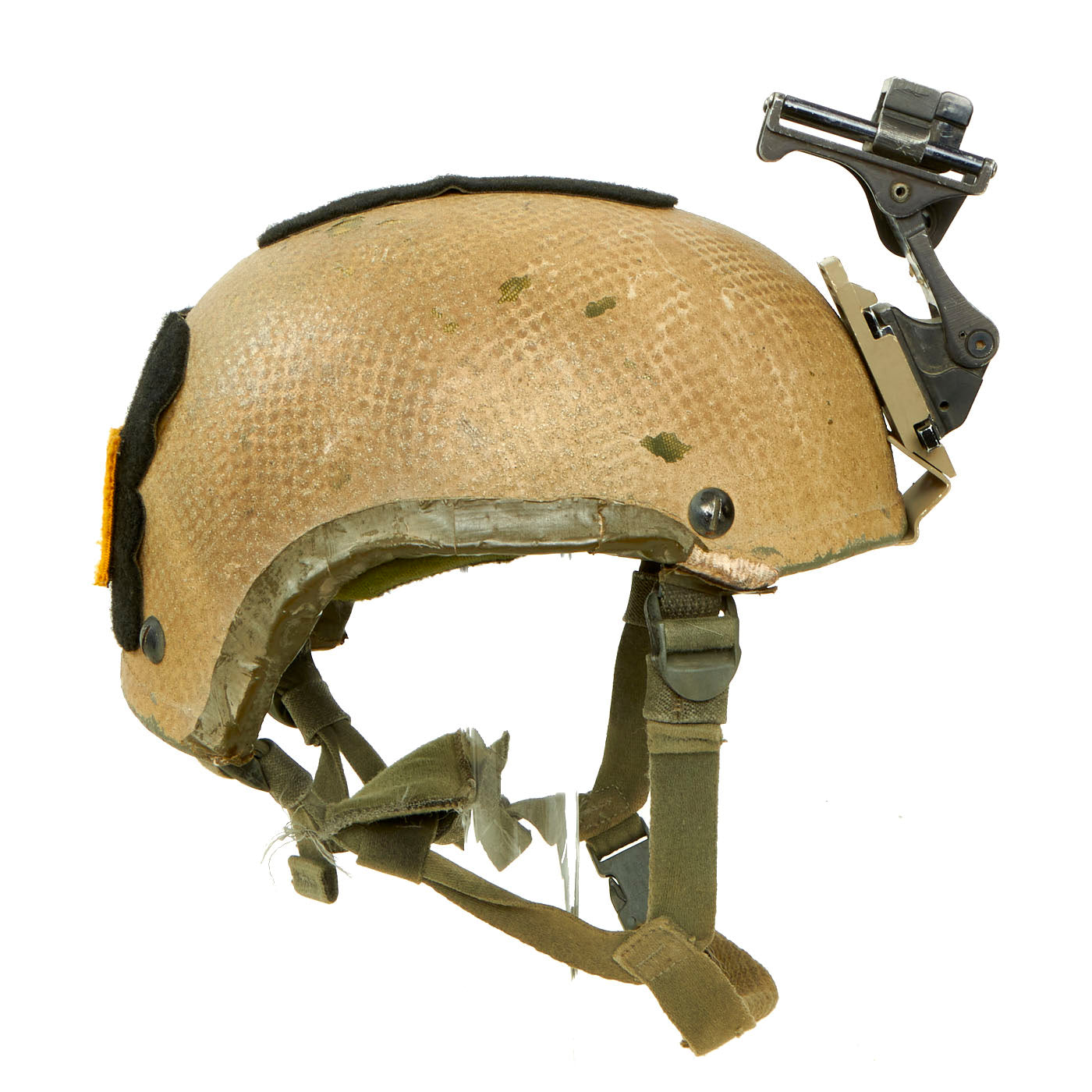 This example is an “early” model is it was done by hand, which was a very common sight to see in the beginning of the GWoT campaign. The helmet is complete and in beautiful condition, it even has the more comfortable gel pads instead of the issued helmet pads. The NVG SL3 (missing elbow) is fully functional and able to be removed from the baseplate. The desert camouflage is spray paint applied, which is the easiest method in which we applied camouflage. To add the “designs” we would use our mesh laundry bags or sections of cammie netting. This helmet was camouflaged by way of the mesh laundry bag, which can be identified by the symmetrical smaller holes.