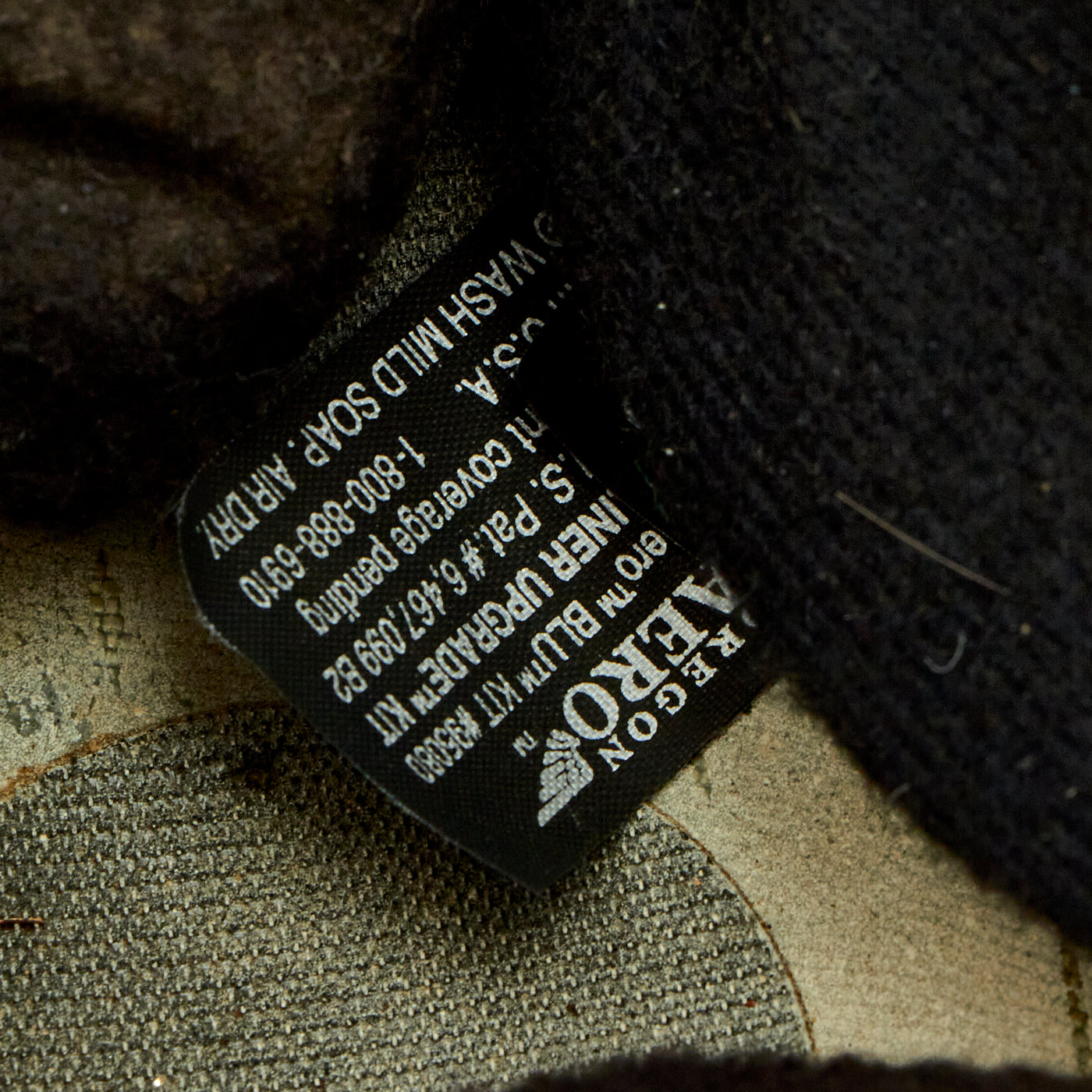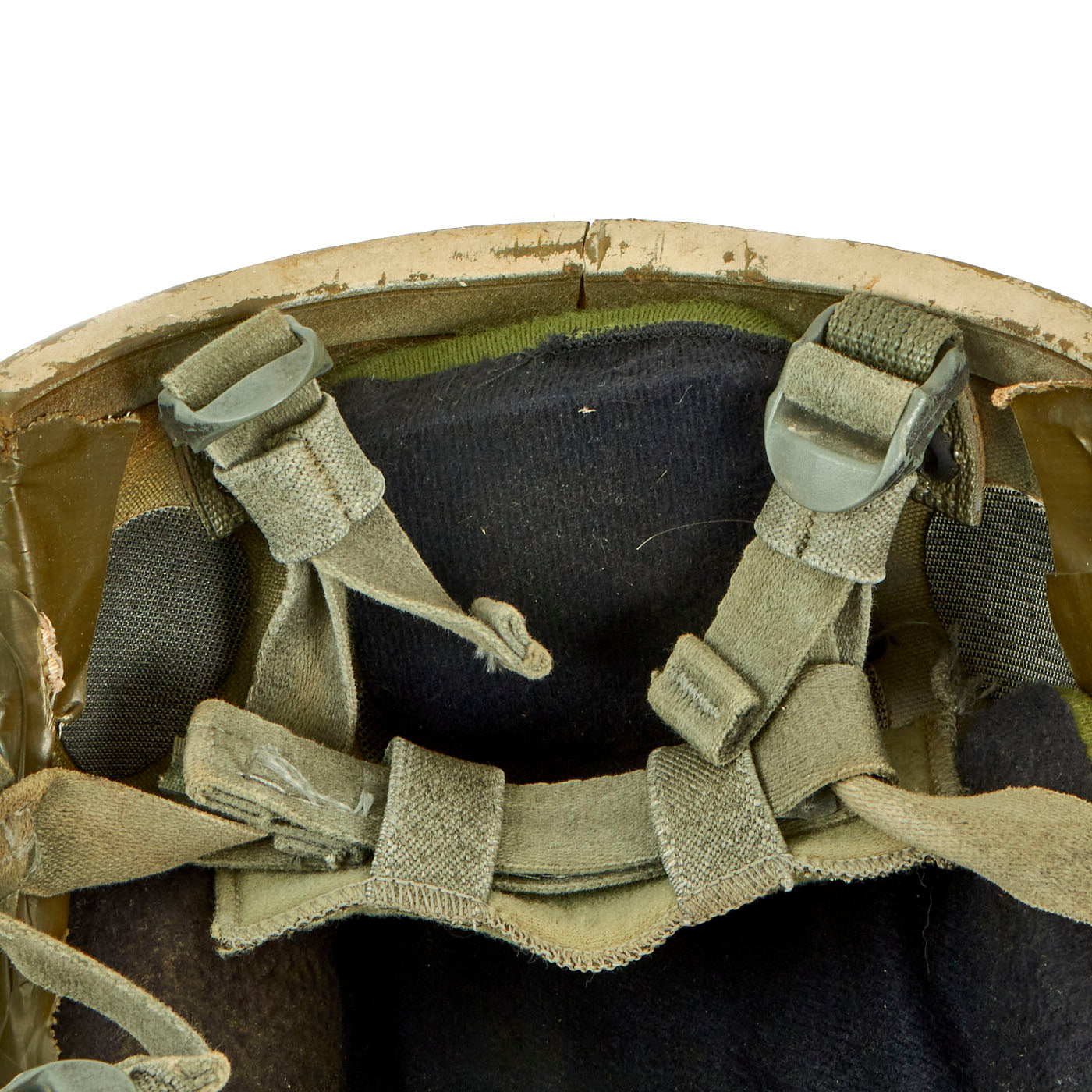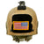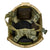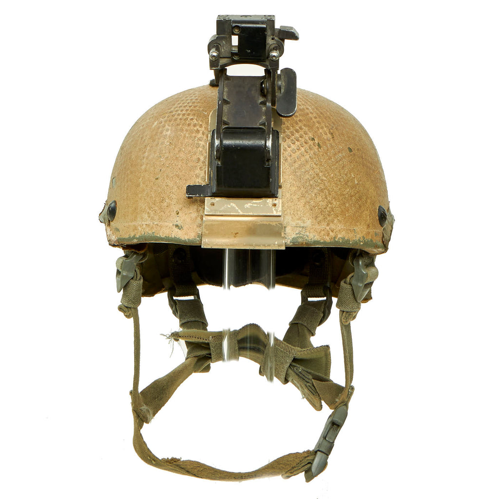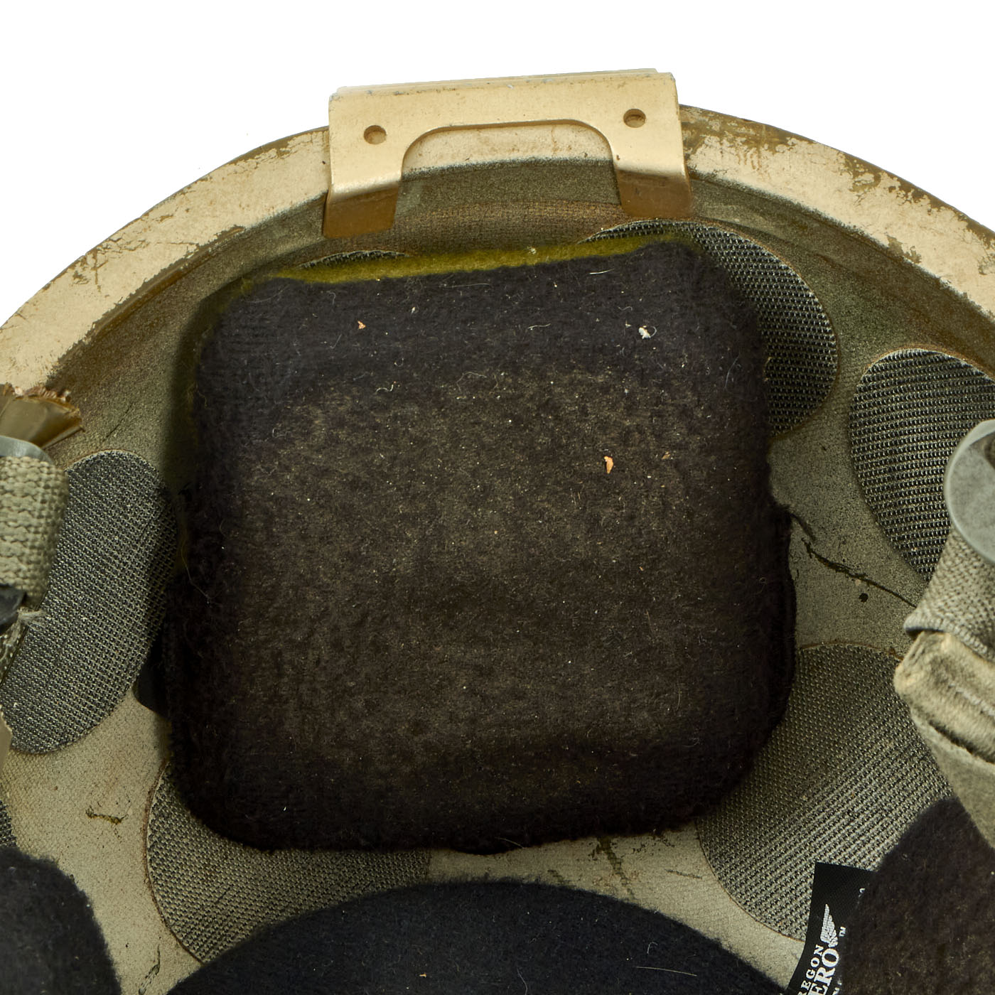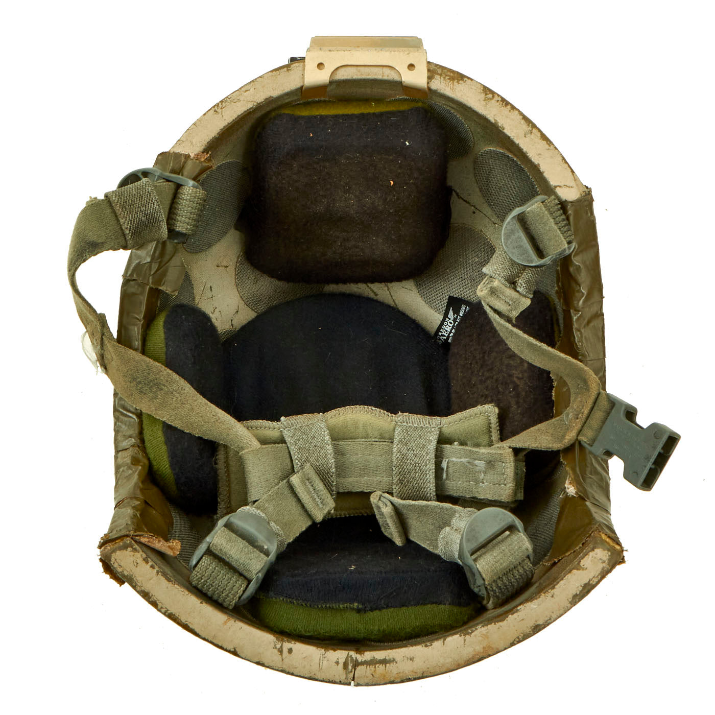 This example is an “early” model is it was done by hand, which was a very common sight to see in the beginning of the GWoT campaign. The helmet is complete and in beautiful condition, it even has the more comfortable gel pads instead of the issued helmet pads. The NVG SL3 (missing elbow) is fully functional and able to be removed from the baseplate. The desert camouflage is spray paint applied, which is the easiest method in which we applied camouflage. To add the “designs” we would use our mesh laundry bags or sections of cammie netting. This helmet was camouflaged by way of the mesh laundry bag, which can be identified by the symmetrical smaller holes.