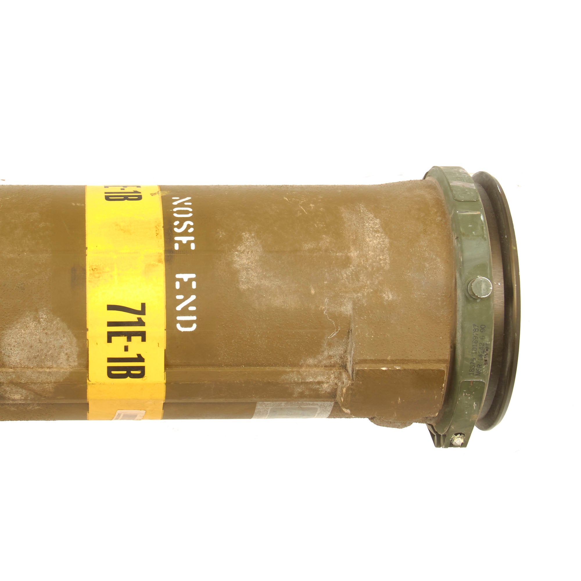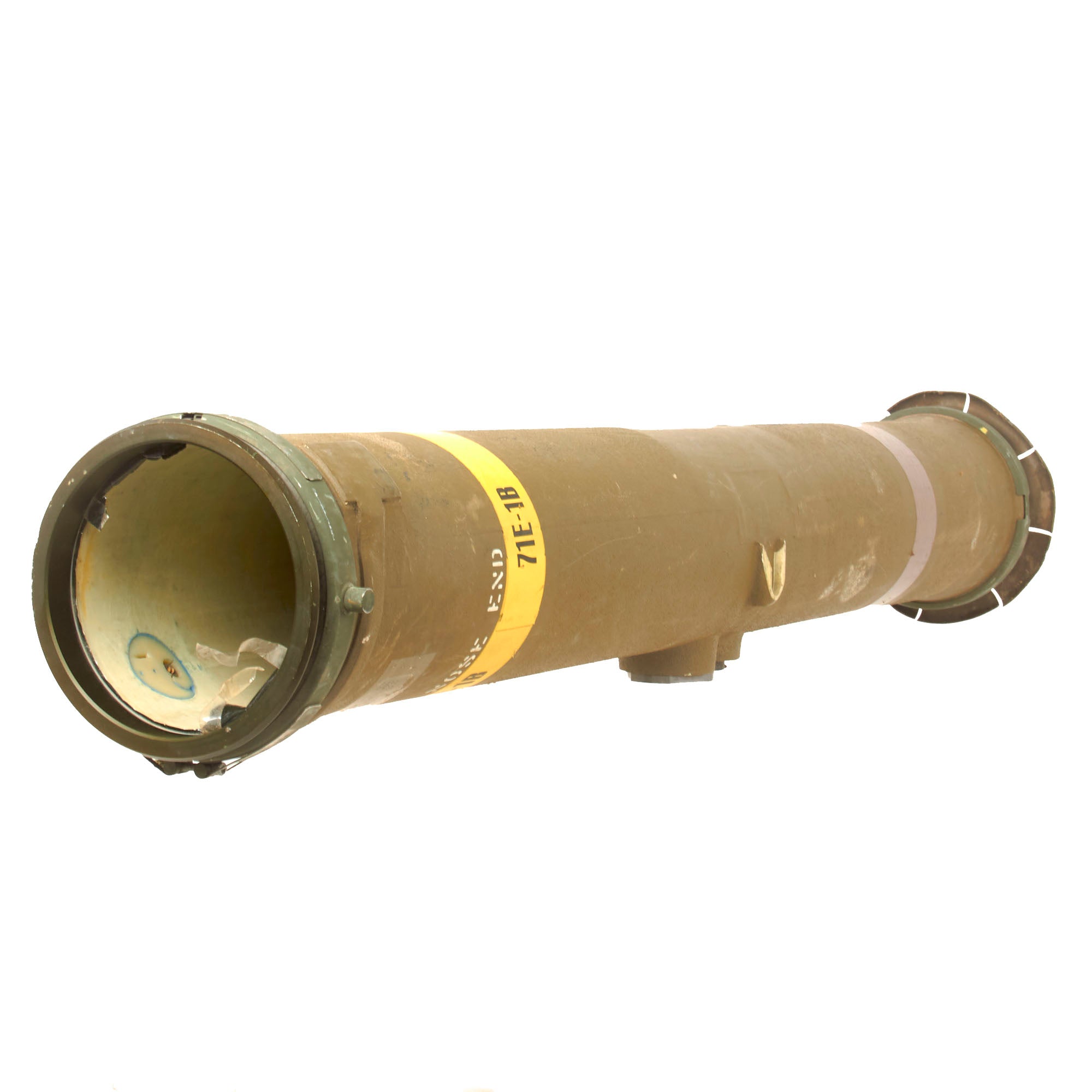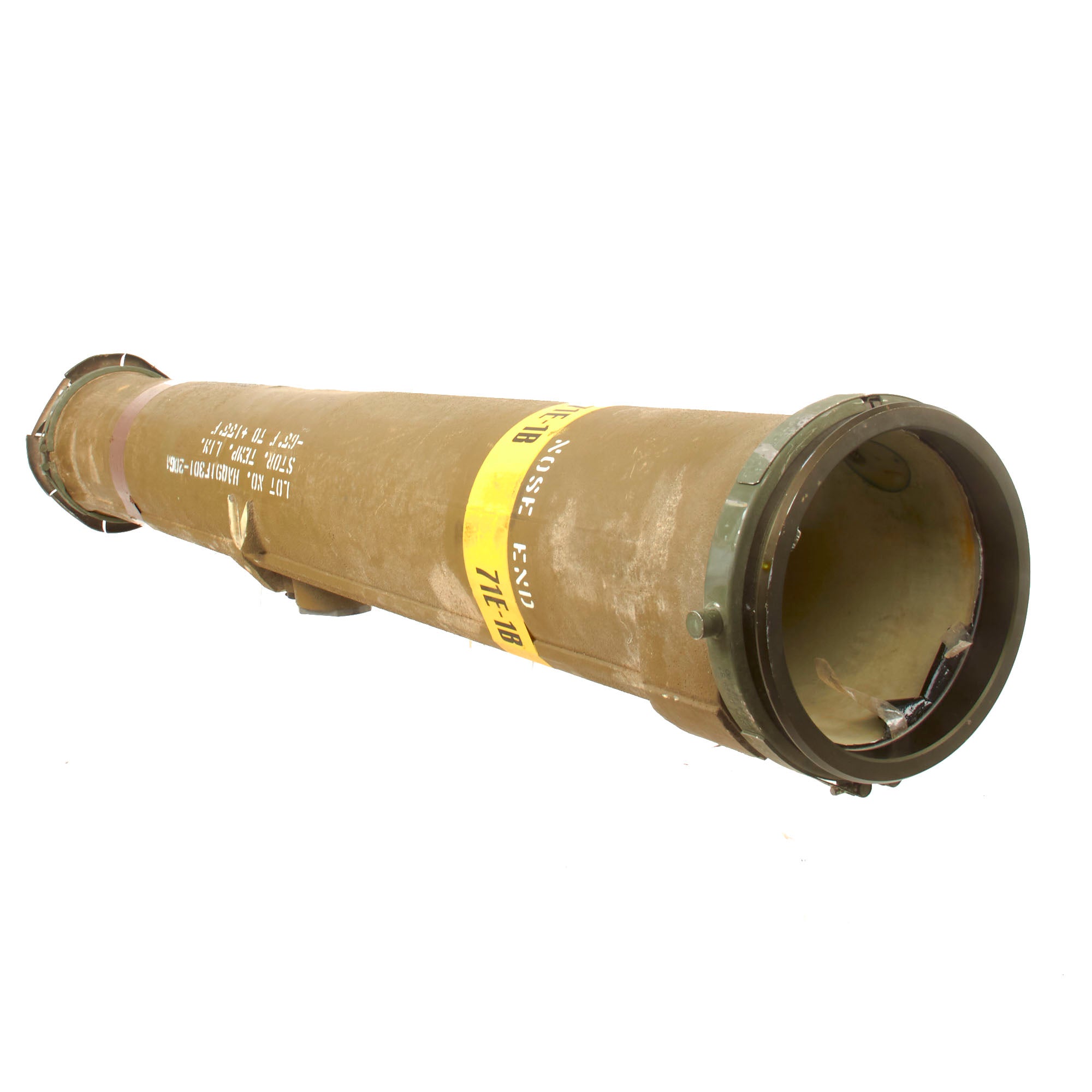 There is a yellow band around the circumference reading 71E-1B, its designation. The side of the launcher is also stamped: