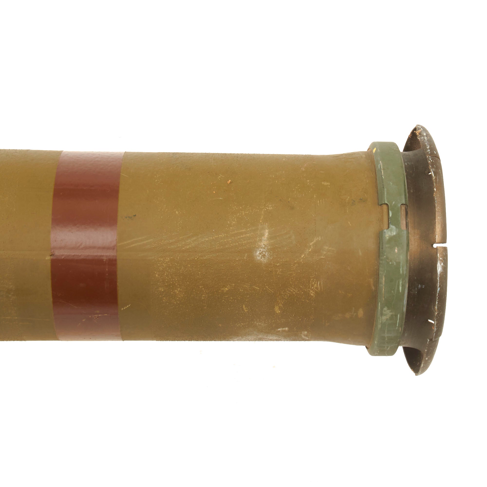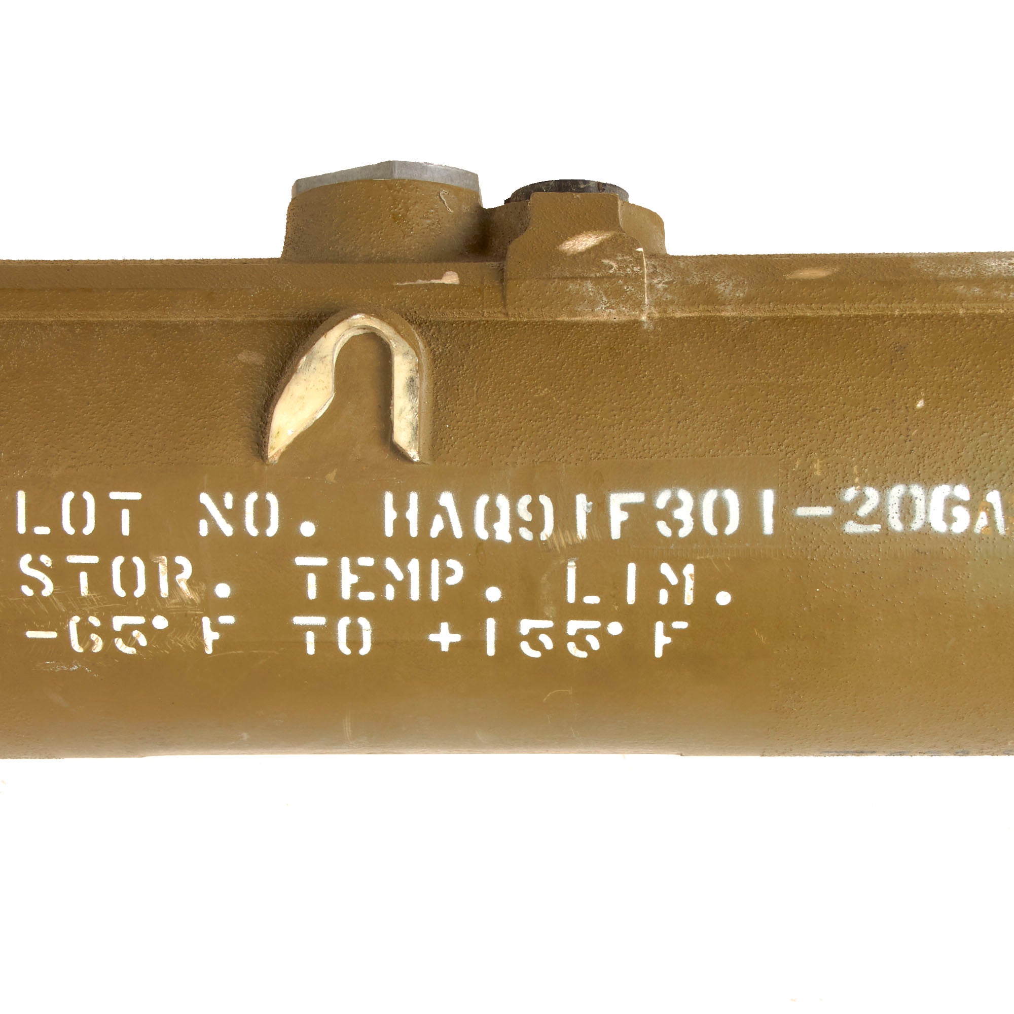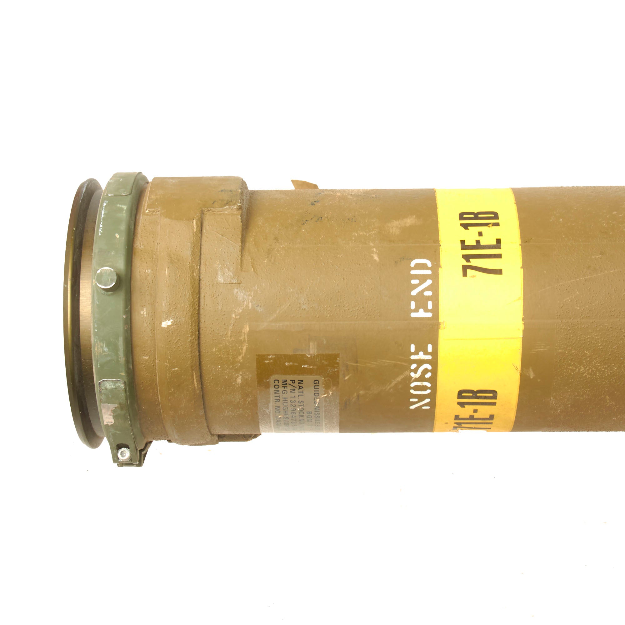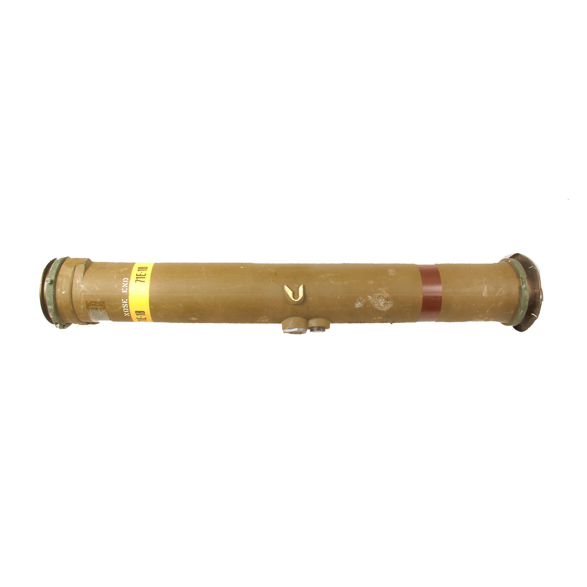 There is a yellow band around the circumference reading 71E-1B, its designation. The side of the launcher is also stamped: