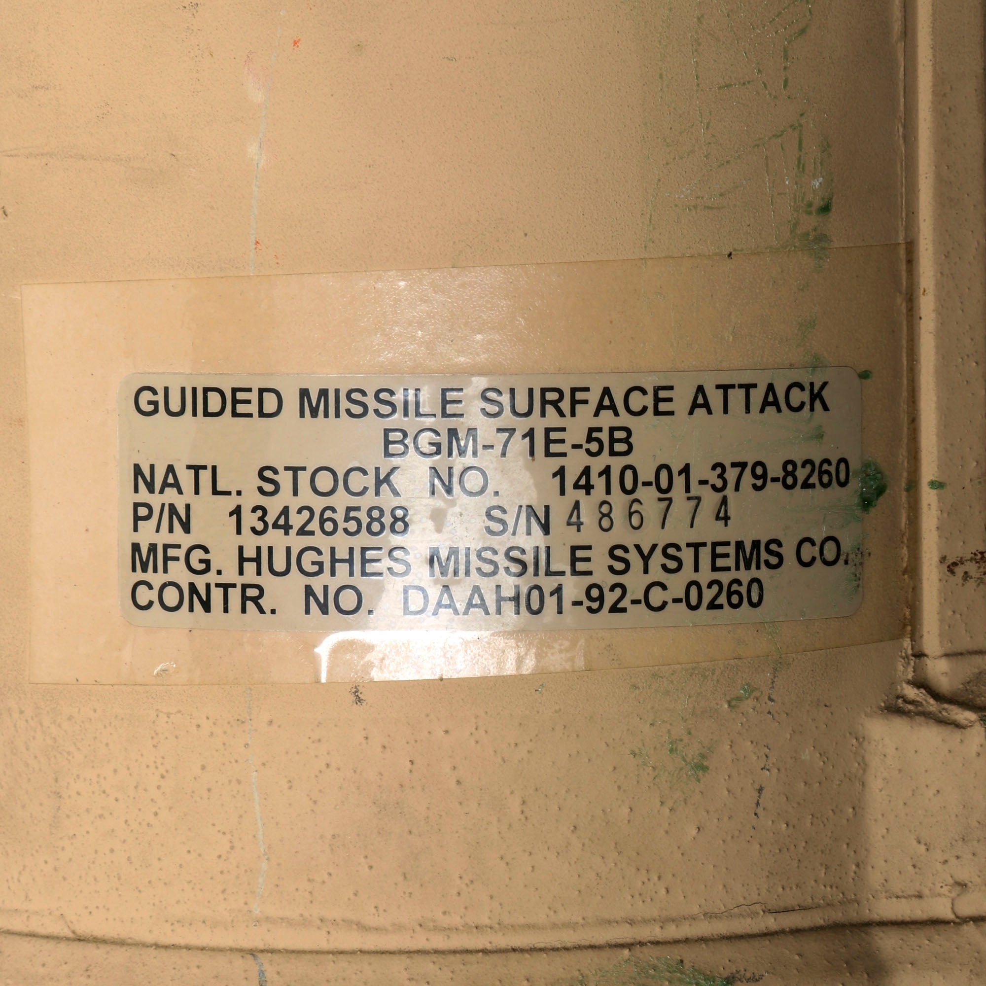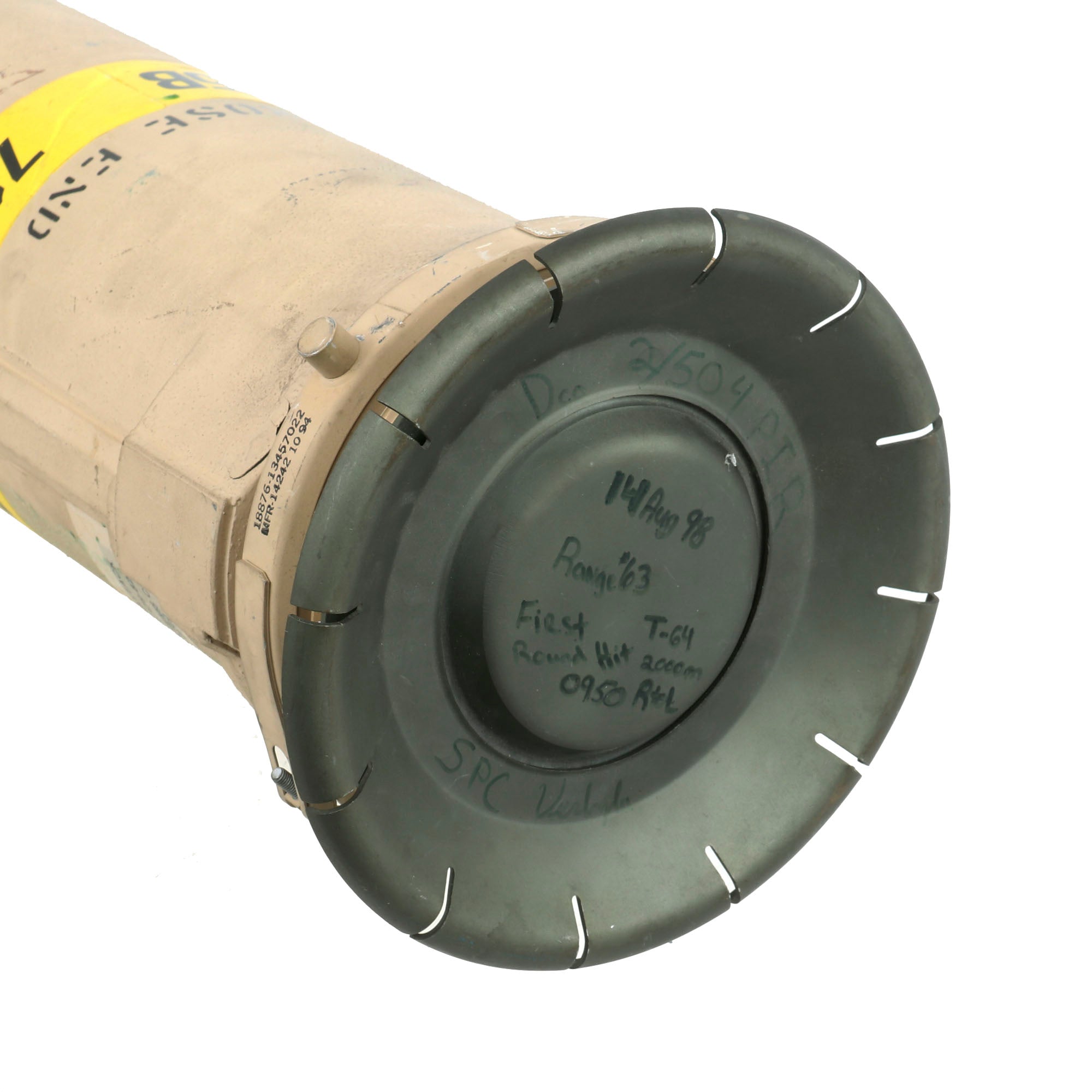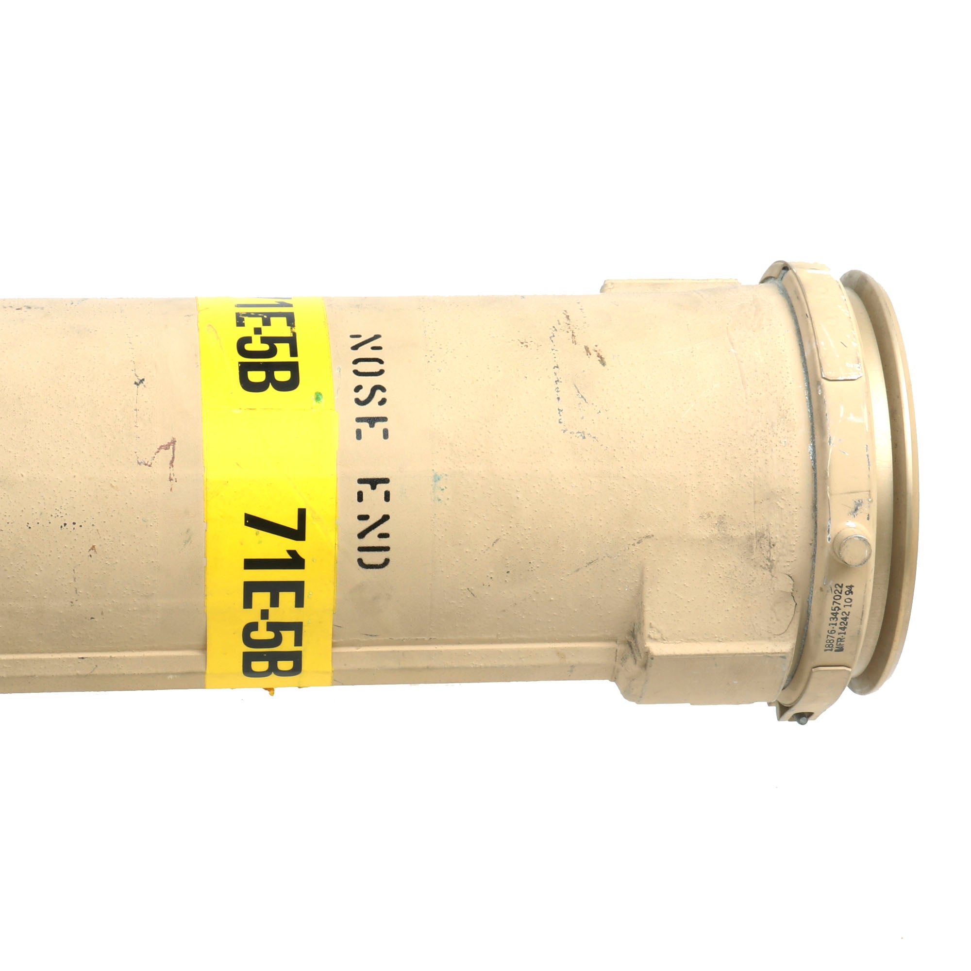 There is a yellow band around the circumference reading 71E-5B, its designation. The side of the launcher is also stamped: