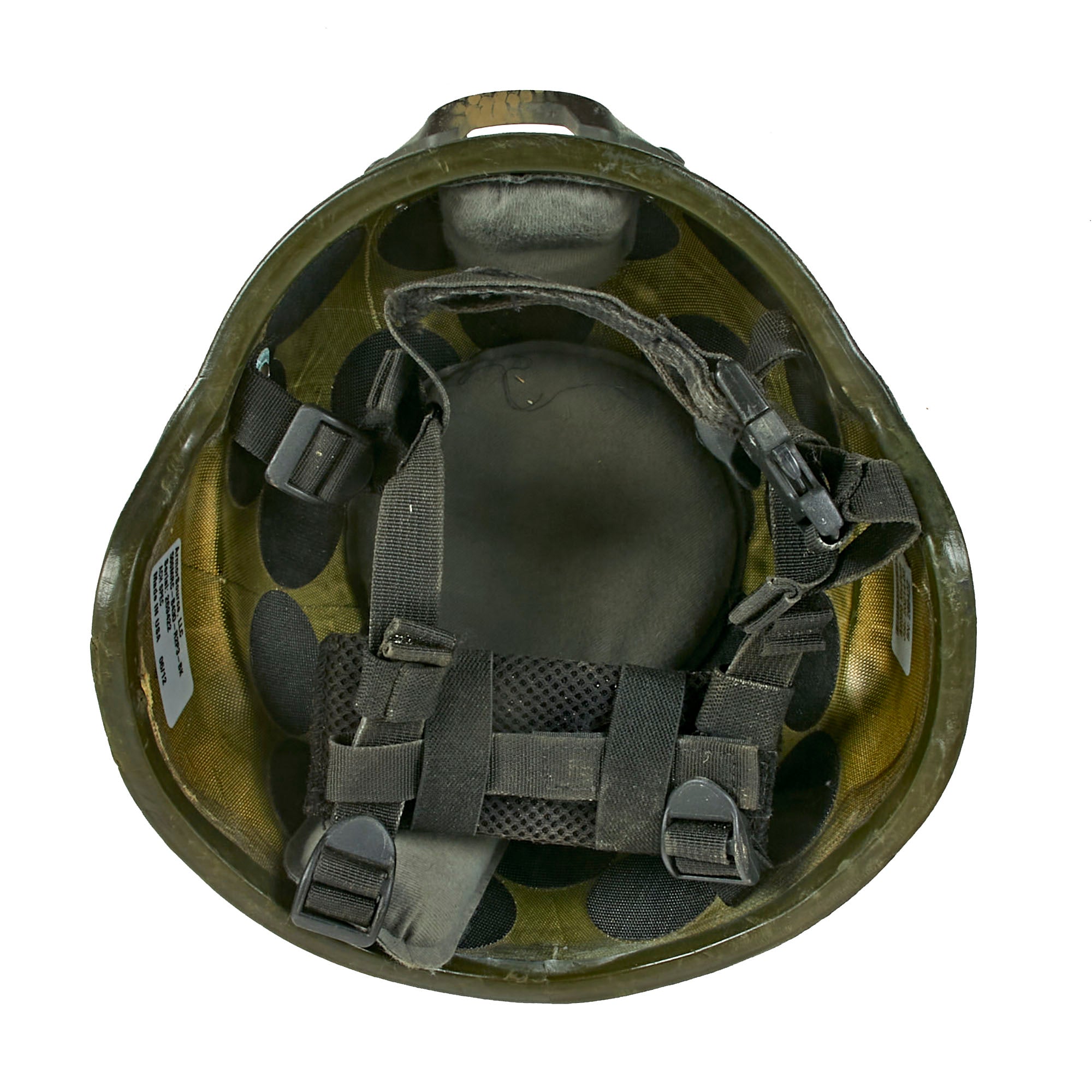 The helmet retains its original liner which is in great working order, as well as the accessory mount to the front. The helmet retains both labels: