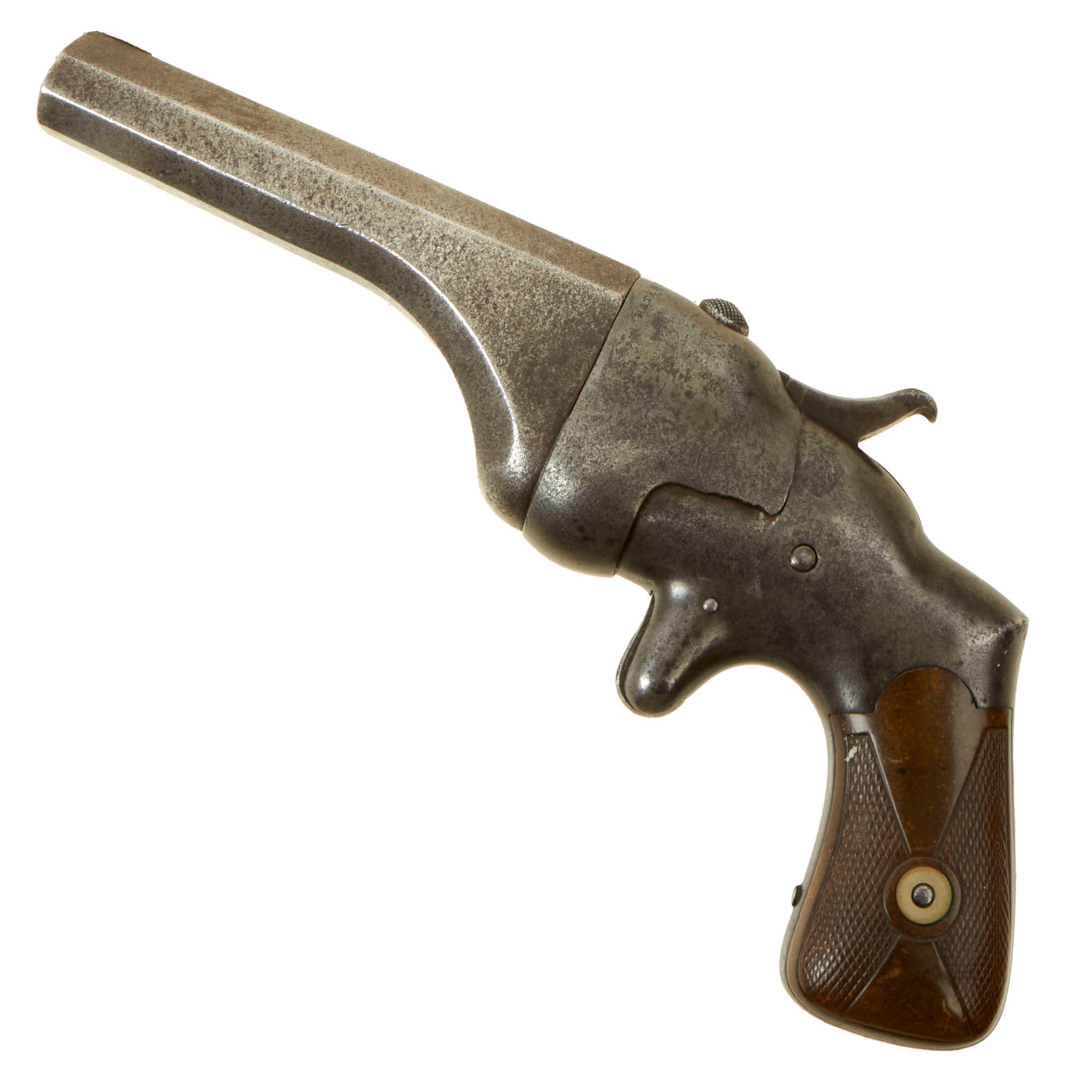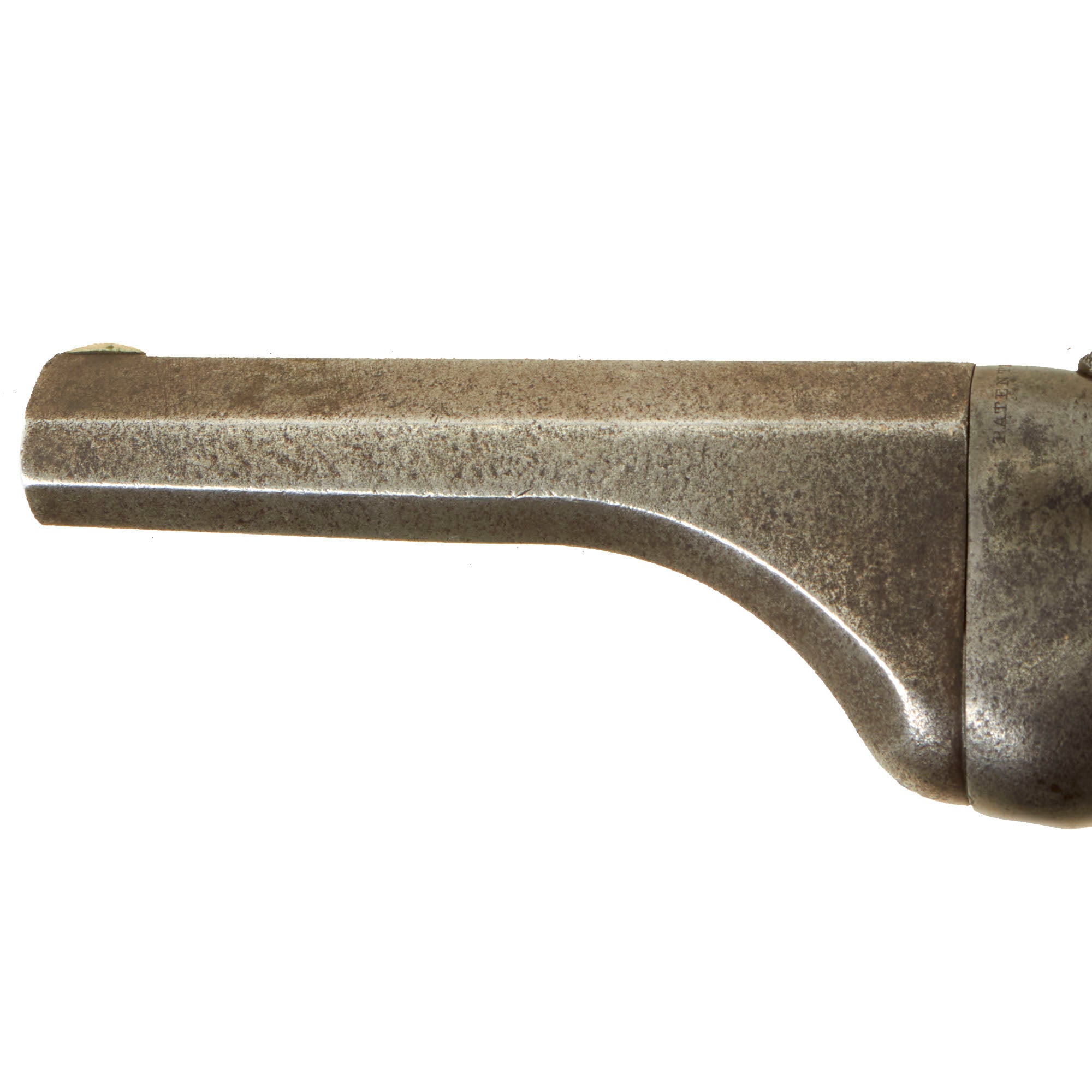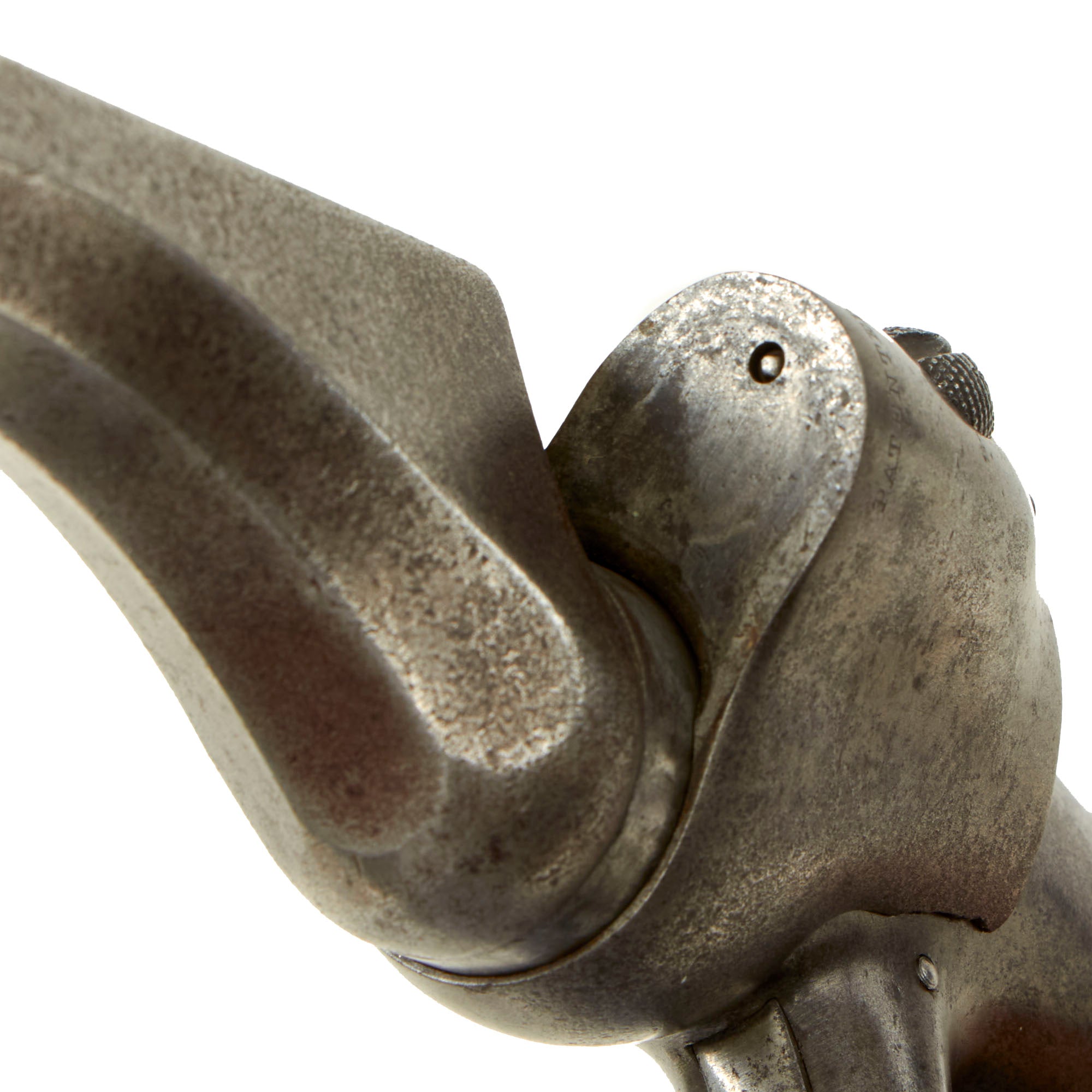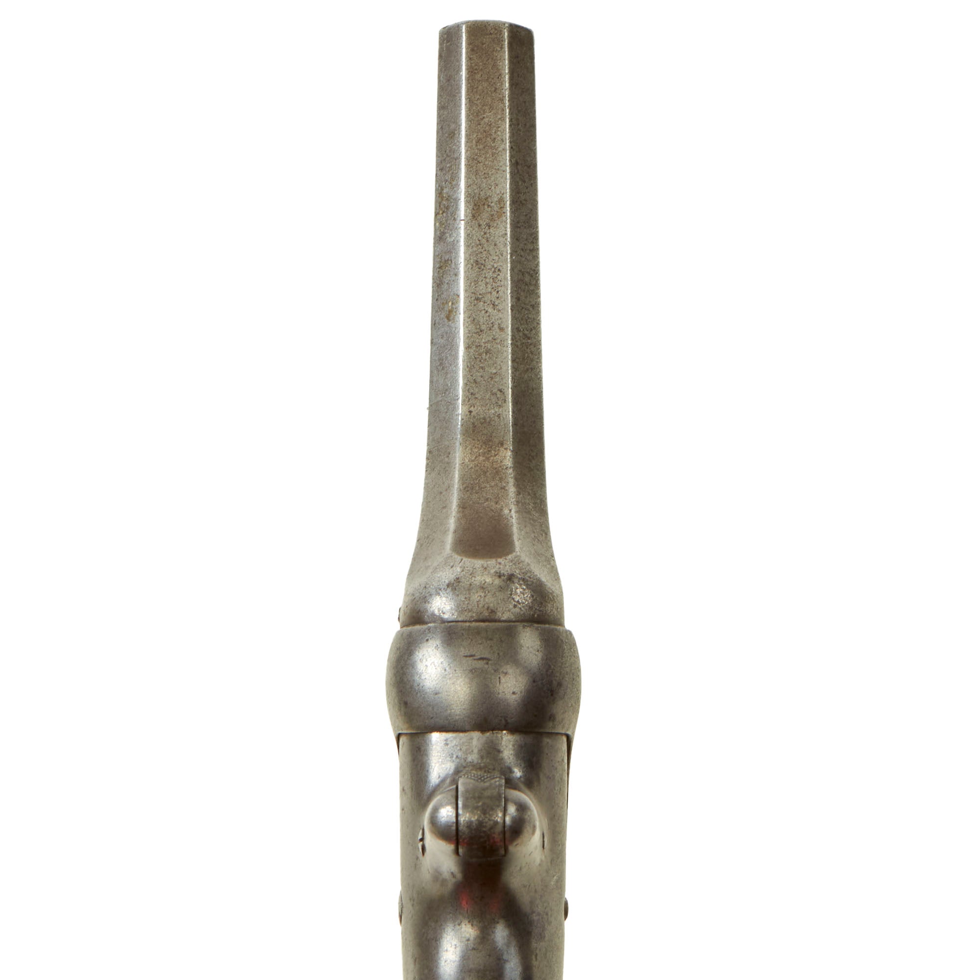 The story goes that Doc Holiday's part time girlfriend, Big Nose Kate, once drilled some gambler a new belly button with one of these powerful pistols. Using Hammond's "Bulldog" patent, these were made by the Connecticut Arms and Manufacturing Company. Records show production was between 1865 and 1868 and that total production reached fewer than 8,000 units. We originally thought these were produced into the 1870s, however per a historian customer, Connecticut Arms ceased production in 1868 following a mortgage default. This was the result of poor sales, resulting in a large unsold surplus, so the pistols continued to be sold as new through the 1880s, even though they were made over a decade earlier.
