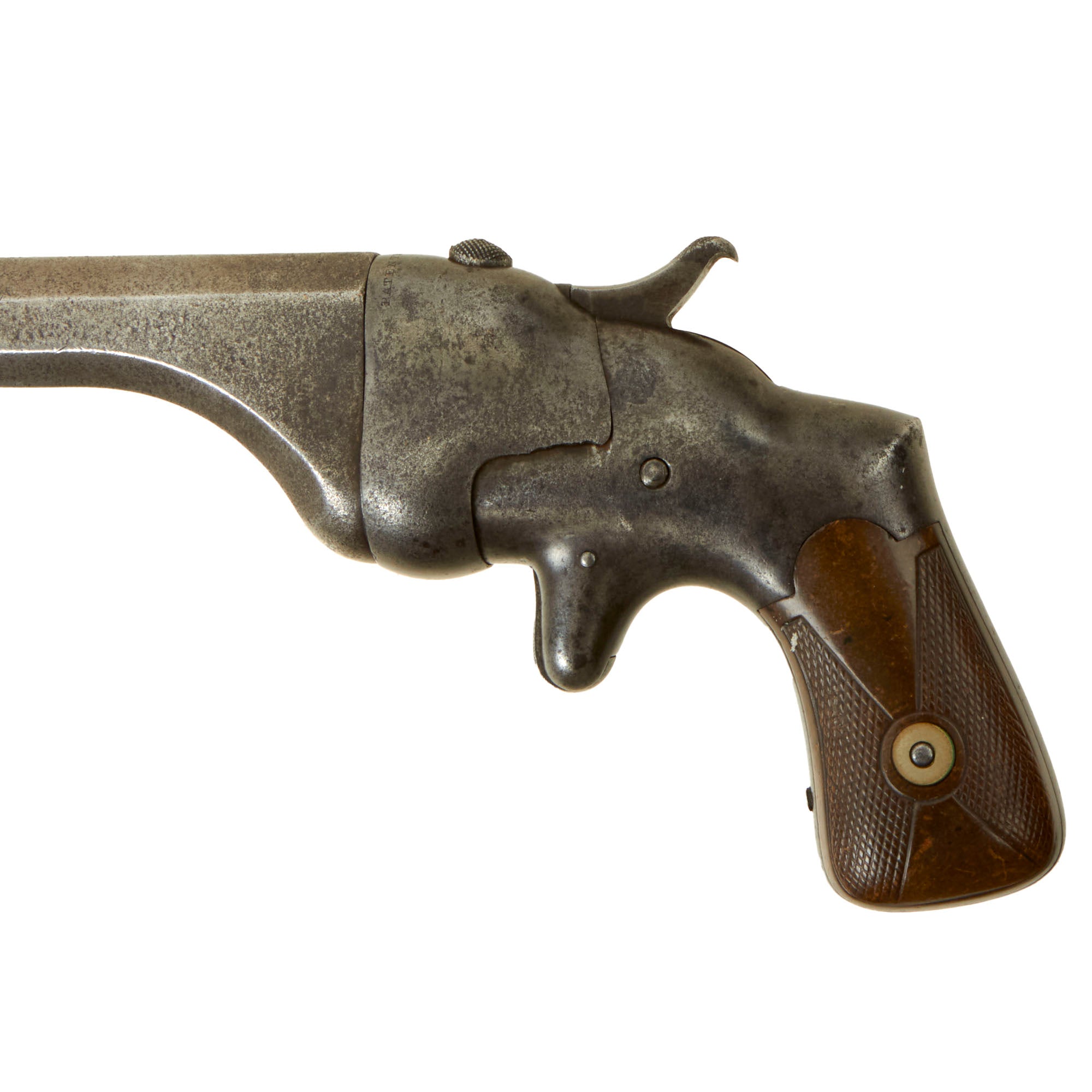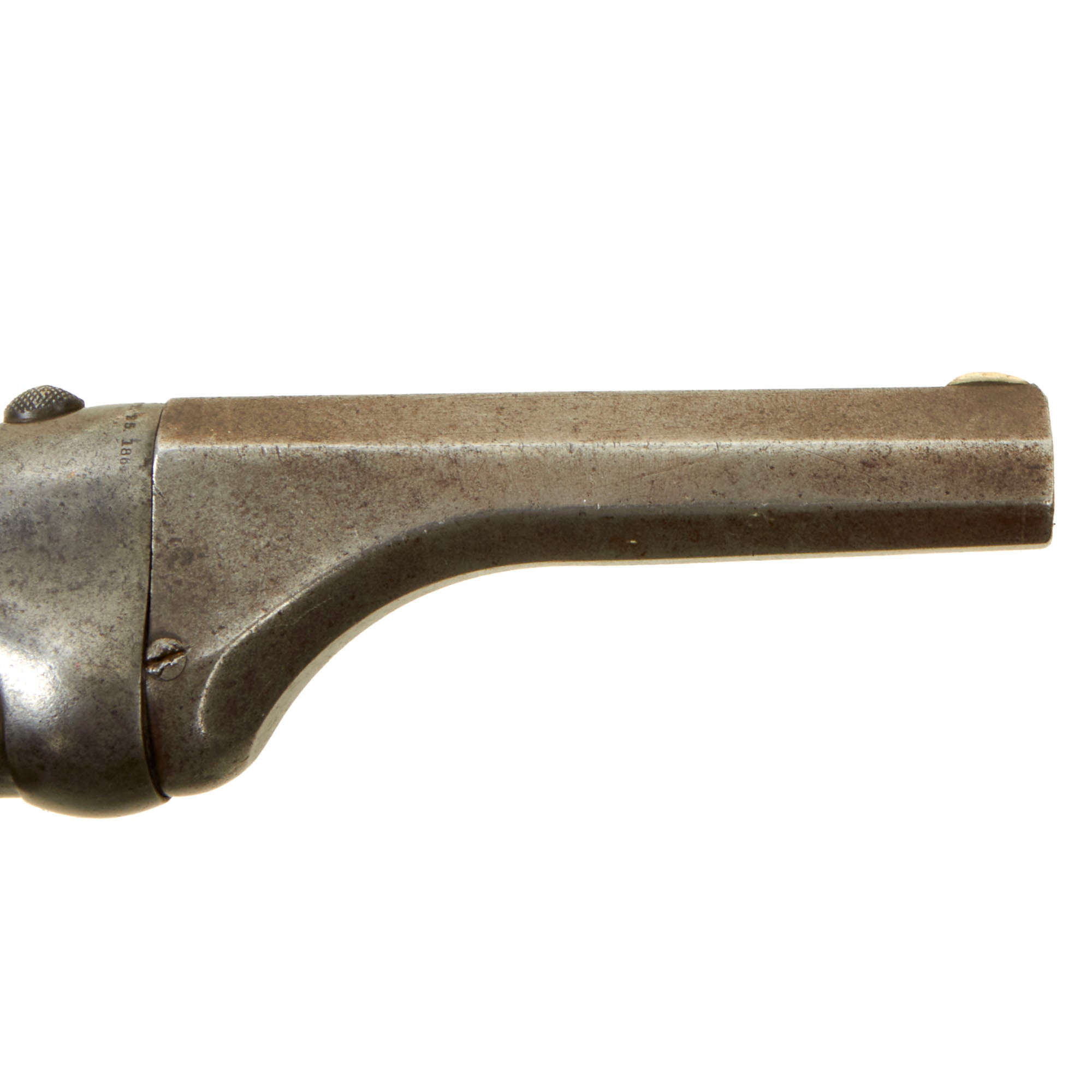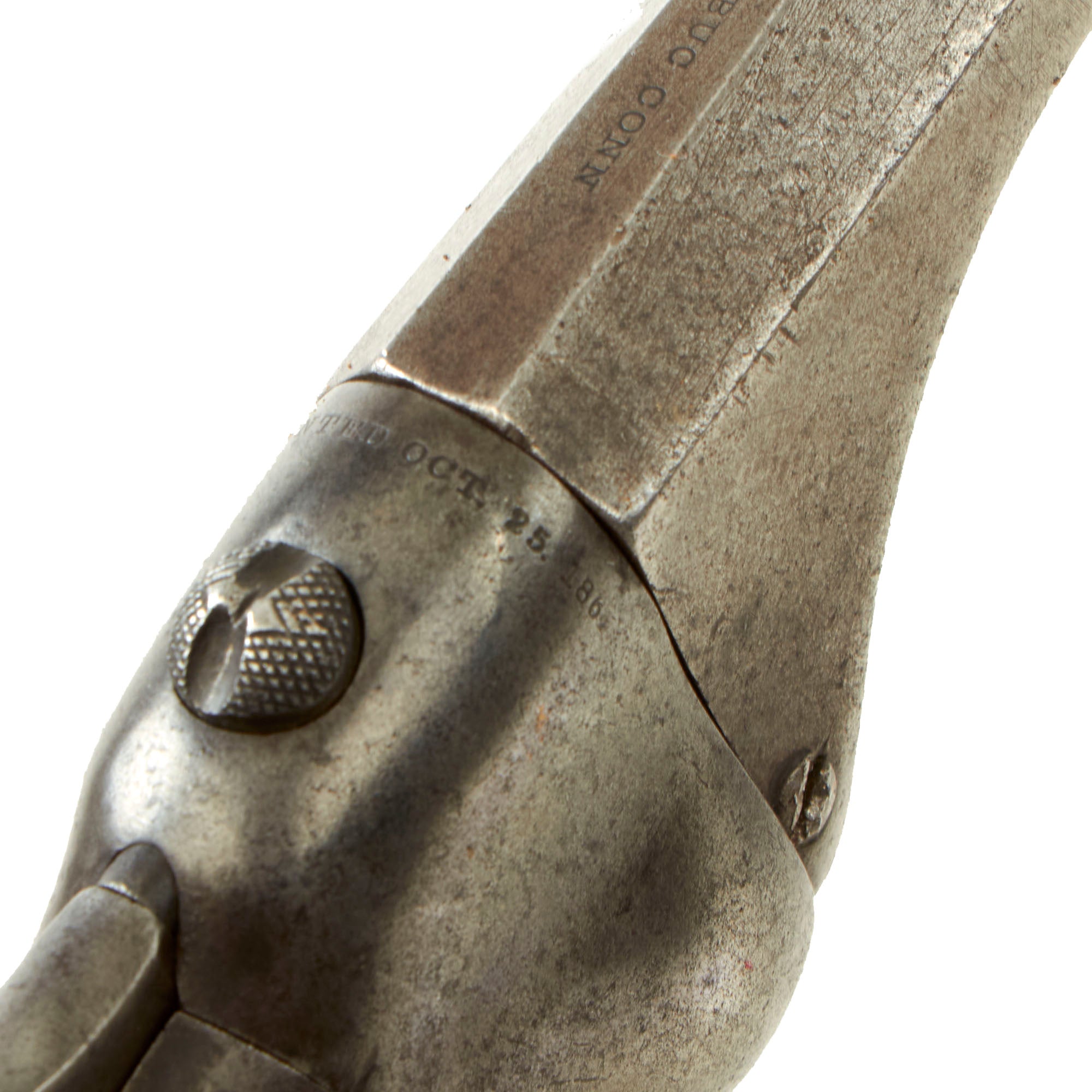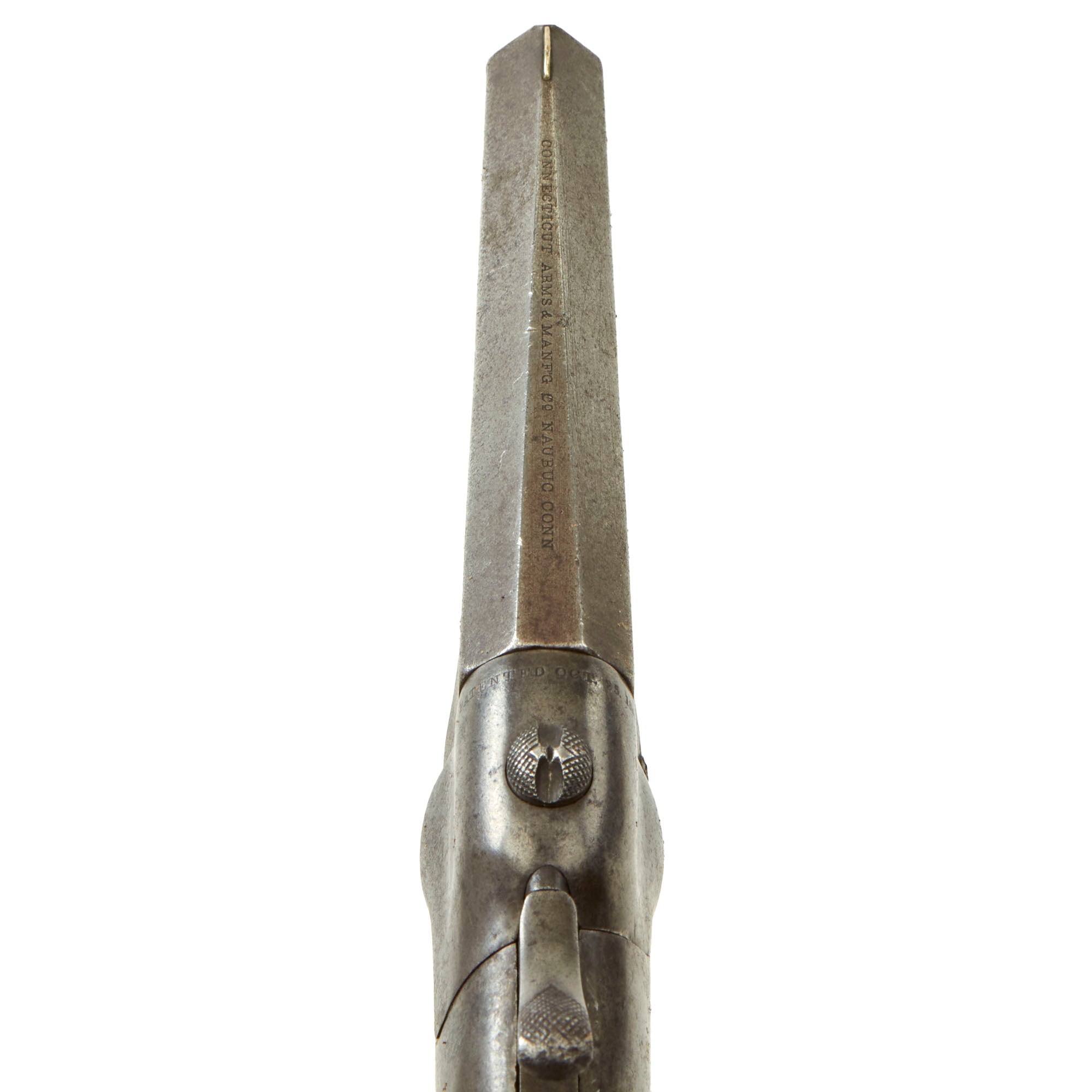 The story goes that Doc Holiday's part time girlfriend, Big Nose Kate, once drilled some gambler a new belly button with one of these powerful pistols. Using Hammond's "Bulldog" patent, these were made by the Connecticut Arms and Manufacturing Company. Records show production was between 1865 and 1868 and that total production reached fewer than 8,000 units. We originally thought these were produced into the 1870s, however per a historian customer, Connecticut Arms ceased production in 1868 following a mortgage default. This was the result of poor sales, resulting in a large unsold surplus, so the pistols continued to be sold as new through the 1880s, even though they were made over a decade earlier.