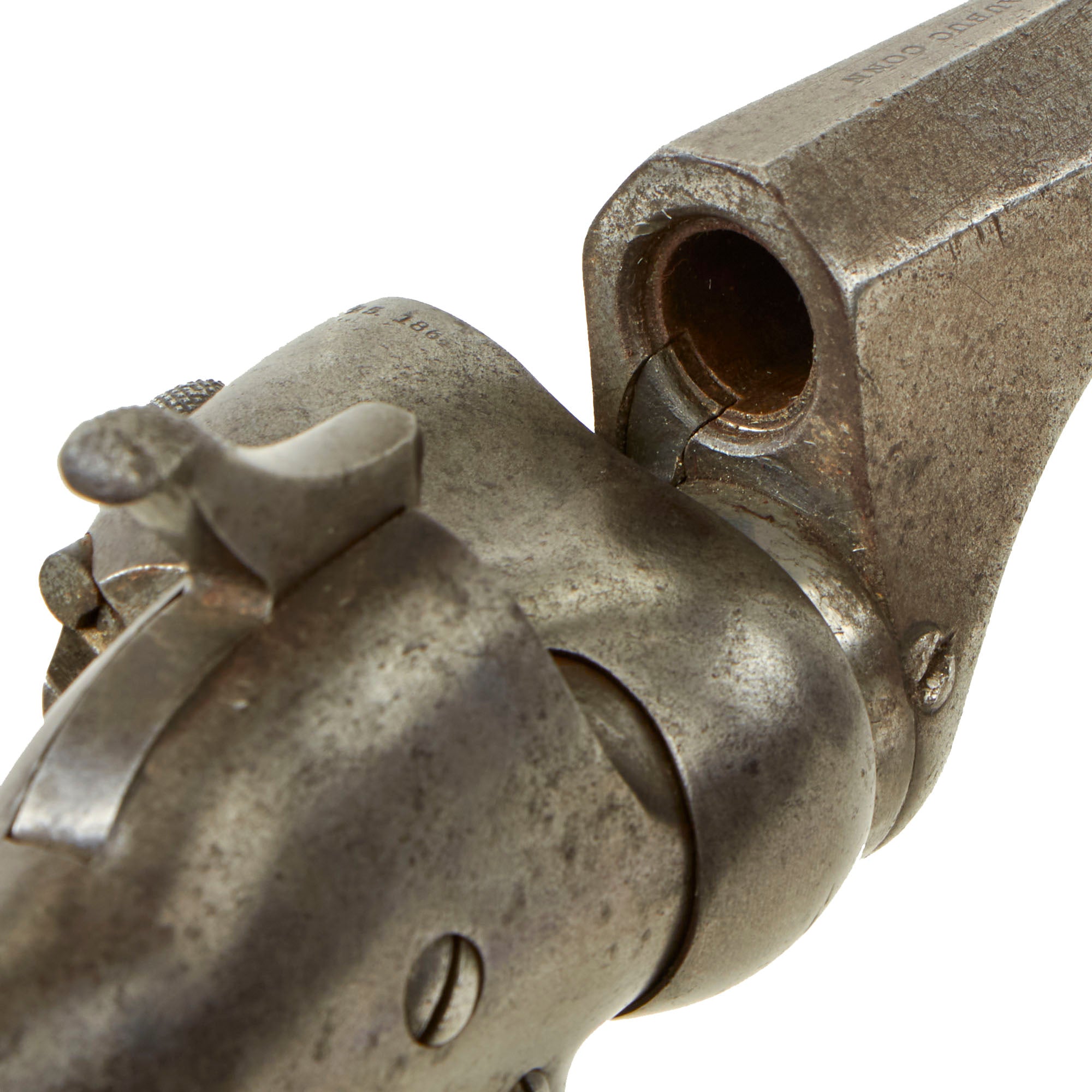This example is in very good condition, with the original blued finish faded to a peppered gray patina due to years of oxidation and subsequent cleaning, giving it a great "frontier worn" look. The bore shows clear lands and grooves, but the finish is somewhat peppered, showing past fouling and past oxidation, now cleaned away. The original "gutta percha" composite grips are in good condition, with strong checkering and a slightly faded brown color on the exterior. They are in great shape, with no cracking or chunks missing, definitely a rarity.