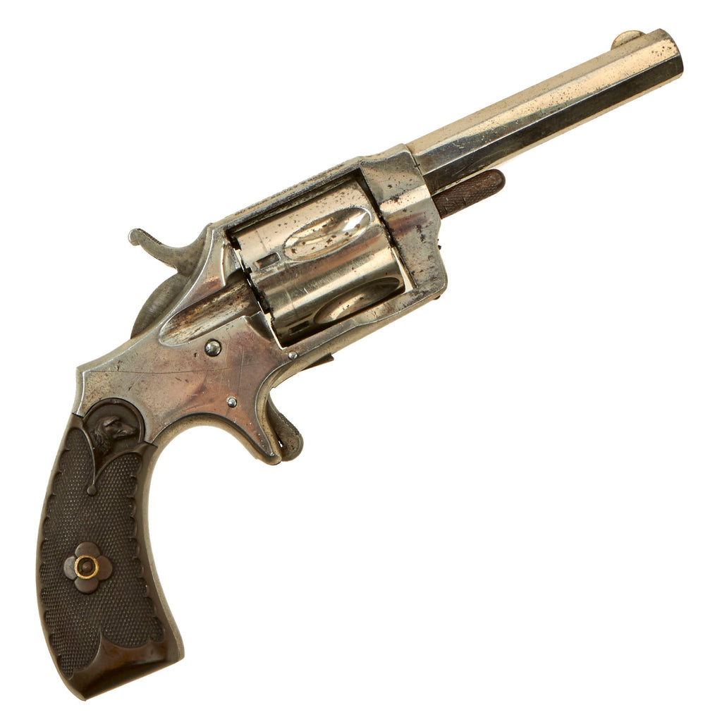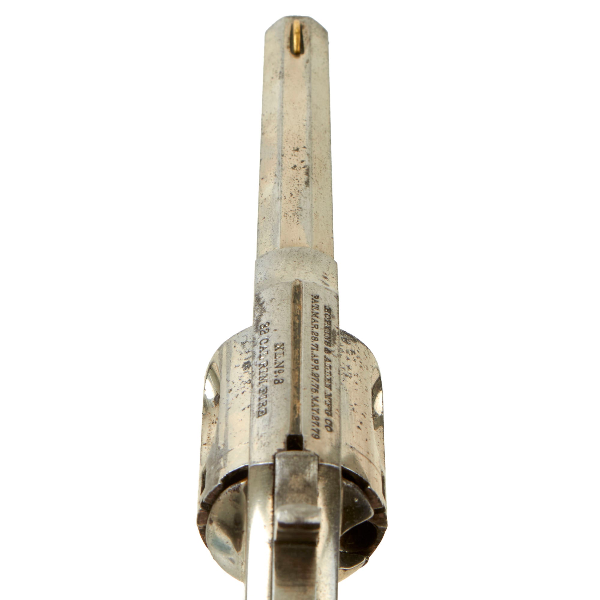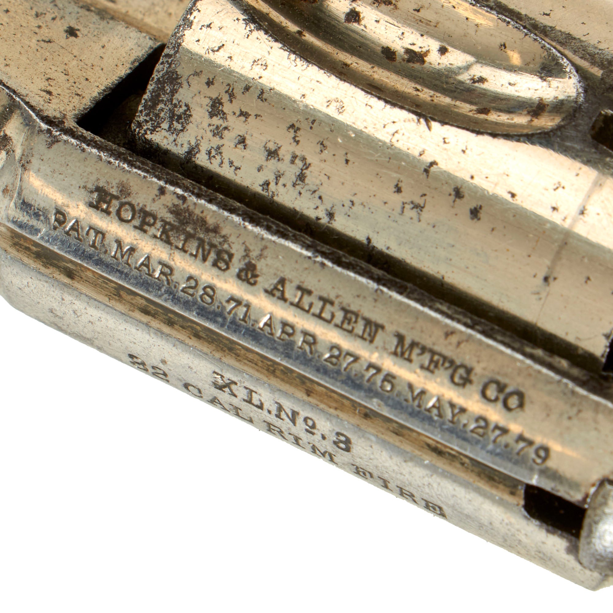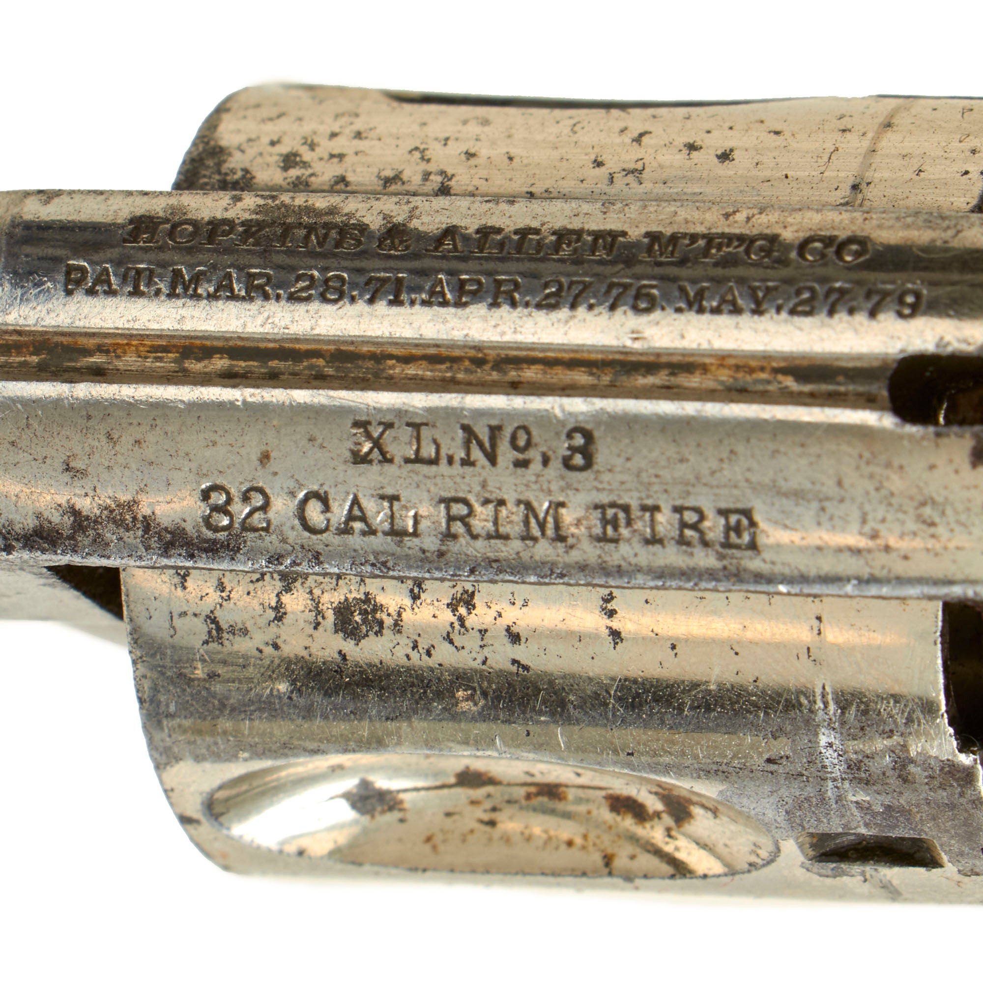 Original Item: Only One Available. This is a very nice nickel plated "XL No.3" .32 Rimfire revolver, made by Hopkins & Allen Mfg. Co. of Norwich, Connecticut. This company had been founded in 1868 as a firearms manufacturer by Charles W. Allen, Charles A. Converse, Horace Briggs, Samuel S. Hopkins and Charles W. Hopkins. In 1874 Converse sold his interest in the company to brothers William and Milan Hulbert, giving the Hulberts 50% of the company's assets and capital. The company became the exclusive maker of Merwin Hulbert revolvers as a result of this and assembly of these revolvers was conducted in a separate area of the plant devoted to M&H revolvers. It is for this reason the company is primarily known in relation the Hulberts, but they produced their own models as well. The company fared well for a while, but after the Hulbert brothers went bankrupt in 1896, Hopkins & Allen followed in 1898.