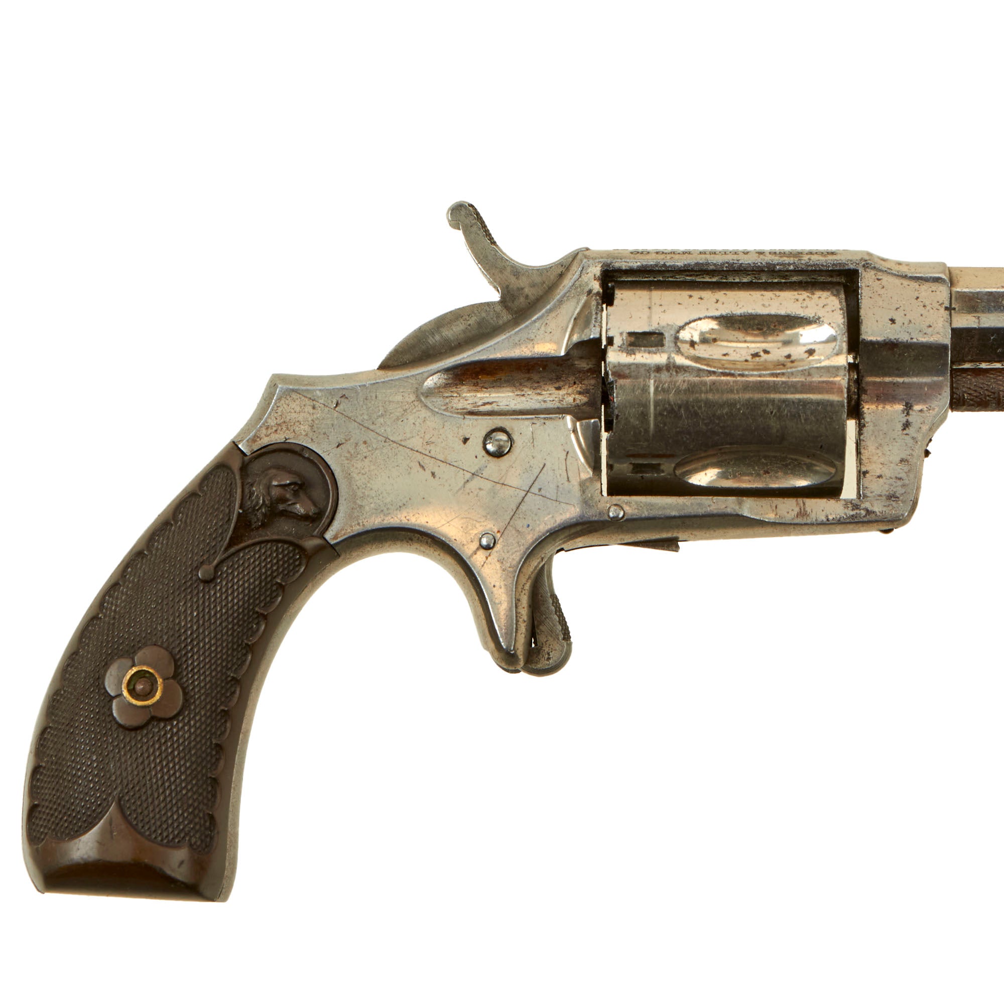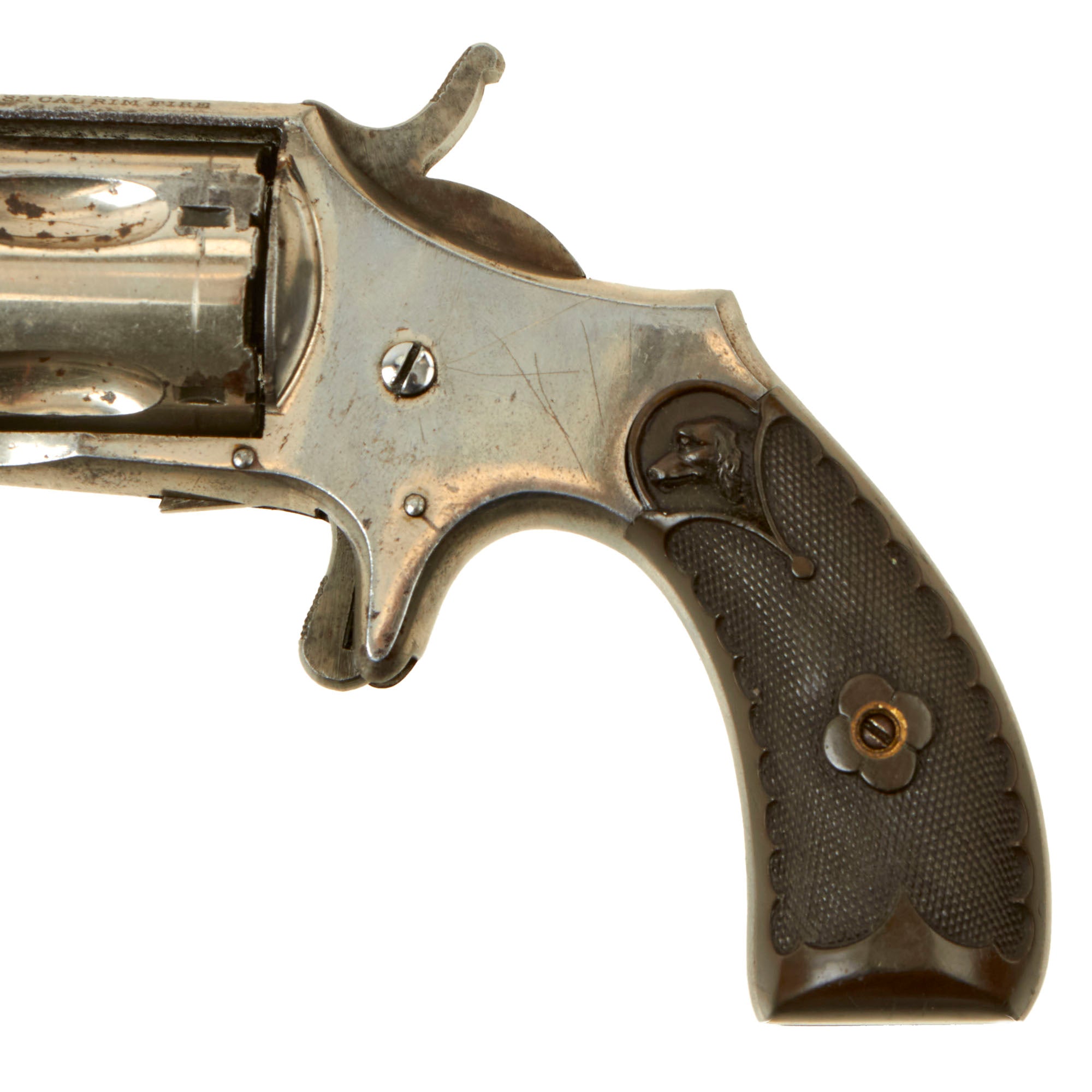 The "XL No.3" is a typical later 19th century style revolver with a "spur trigger" in .32 rimfire, fitted with a 5 shot cylinder. Designed for personal protection, the design was similar to many others of the time, and modeled after the Smith & Wesson early rimfire revolvers. Hopkins & Allen had several other names they made these under, including the highly decorated "Blue Jacket No.2". This example is more utilitarian, like the "Ranger No. 2" in .32, without any of the engraving or similar appointments found on the upmarket examples. It is however still nickel plated, and very attractive. It has a lovely flat bottom grip with lovely factory hard rubber grips, which have great checkering on the sides, and a dog's head at the top of both.