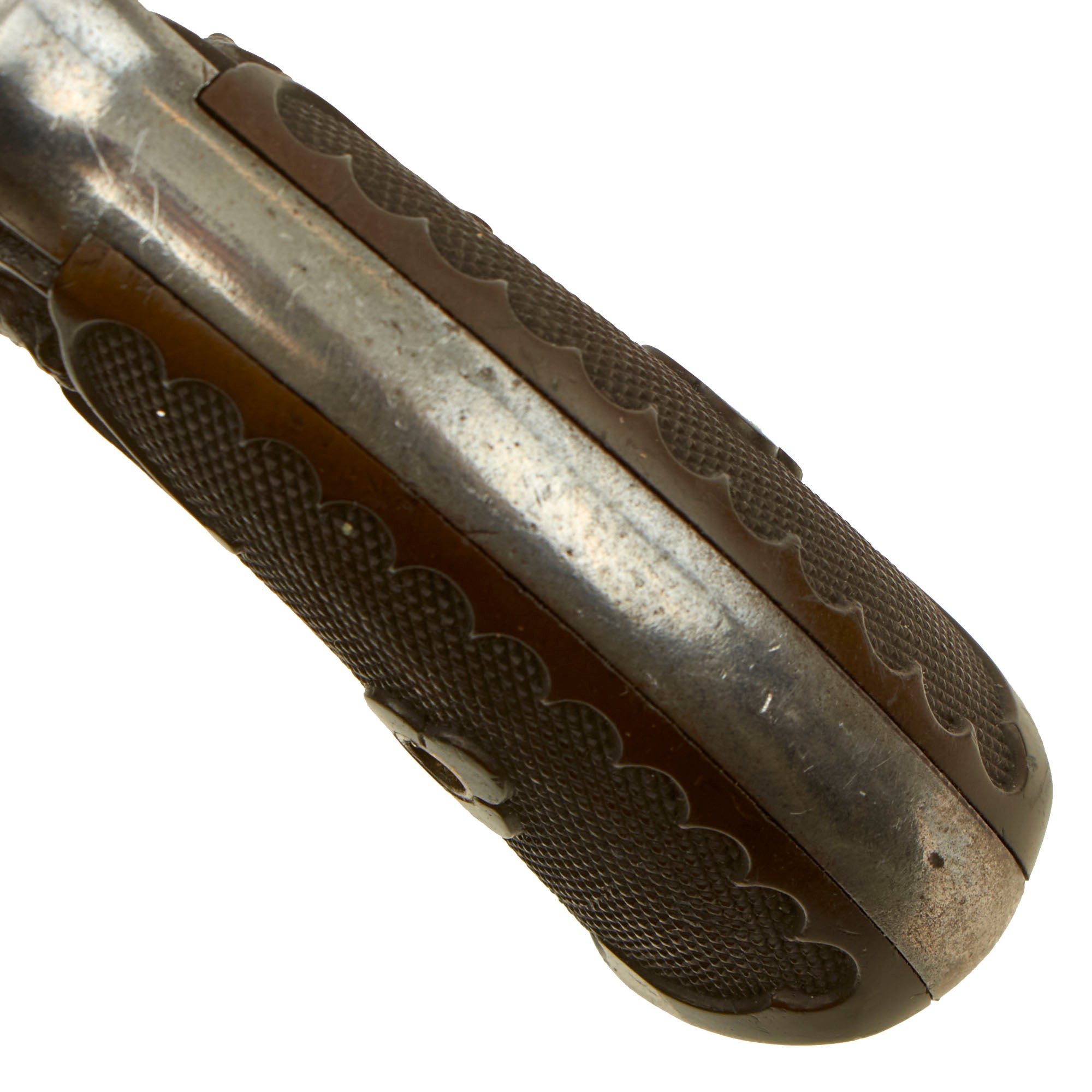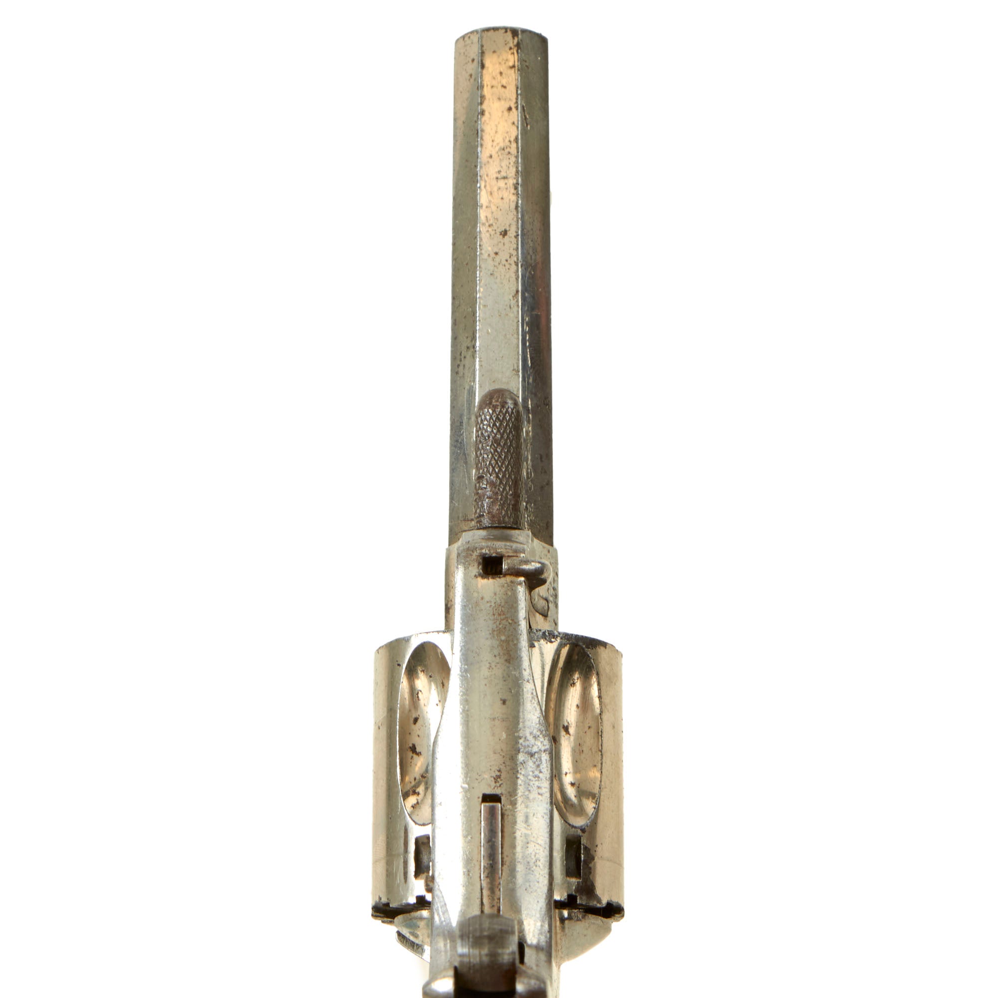 This is really a great looking revolver, which looks to have seen only light use during its life. The nickel plating is still in great shape on the barrel, and frame, with some missing on the cylinder, most likely related to propellant gasses. The grip scales are in great shape, with no major chipping or cracks, and the texture almost completely retained. They have turned a bit brown and color, as black hard rubber does over the years.