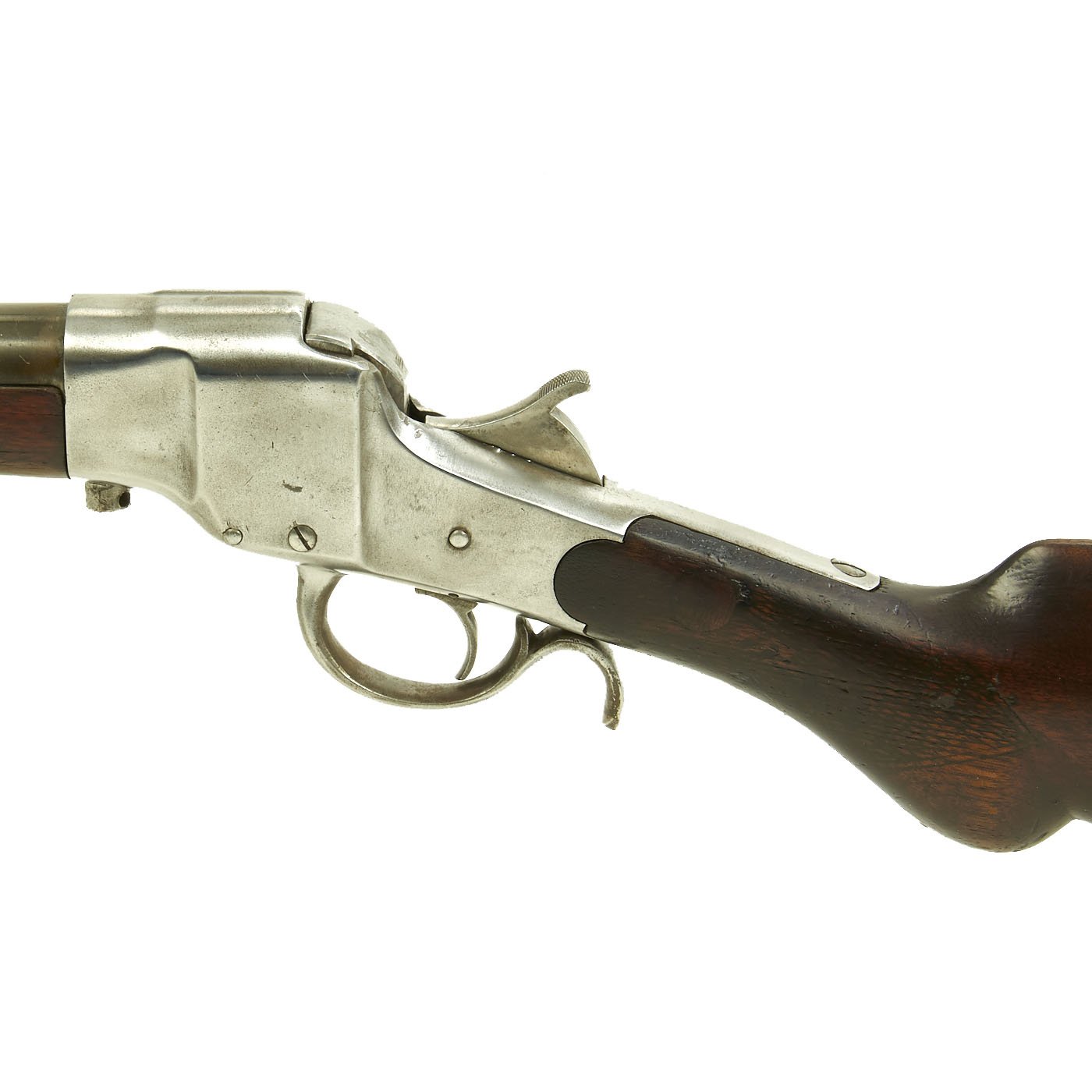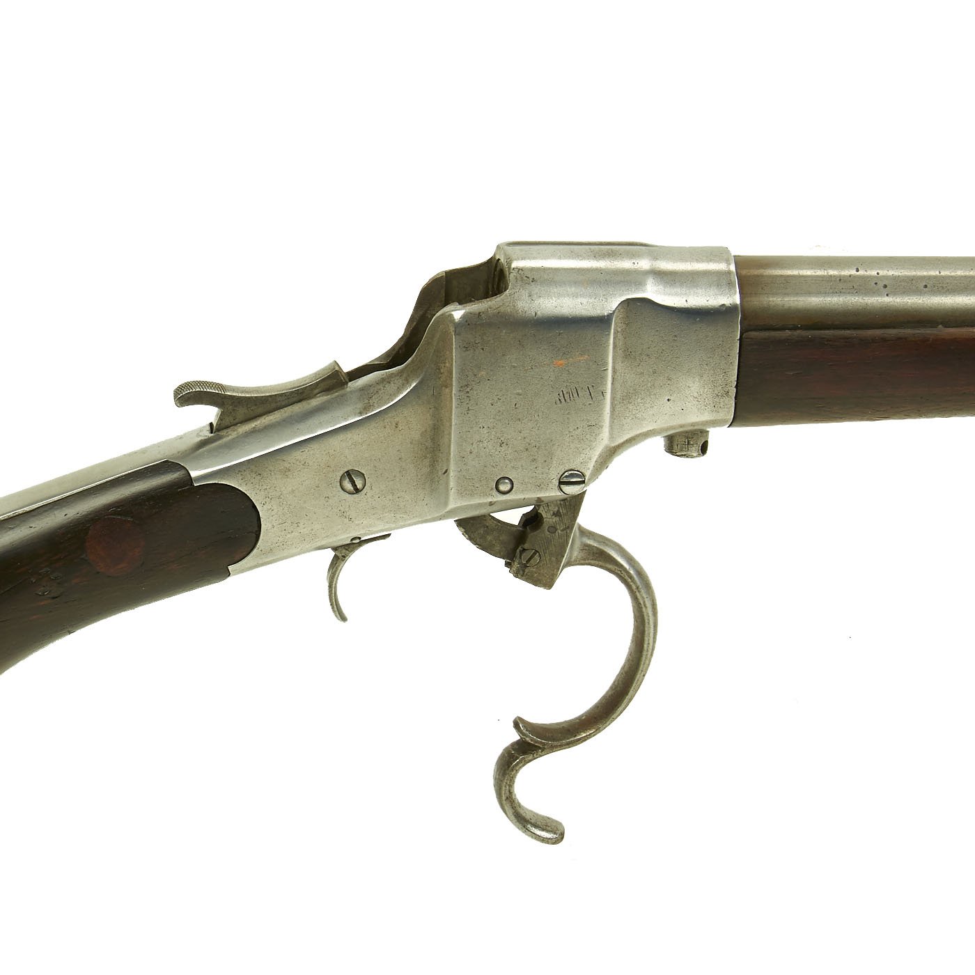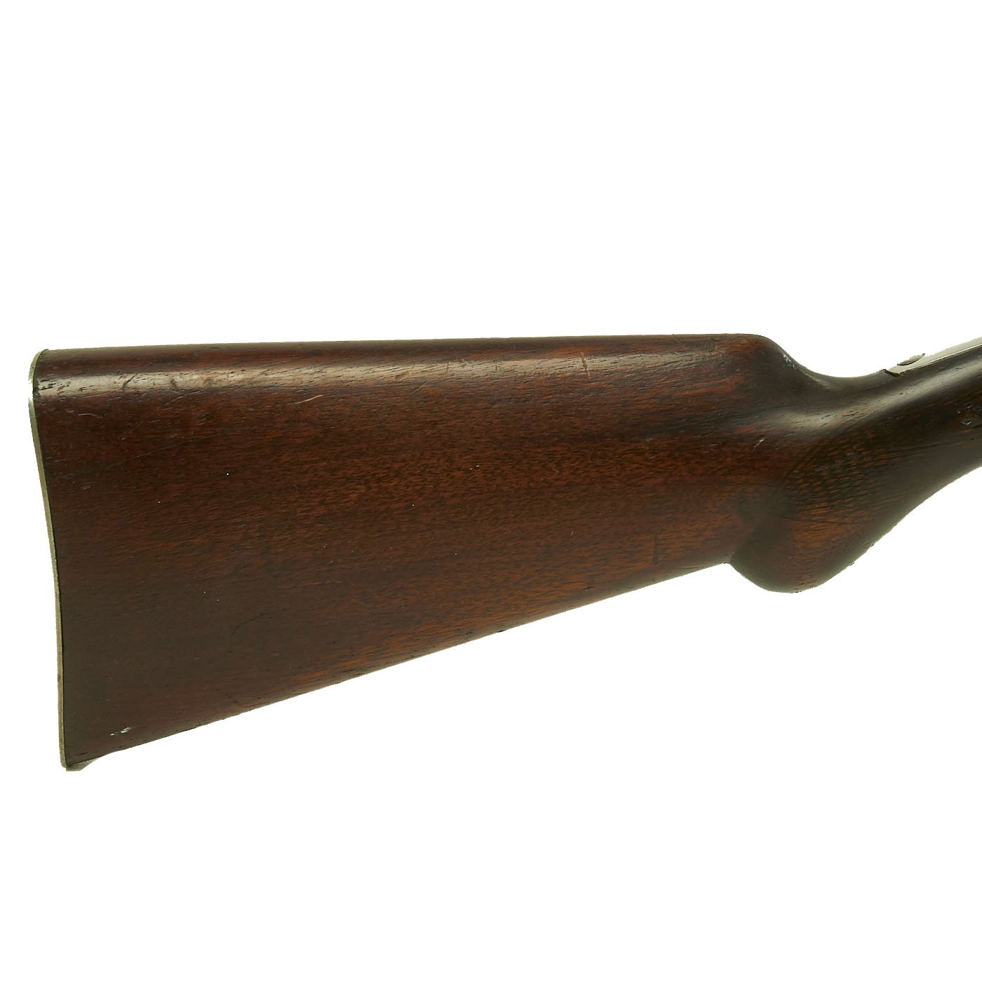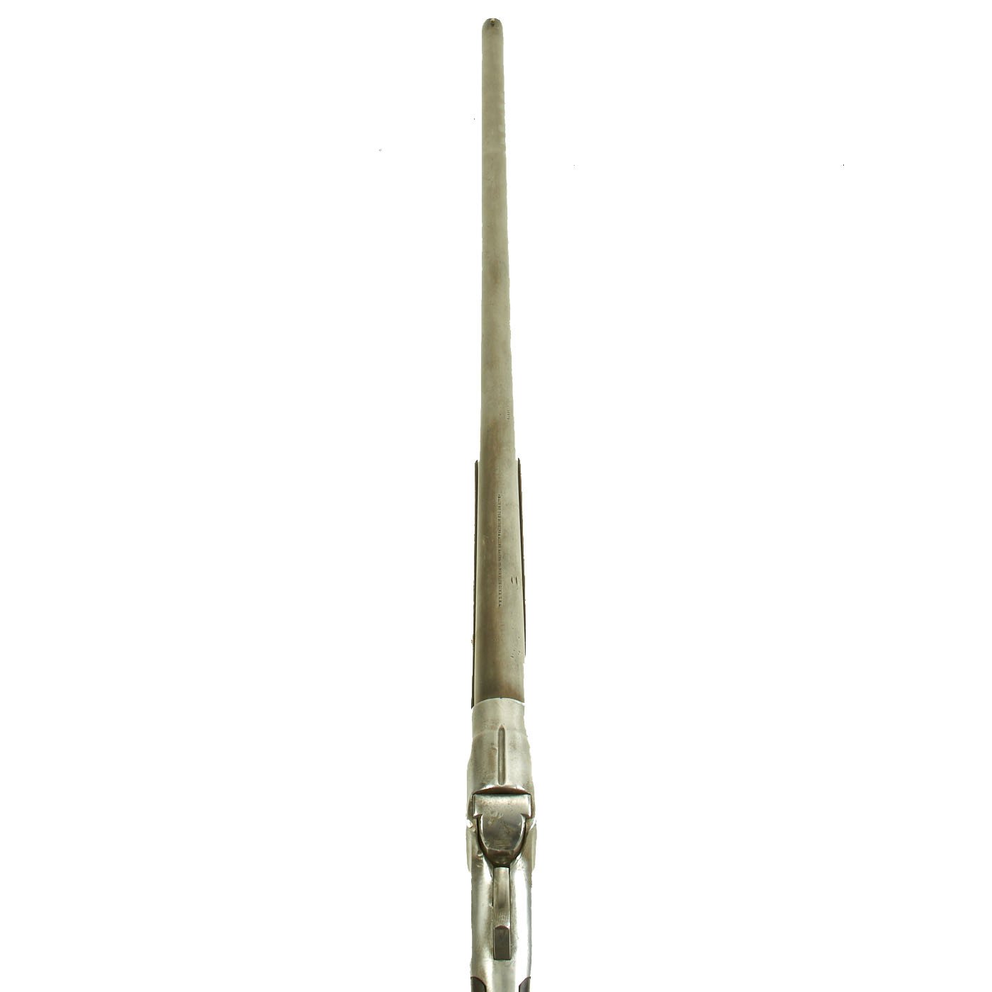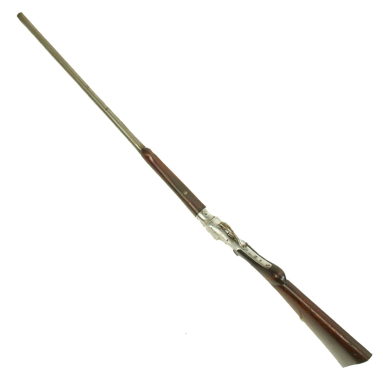 Overall condition is very nice, and this would make a splendid wallhanger. The stocks are lovely, and originally had very nice checkering. They are a bit worn now, and the rear stock has a dowel repair in the wrist. The metalwork has a lovely worn patina. The action cycles correctly, though at some point the firing pin and spring were removed, probably to prevent children from potentially firing it.