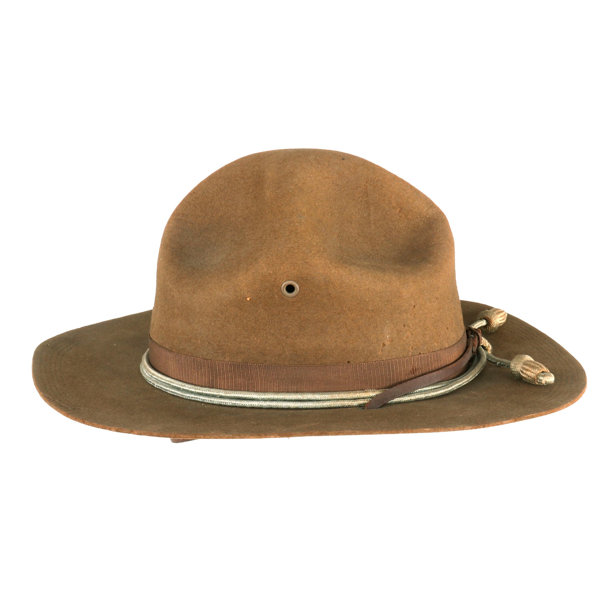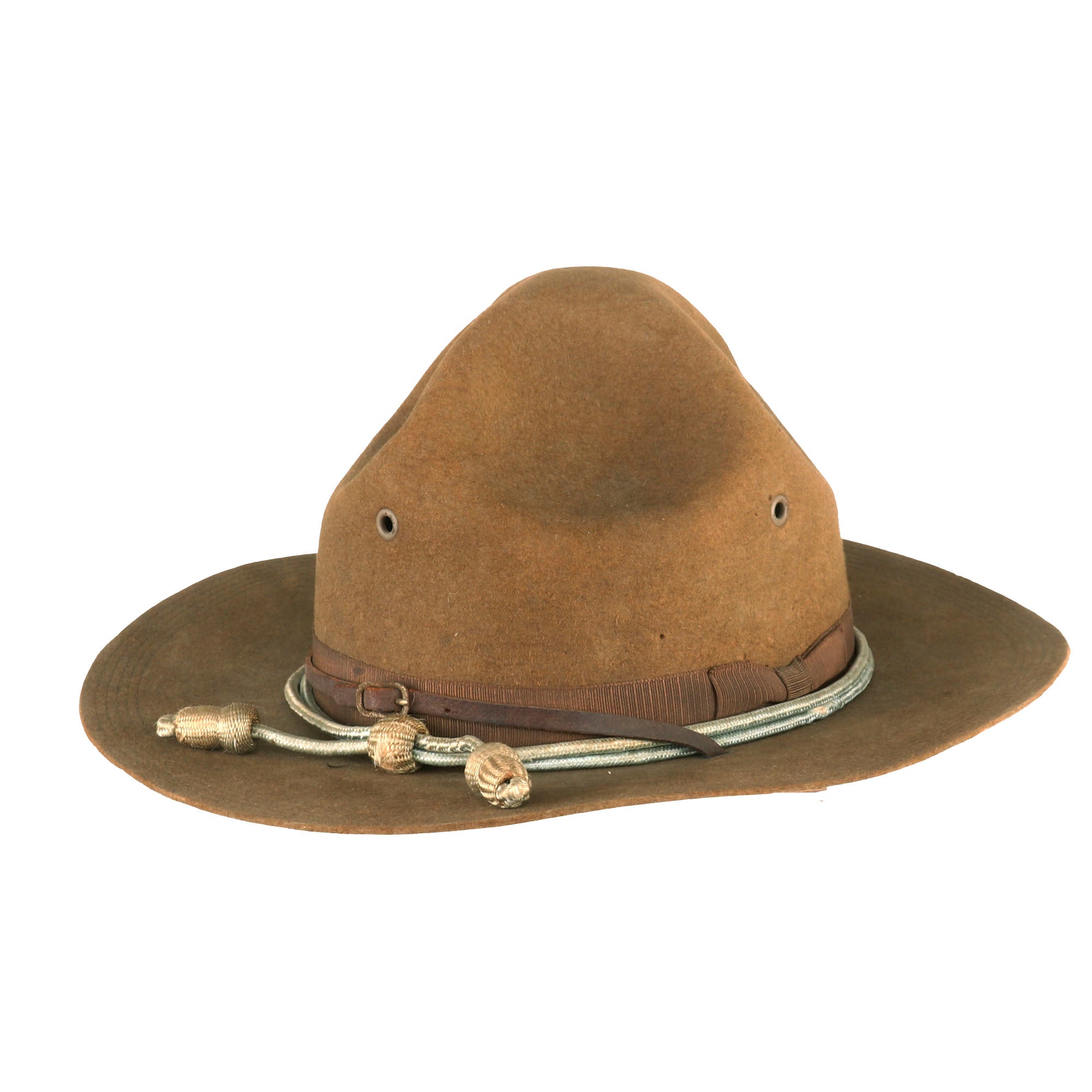 The origins of the hat can be traced to the 1840s when U.S. Army mounted troops posted to the far-west sometimes wore wide-brimmed civilian hats, which were more practical than the regulation shakos and forage caps then issued. The crease was influenced by the designs of the sombreros worn by the Mexican Vaqueros. The name started to be used after the 1872–1876 regulations, which introduced a black felt hat—which could be drab after 1883—for fatigue use derived from the types popularized during the American Civil War. Some were worn with campaign cords, mainly as a form of decoration.