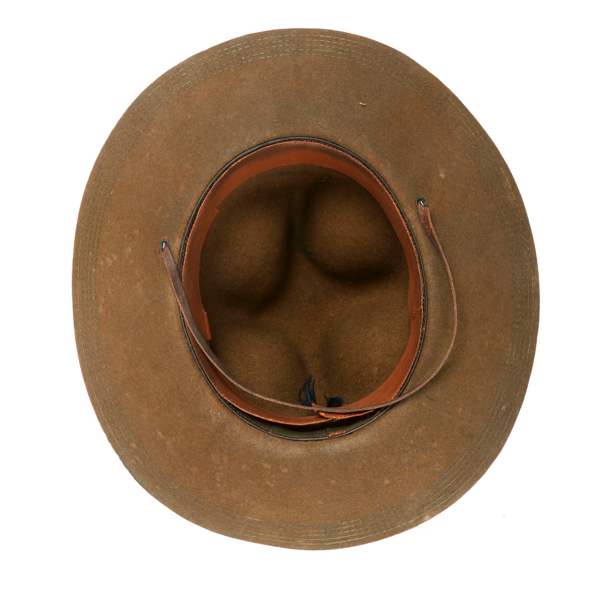 This hat has its original infantry cord and chinstrap, which is still very pliable with a fully functioning buckle. There is light mothing across the top and brim of the hat with some heavy mothing under the brim as shown. The sweatband is partially coming off of its stitching from heavy use but is still attached to the interior. Size written on interior (US 7 1/8)