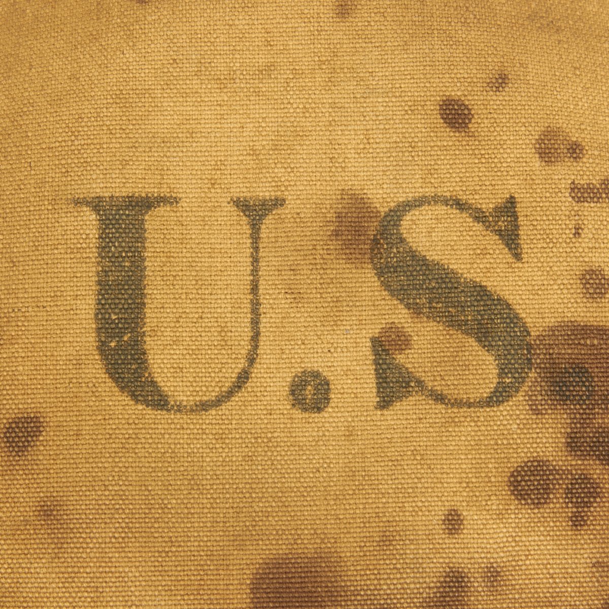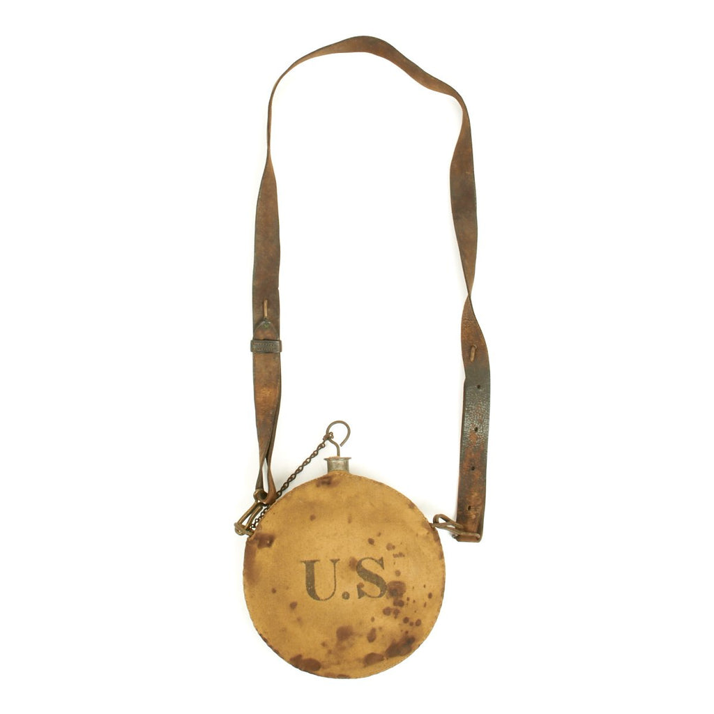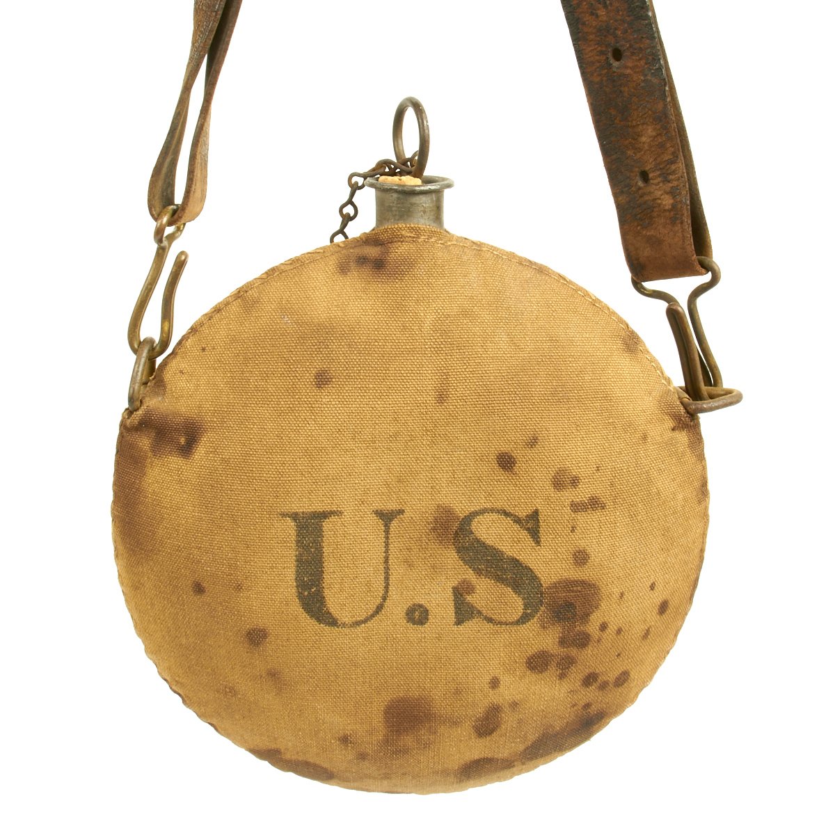 Original Item: Only One Available. US M1878 Canteen with a tan canvas cover with a very clear U.S. stencil on the front, in very good condition. There is a marking on the neck of the canteen, which reads A. JEV, but we cannot see the entire marking due to the tightness of the cover.