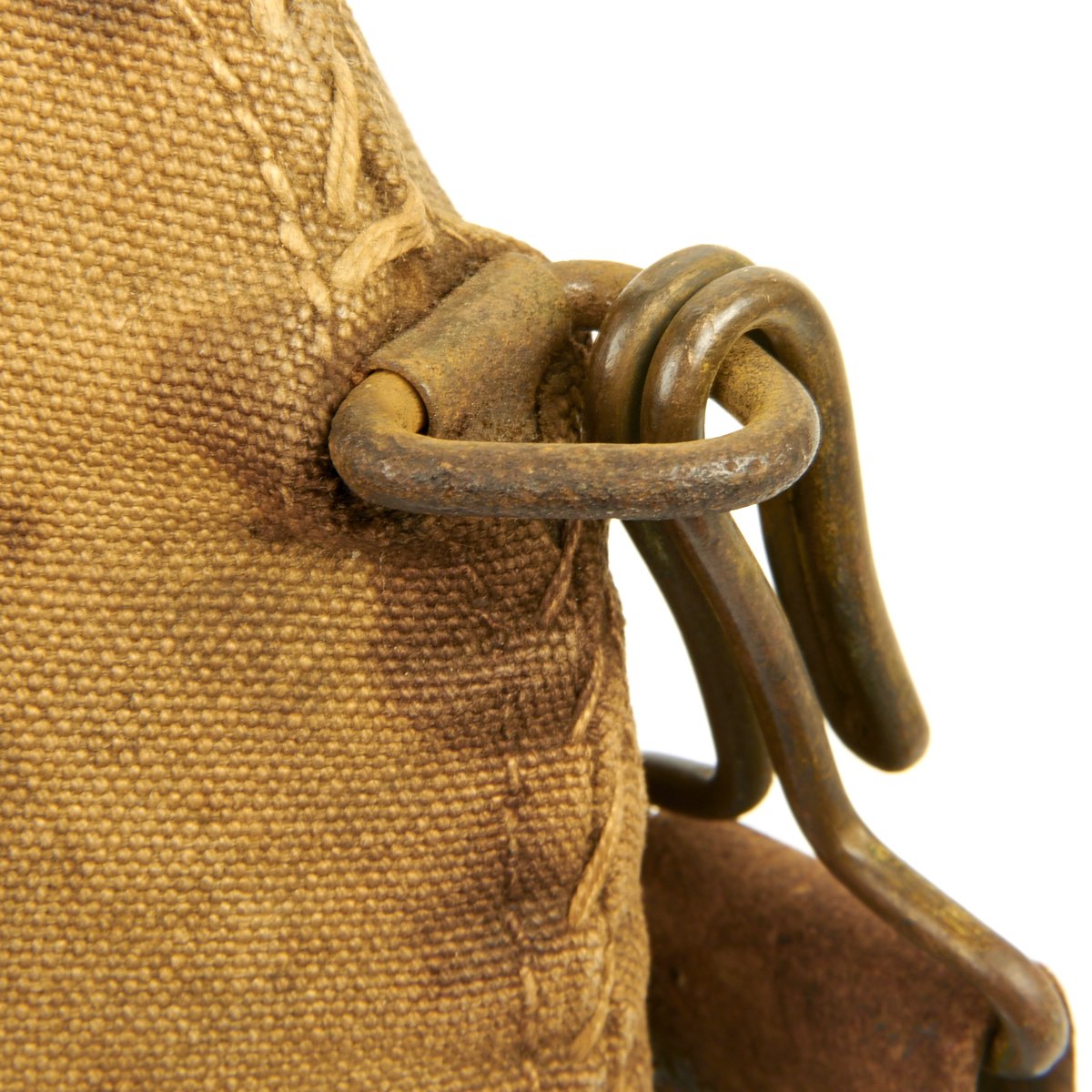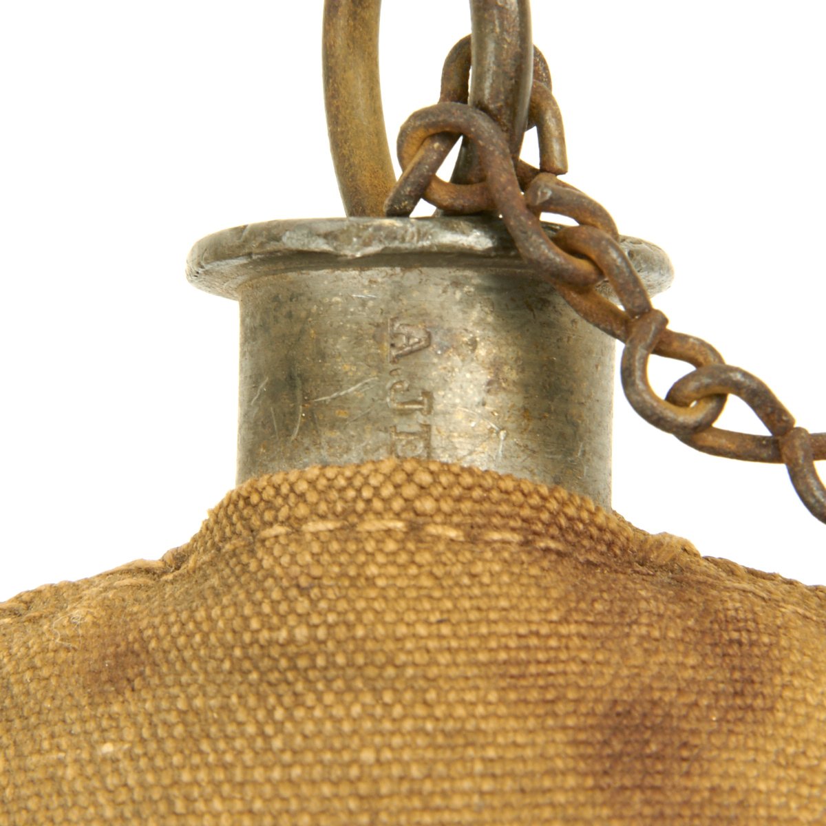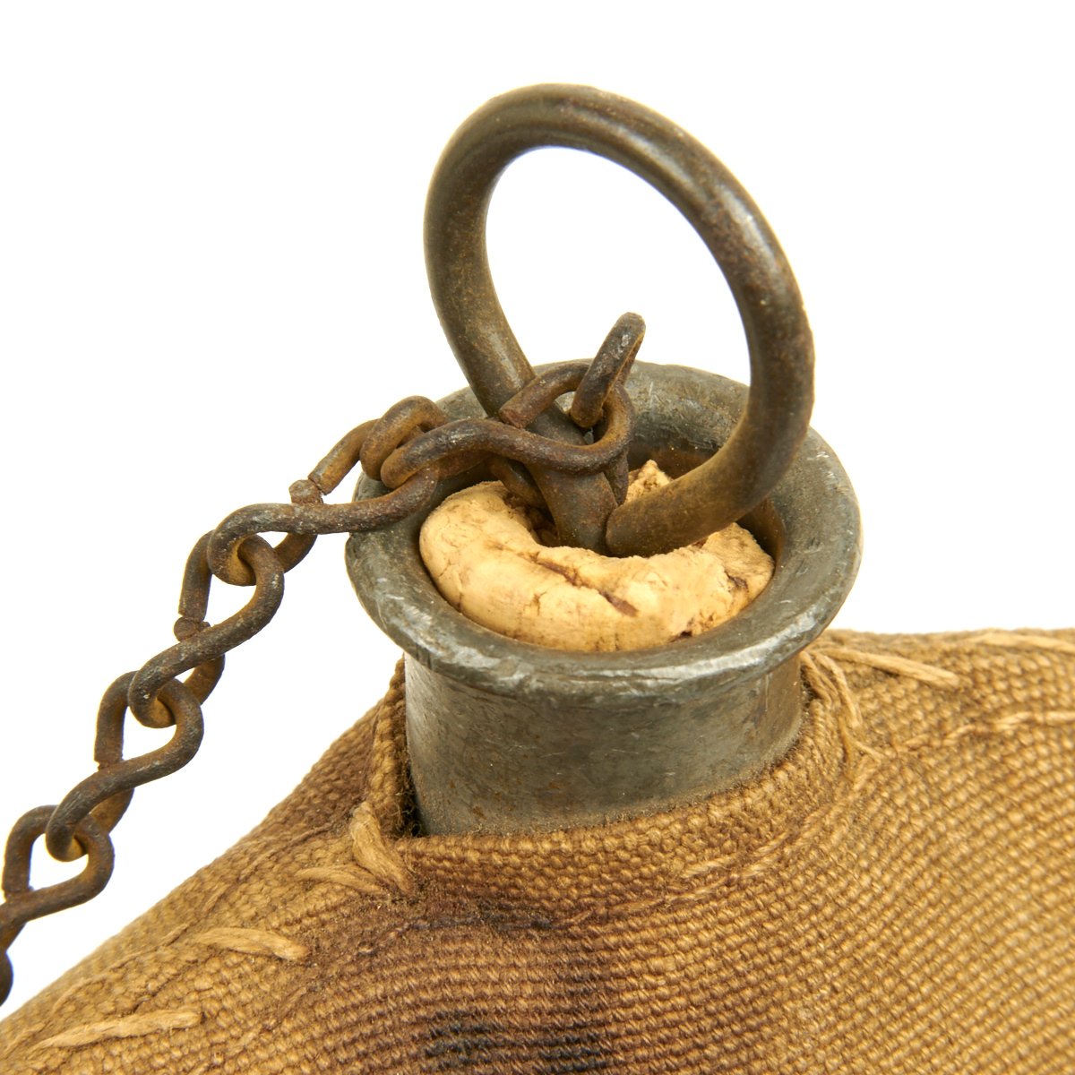 Original Item: Only One Available. US M1878 Canteen with a tan canvas cover with a very clear U.S. stencil on the front, in very good condition. There is a marking on the neck of the canteen, which reads A. JEV, but we cannot see the entire marking due to the tightness of the cover.