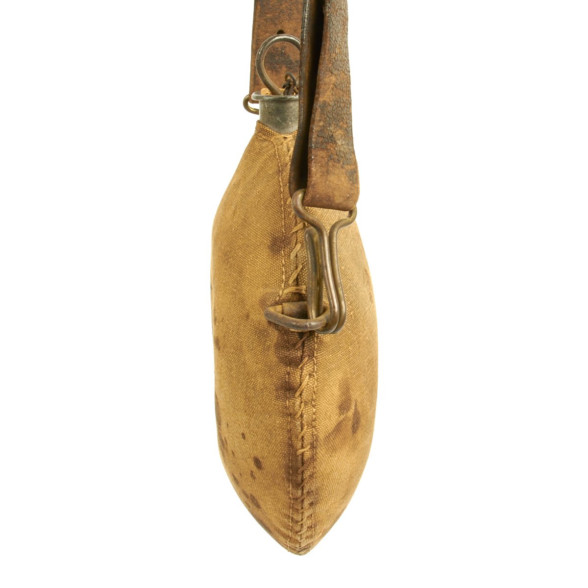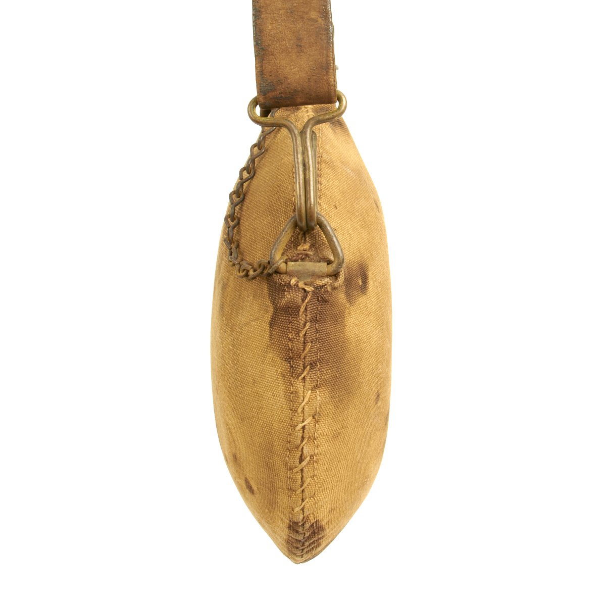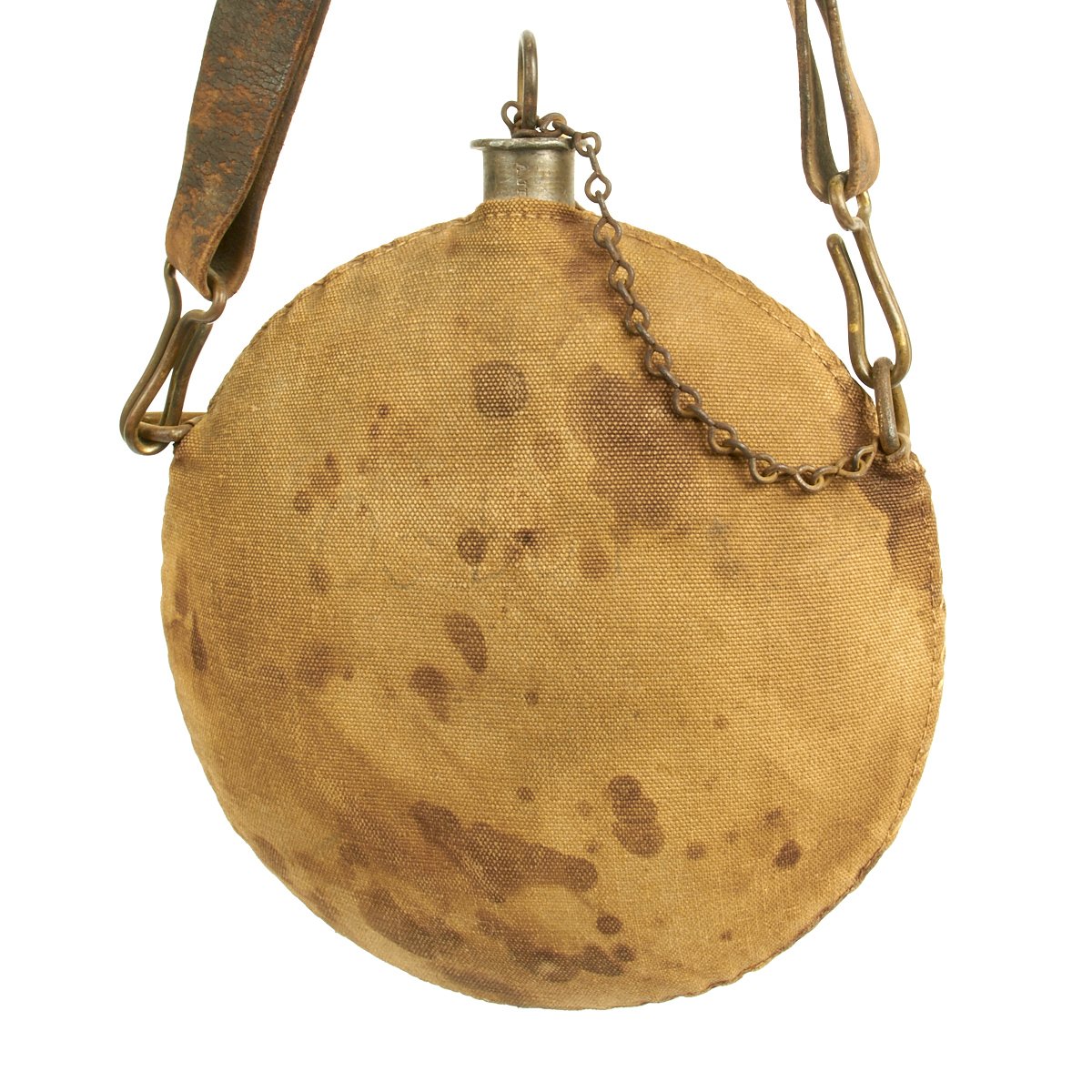 The canteen is complete with its original cork stopper secured to one of the triangular loops found on each side of the body by a chain. The cork itself is partly missing, but could easily be replaced. It also has the proper pattern leather shoulder strap, of the later adjustable style.