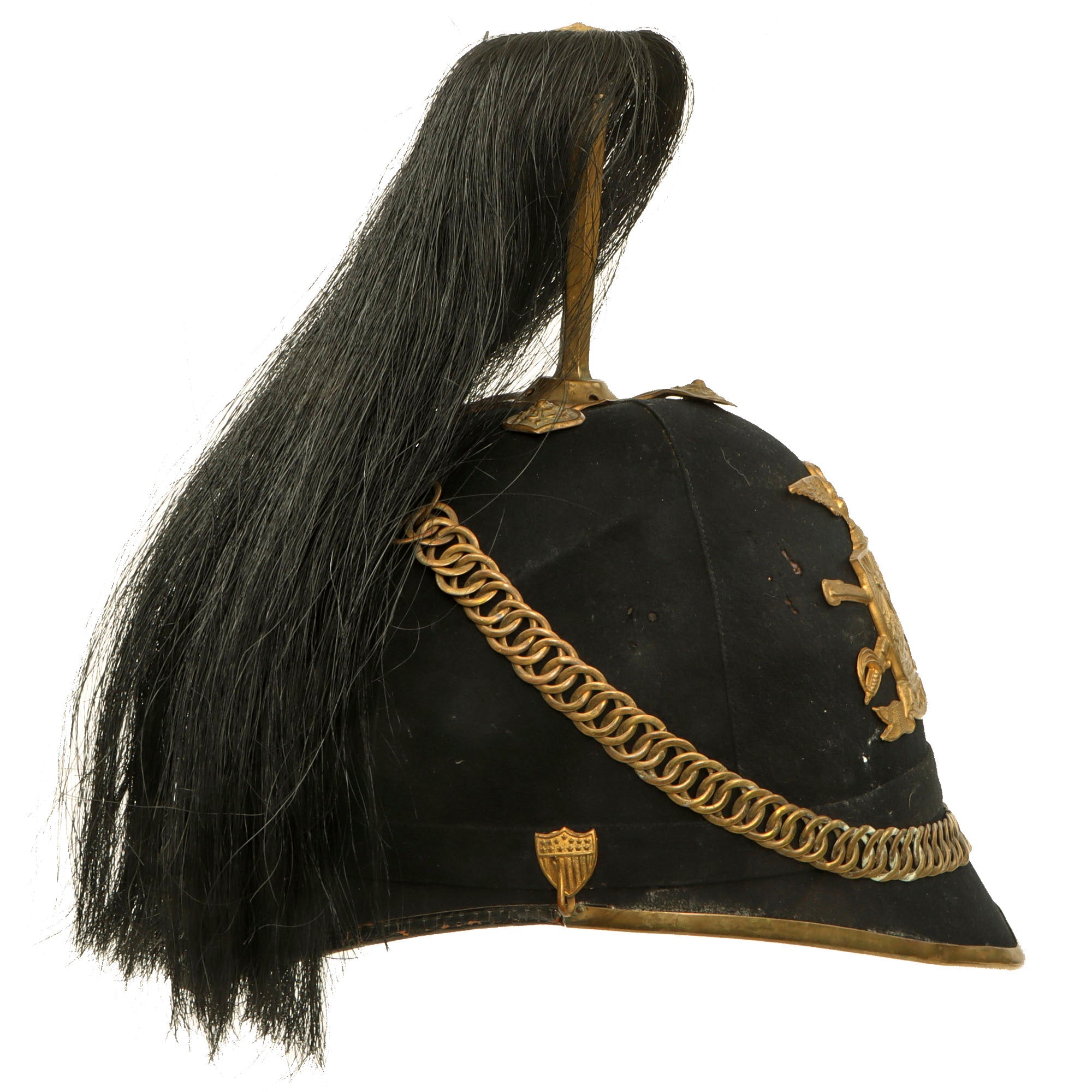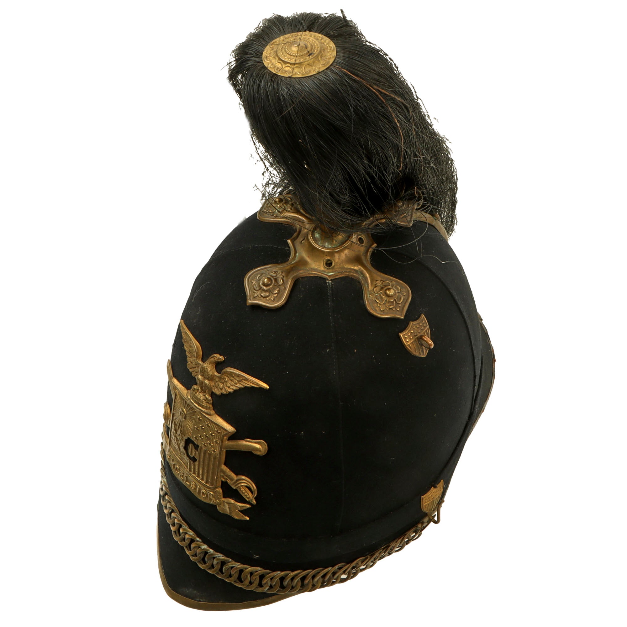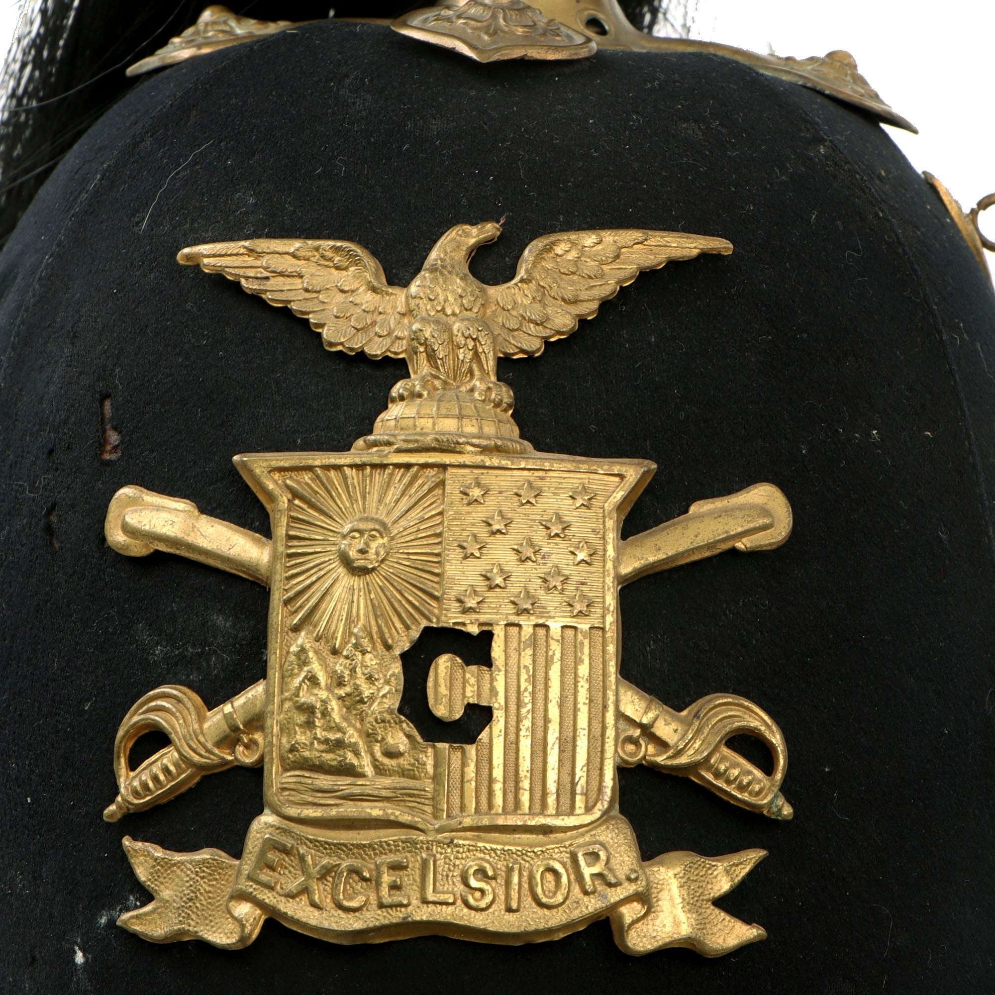 The Helmet plate displays the New York Guard Seal helmet plate; an Eagle perched atop a shield, wings spread, the letter “C” in front and a banner below marked “Excelsior”. The plate is in excellent condition with the expected verdigris. Unfortunately there is no regimental number present, nor do we think there ever was one. Comes complete with its original cruciform base and black plume, used by all branches. The overall condition of the helmet is fantastic given its age. The original chinstrap chains are retained and scarce, with some denting as shown. There is no major damage to the inside or outside. The side bales are American flag shields, not a branch insignia.