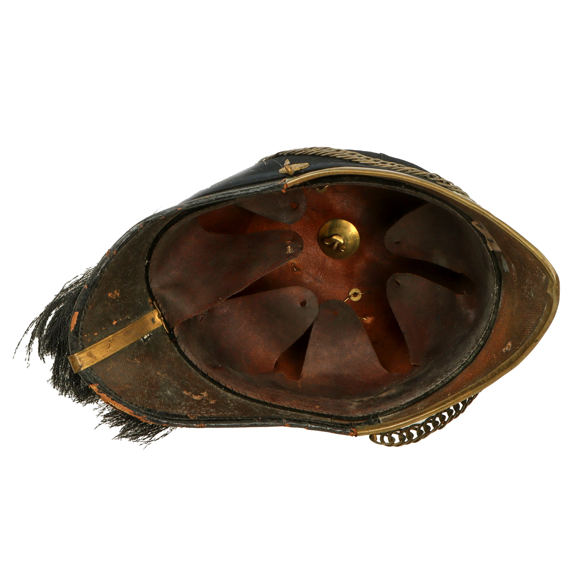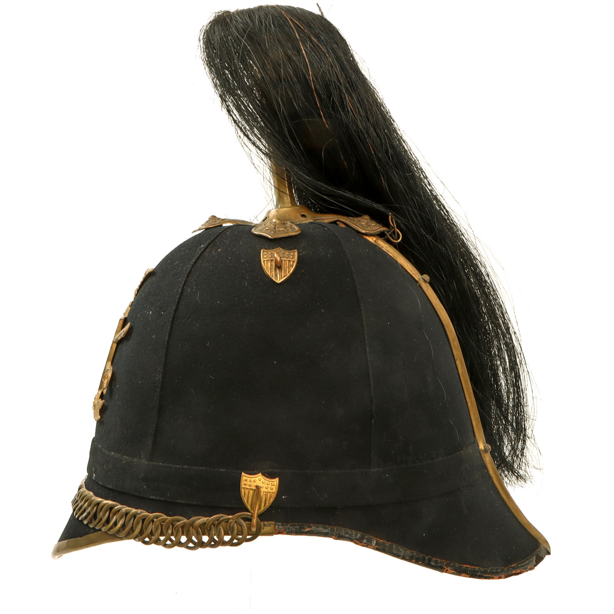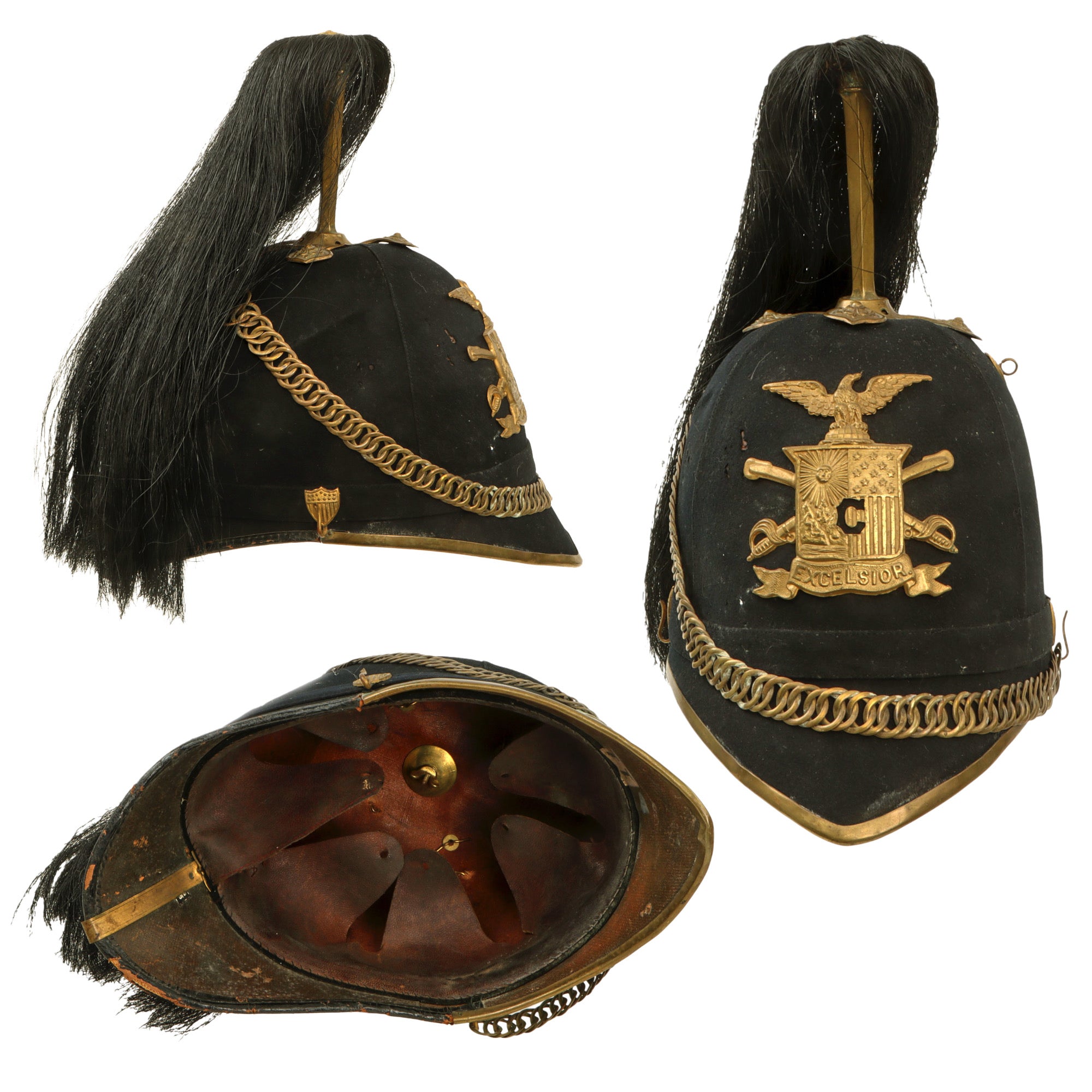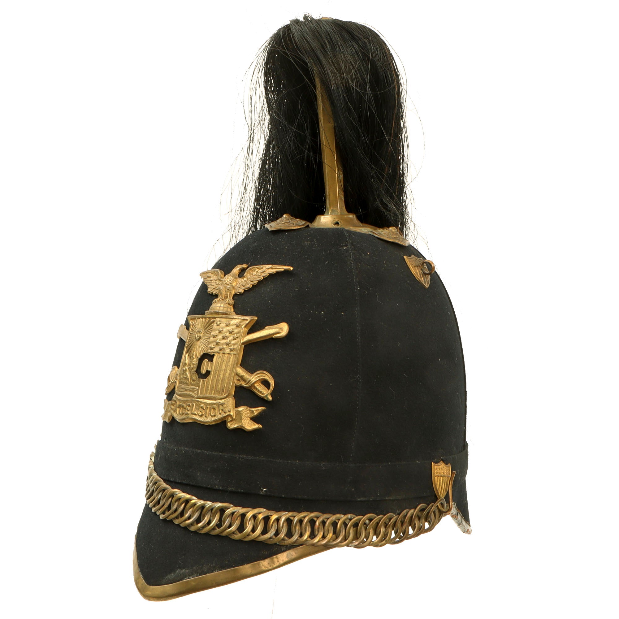 The Helmet plate displays the New York Guard Seal helmet plate; an Eagle perched atop a shield, wings spread, the letter “C” in front and a banner below marked “Excelsior”. The plate is in excellent condition with the expected verdigris. Unfortunately there is no regimental number present, nor do we think there ever was one. Comes complete with its original cruciform base and black plume, used by all branches. The overall condition of the helmet is fantastic given its age. The original chinstrap chains are retained and scarce, with some denting as shown. There is no major damage to the inside or outside. The side bales are American flag shields, not a branch insignia.