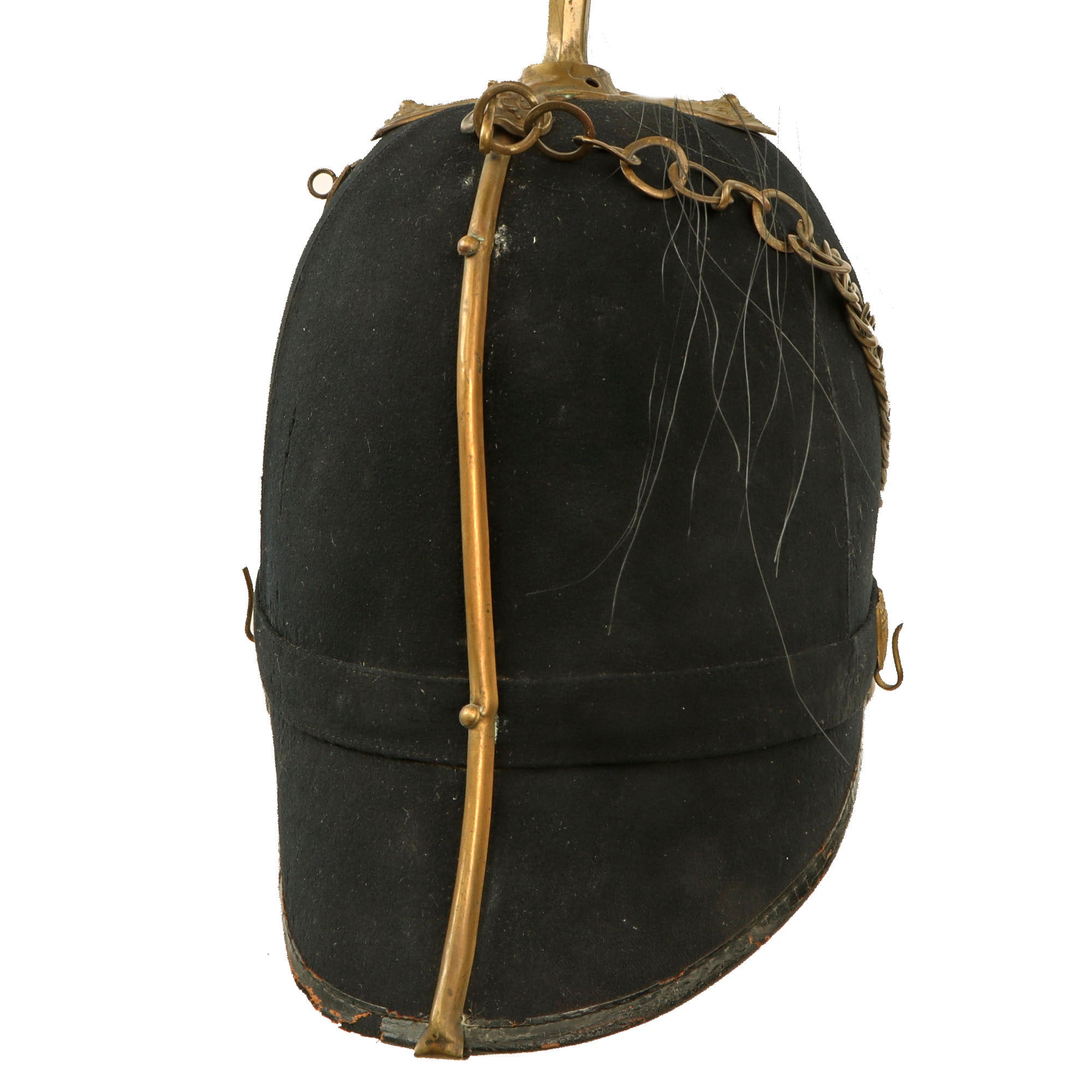 This helmet dates to the 1880s, and it really is quite striking. This is not the type of helmet that was worn in the field, but instead one intended for use with the "dress" uniform for ceremonial occasions. It is beautifully made from cork covered with brown fabric, but there is no maker mark we can find, only the stamped number 11, which may denote a size. The model is actually the M1872 given the shape and pointed visors.