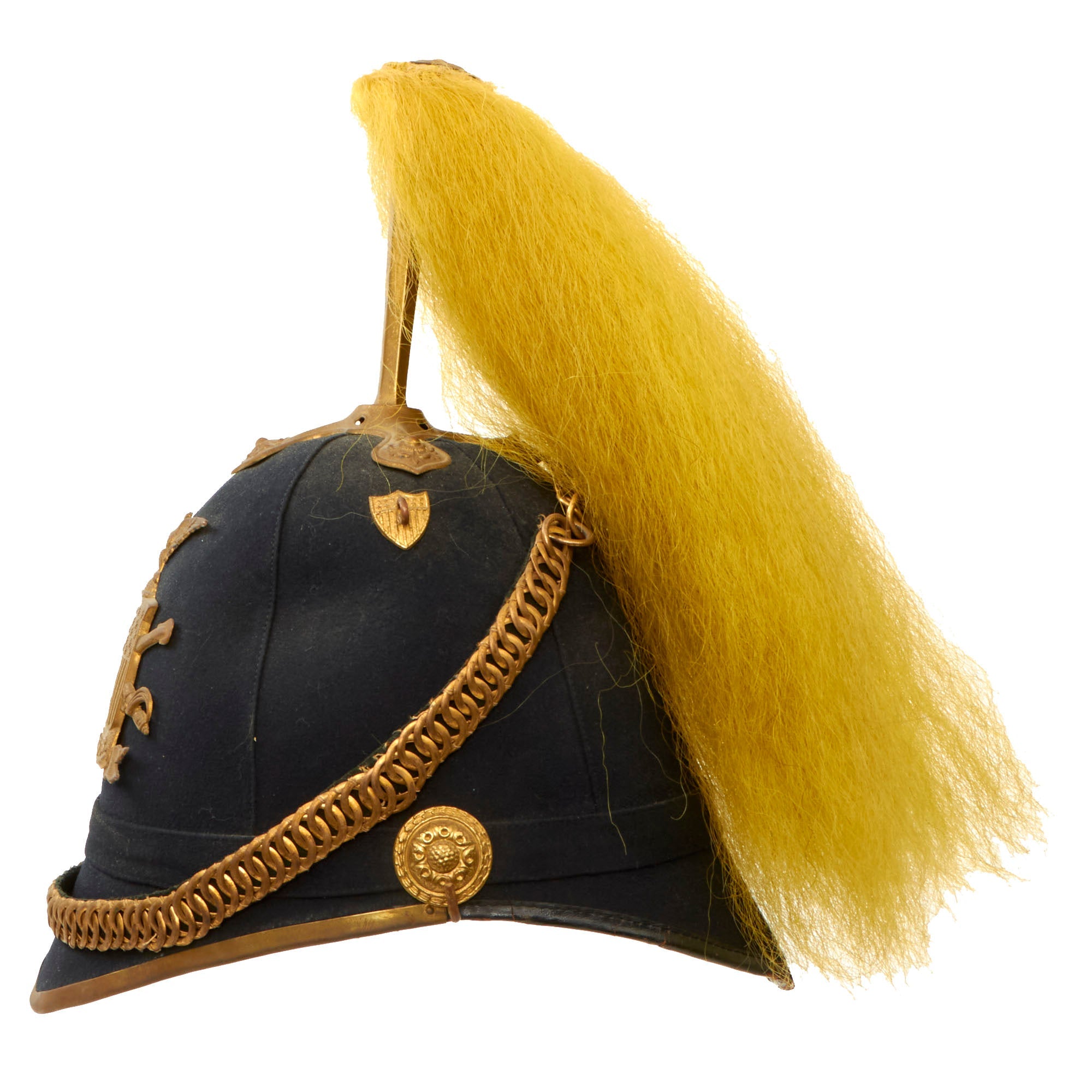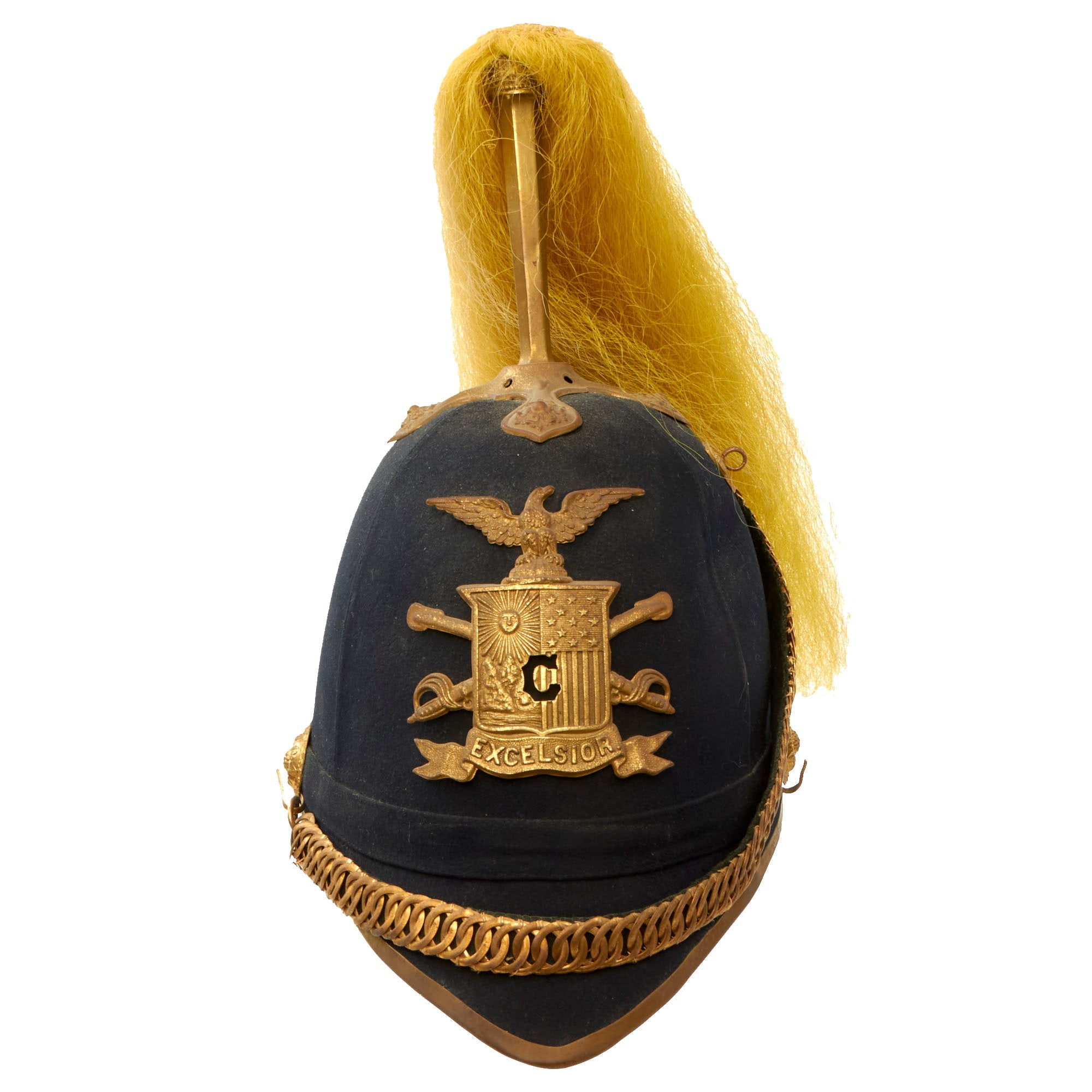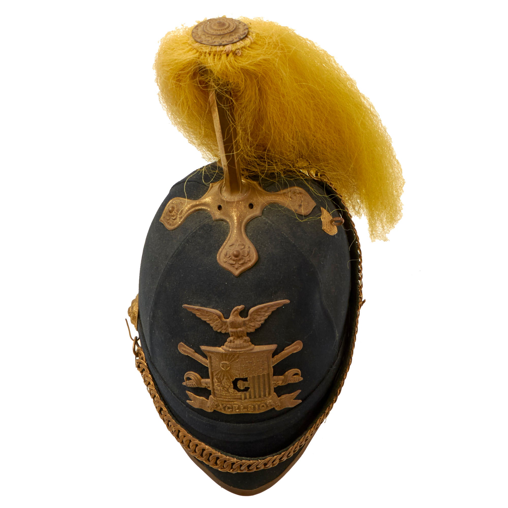 Original Item: One Only Available. Much like our European cousins in the 1880s, the U.S. Army started to adopt spiked pith helmets, often in white, with all brass mounts and occasionally plumes. These saw active service in the Spanish American War of 1898 especially in the tropical climate in Cuba. While often referred to as "pith helmets" in the broad sense, it was made from cork, like many European variants, such as the Wolseley pattern used by the British.This helmet dates to the 1880s, and it really is quite striking. This is not the type of helmet that was worn in the field, but instead one intended for use with the "dress" uniform for ceremonial occasions. It is beautifully made from cork covered with brown fabric, with a partial makers stamp inside around the spike fixture for RAYMOND & WHITLOCK.The Helmet plate displays the New York Guard Seal helmet plate; an Eagle perched atop a shield, wings spread, the letter “C” in front and a banner below marked “Excelsior”. The plate is in excellent condition with the expected verdigris. Unfortunately there is no regimental number present, nor do we think there ever was one. Comes complete with its original cruciform base and yellow plume for Cavalry. The overall condition of the helmet is fantastic given its age. The original chinstrap chains are retained and scarce. There is no major damage to the inside or outside.Very nice, great condition for age, ready to display.The Model 1881 Dress Helmet was worn only for full dress events. The helmet evolved from the earlier Model 1872 helmets worn only by the Cavalry, Light Artillery and Signal Corps. In 1881, the new helmet design was adopted for use by all enlisted troops and for officers of the Infantry, Cavalry and Artillery. (General and Staff officers continued to wear a chapeau de bra as they had for many years…) For enlisted troops, the helmet was made of black felt, while officers could buy a helmet of black cloth over a cork or felt base. Atop the helmet of all mounted troops is a brass plume holder, resting on a brass base having an oak leaf and acorns motif, while the plume holder itself is engraved with an eagle and star. For enlisted men, a thin rod with two circular plates at the top clamps the base of the horsehair plume and rests atop the plume holder, while officers had a similar device to let the plume appear like it was fountain sprung from their heads. The plume’s color depended on the branch of service the soldier was in: white for mounted Infantry officers, red for Artillery and yellow for Cavalry.The Arms of the United States forms the large insignia on the helmet’s face. Again, depending on the branch of service, one of four different eagle designs formed the insignia. Enlisted troops in branches other than the “Big Three” wore the general services eagle, while dismounted officers from another corps wore either an Infantry or an Artillery plate. For all Infantry, Artillery and Cavalry personnel, a small white metal numeral of the assigned regiment is affixed by small wires to the shield of the eagle plate. Other corps had a small device to signify their assigned branch. For all mounted troops, the helmet cord is hung on the helmet from two devices. For enlisted troops, the cord’s color matched that of their branch, while all officers wore a two-piece cord of braided, gilt thread. The cord’s braided bands drape over the front and back of the helmet. The remainder then falls to the left shoulder and gets secured by a slide, goes around both sides of the head and gets secured by another slide, then around both sides of the right arm and gets secured by a third slide, then the two lozenge ends are secured to a button on the frockcoat and simply dangle.For all officers, a brass chain chinstrap hangs from two corps-faced buttons with hooks on them. All dismounted officers of Infantry and Heavy Artillery wore the same helmet and base plate, but with a plain brass spike on top. Those officers also wore the brass chain chinstrap. It was draped across the helmet’s face, from a shield hook on the helmet’s upper right back to the left helmet button, when not being used. Enlisted troops had a simple leather band for a chin strap, with two corps-faced buttons on the sides.